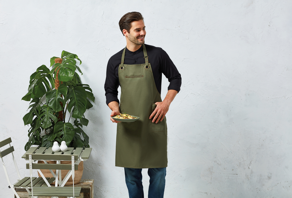 65% poliéster/35% algodão. Poliéster reciclado a partir de plástico pós-consumo e algodão proveniente do desenvolvimento sustentável. Ilhós e rebites. Pespontos em contraste. Bolsos laterais e bolso central com fecho. Fivela ajustável em latão envelhecido na alça do pescoço.