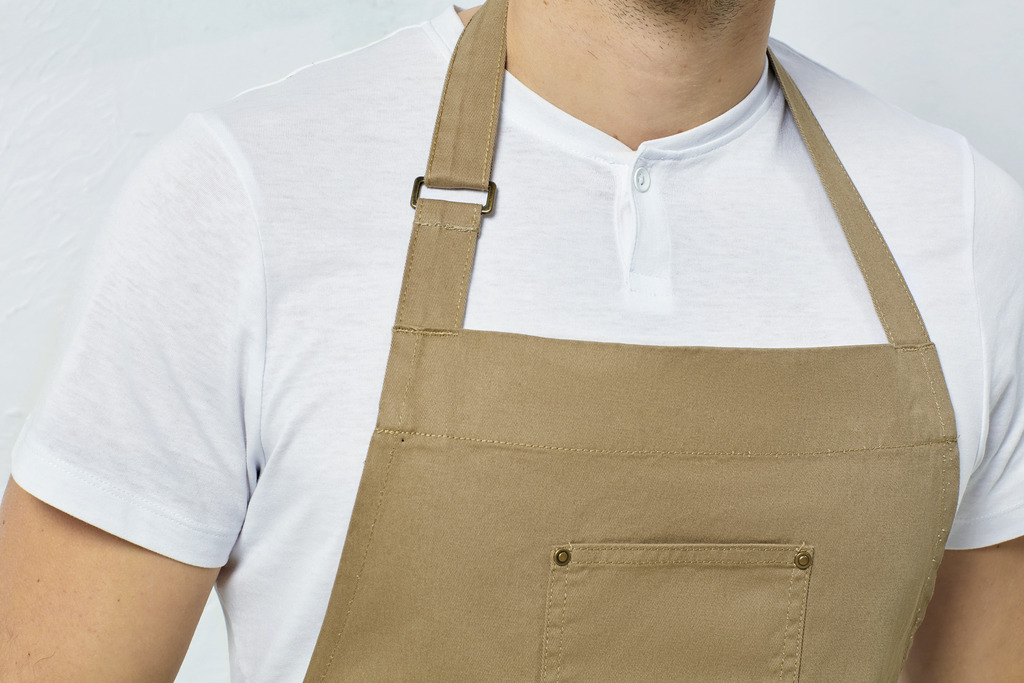 100% sarja de algodão. Este avental é fabricado no tecido clássico “chino”. Perfeito para bares e restaurantes. 3 bolsos que combinam design e funcionalidade. Bolsos tipo “chino” com ilhós. Bolso central na parte superior do avental. Presilha ajustável no pescoço com fivela e molas de pressão. Comprimento: 86 cm. Largura: 72 cm.