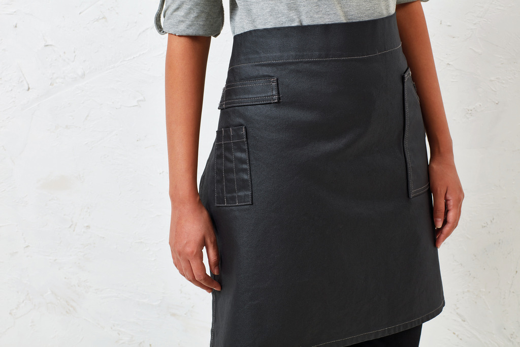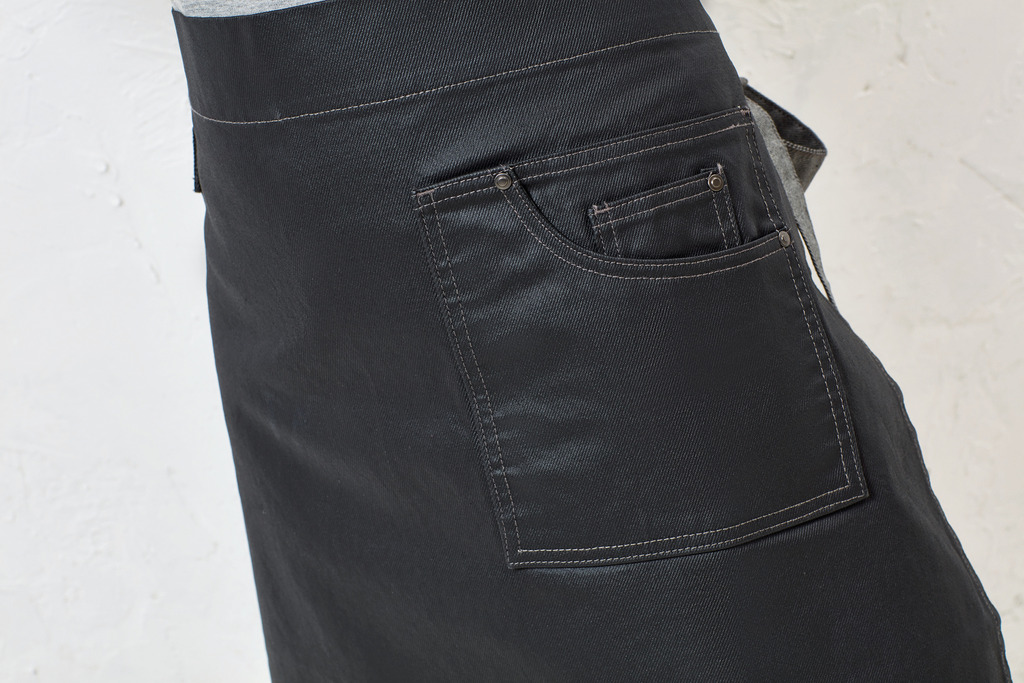 100% ganga de algodão e acabamento acrÃlico. Avental semicurto com detalhes inspirados nas suas calças de ganga preferidas. Bolso grande cosido com capacidade para um tablet. O efeito oleado confere ao avental um aspecto robusto e um certo charme “industrial” que reflecte a decoração de diversos restaurantes. Bolsos extragrandes com acabamento com pespontos e ilhós. Cordões em contraste e sistema de ilhós em metal. Detalhe: bolso cosido e espaço para pano de cozinha. Comprimento: 50 cm. Largura: 70 cm.