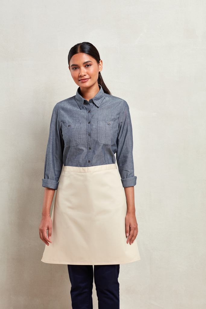 65% poliéster / 35% sarja de algodão. Avental de comprimento médio. Cordões no mesmo tecido. Comprimento: 90 cm. Dimensões: Altura- 50 cm x Largura- 70 cm. Lavagem doméstica a 60 °C. Lavagem industrial a 85 °C.