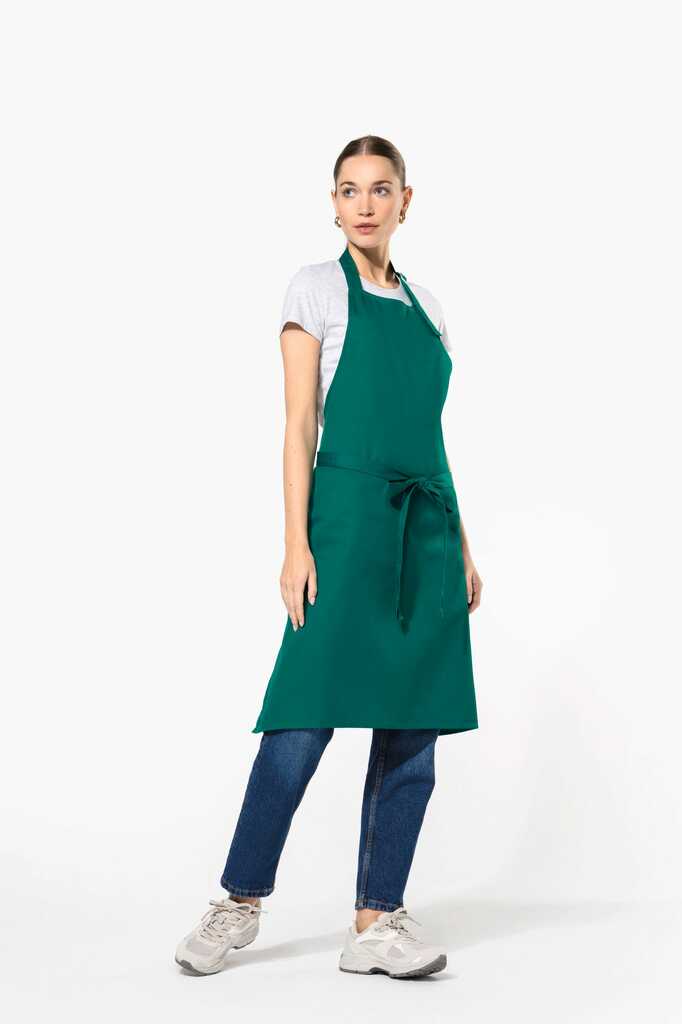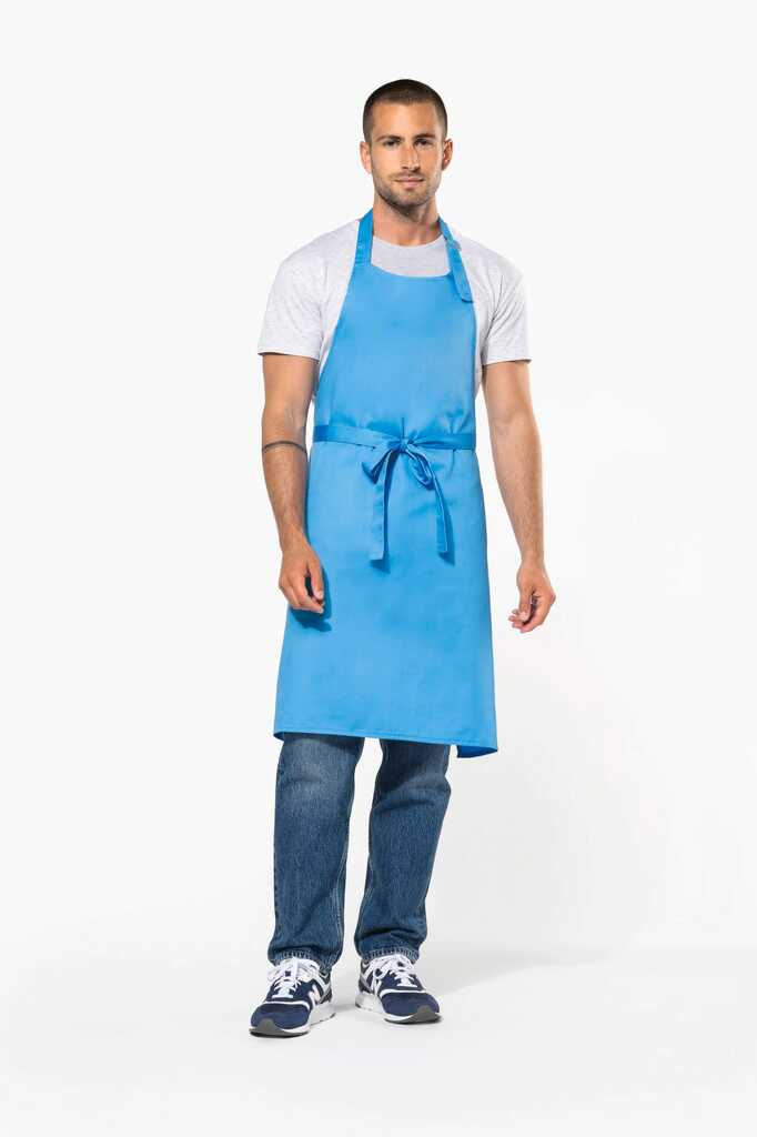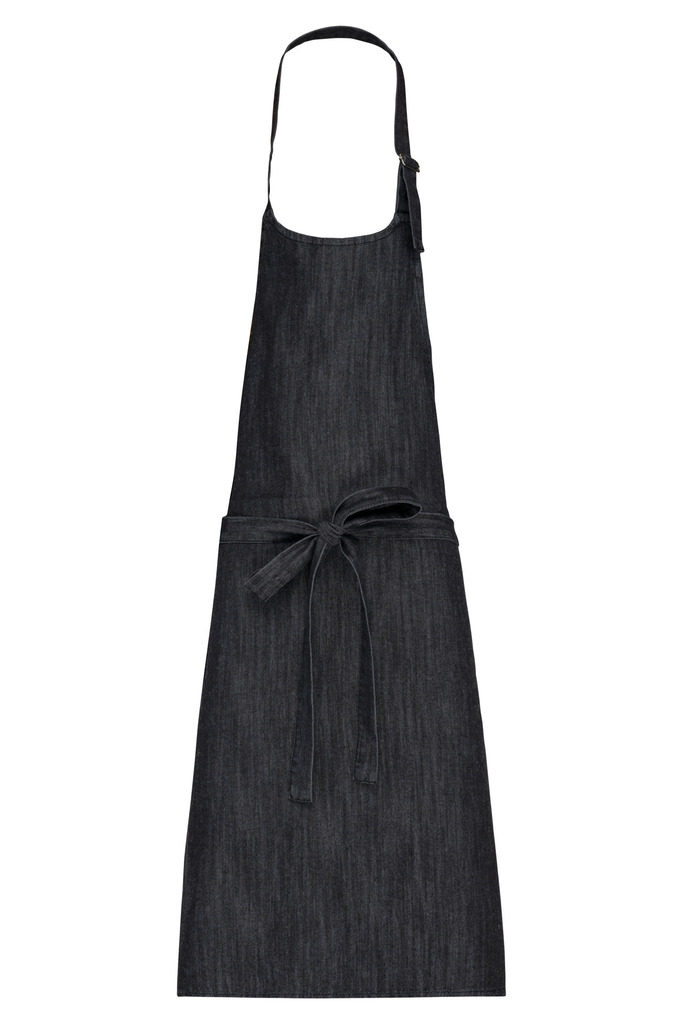 65% poliéster / 35% algodão (Denim, Black Denim 65% algodão / 35% poliéster). Lavagem doméstica a 60°C. Fivela de ajuste metálica ao nível do pescoço para ajustar o comprimento do avental. Sem bolso. Dimensões: A 90 cm – C 76 cm.