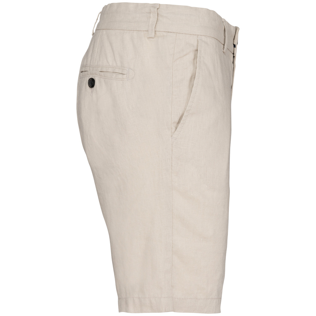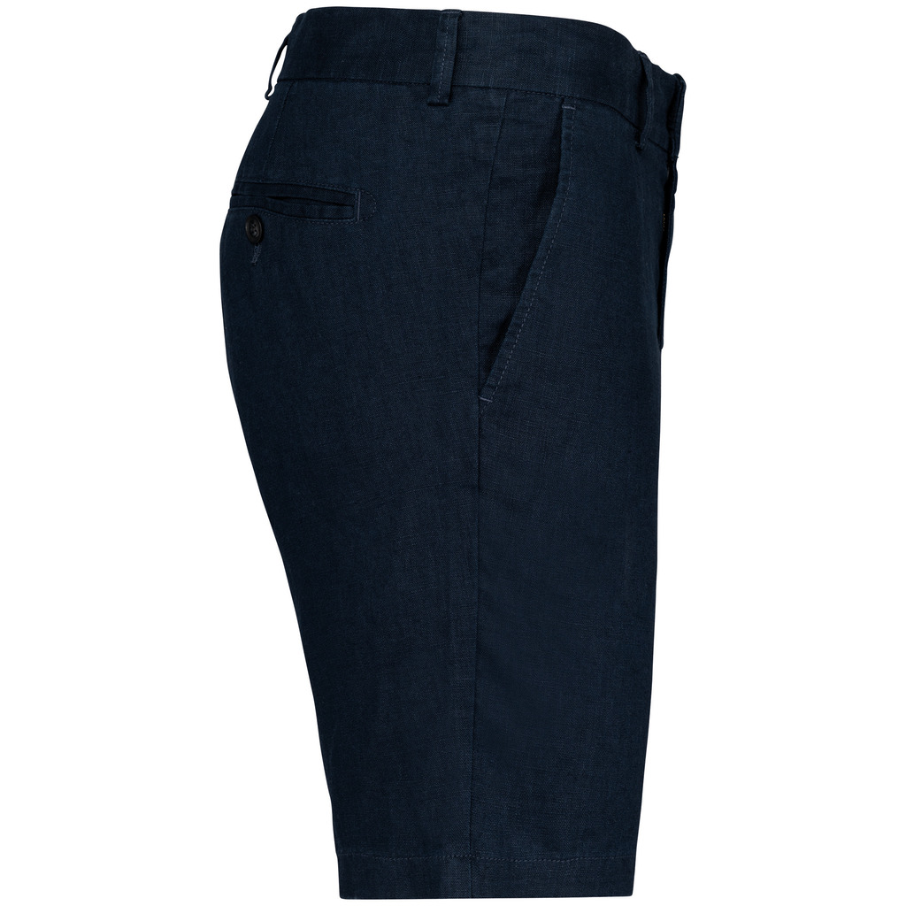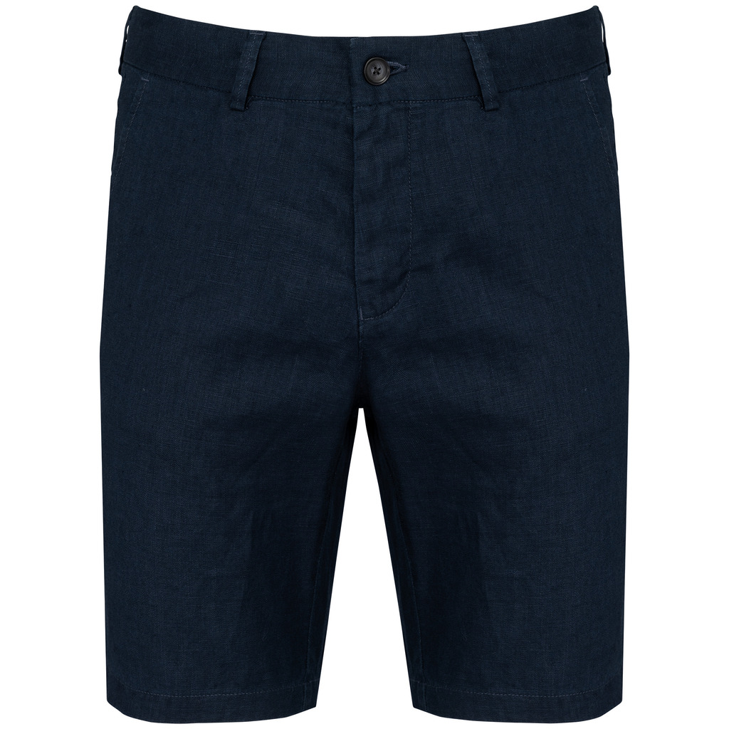 100% linho. Tecida. Cintura com presilhas e acabamento interior em contraste de cor azul marinho. Braguilha com botão em plástico reciclado com efeito marmoreado e fecho em metal reciclado. Dois bolsos frontais com pesponto. Dois bolsos traseiros com pesponto com botão em plástico reciclado com efeito marmoreado. Fundo dos bolsos frontais e traseiros em chevron tom sobre tom. Pesponto na traseira e frontal para mais reforço. Acabamento das pernas com bainha simples. Peça lavada após montagem: as cores podem variar de produto para produto.