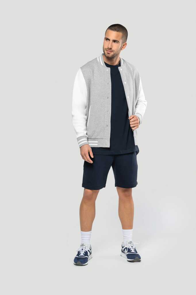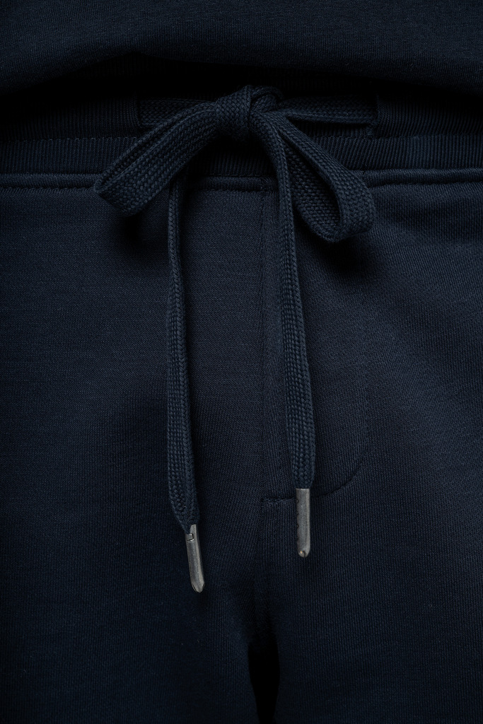 80% algodão biológico / 20% poliéster reciclado pós-consumo. Oxford Grey 75% algodão biológico / 25% poliéster reciclado pós-consumo. Tecido não cardado French Terry LST (Low Shrinkage Terry). Tecido: lavado com banho de enzimas. 2 bolsos laterais e 1 bolso traseiro plano. Cintura elástica em malha rib 1 x 1 com cordão de ajuste plano tom sobre tom com ponta metálica. Sem etiqueta de marca, apenas com indicação de tamanho para facilitar a personalização.