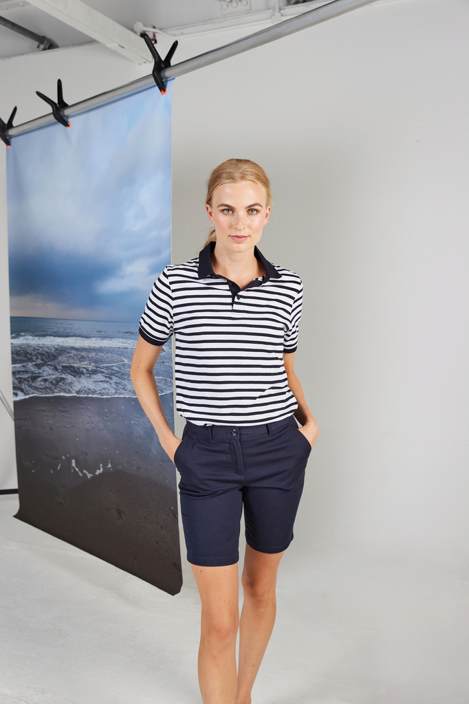 97% algodão / 3% elastano. Calções Chino com bolsos à frente e 2 bolsos com detalhes na parte traseira. Presilhas para cinto. Fechos YKK. Costuras planas. Sem etiqueta da marca para facilitar a personalização