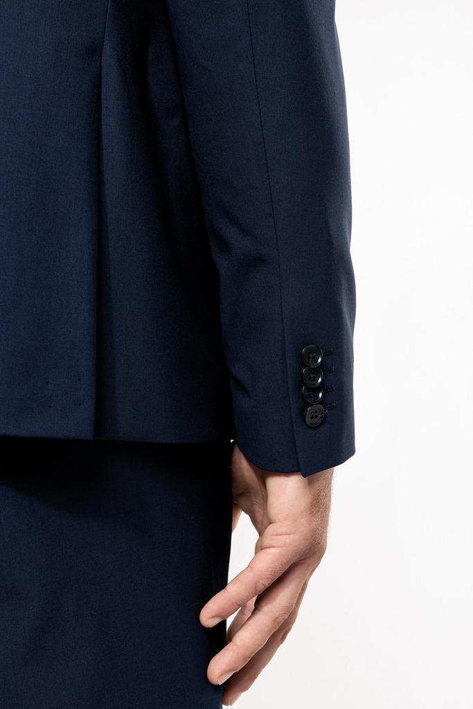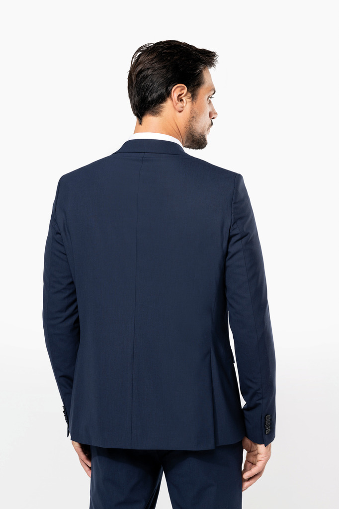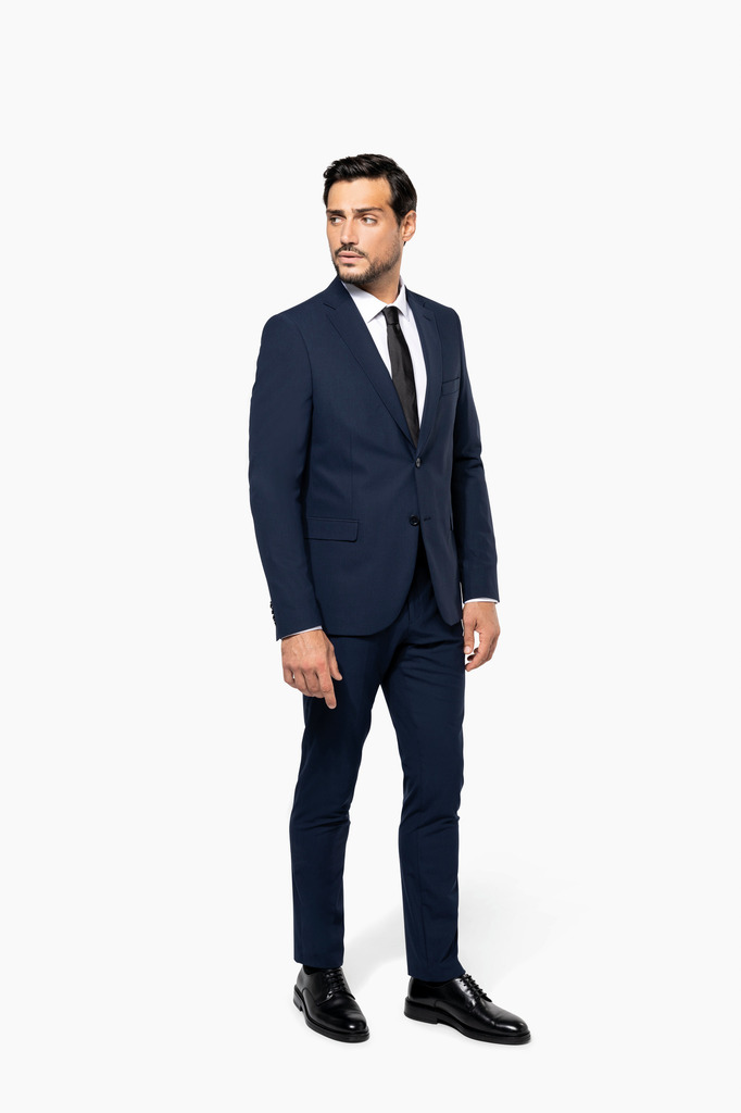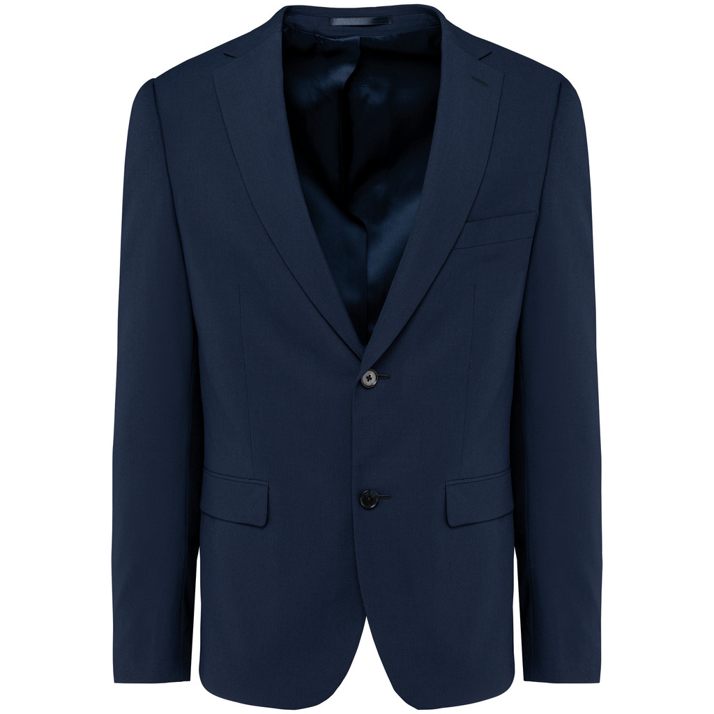 50% poliéster/23% viscose/22% lã/5% elastano. Forro em twill (100% poliéster) tom sobre tom. Corte justo. Blusão com dois botões tom sobre tom. Dois bolsos planos com pala e um bolso peito esquerdo com pesponto. Casa de botão falsa tom sobre tom no lado de dentro da gola. Encaixe lateral que vem dar a forma ao produto. Presilha para pendurar em cetim na zona da gola. Costura no meio das costas com duas aberturas na parte de baixo da peça. Punhos com abertura falsa com 4 botões tom sobre tom. Acabamento com viés em contraste, para os dois bolsos interiores no peito. Um bolso para telefone e um bolso ticket plano tom sobre tom no interior do lado esquerdo. Fecho de personalização do lado esquerdo. Sem etiqueta de marca, apenas com indicação de tamanho para facilitar a personalização.