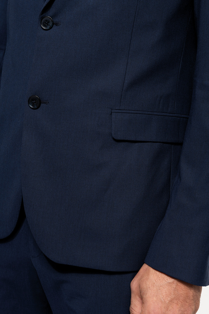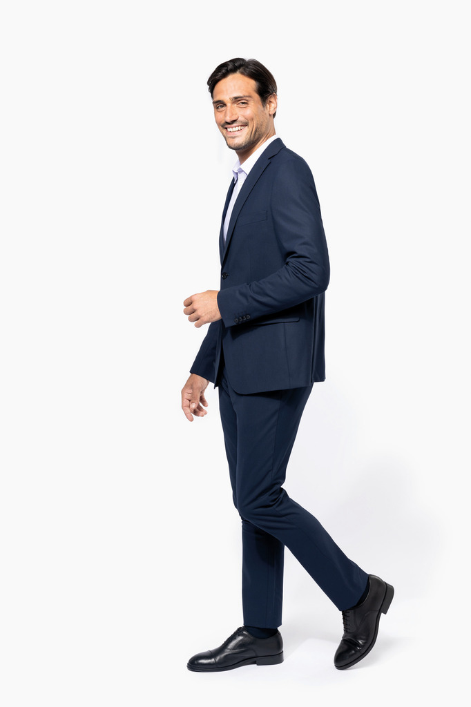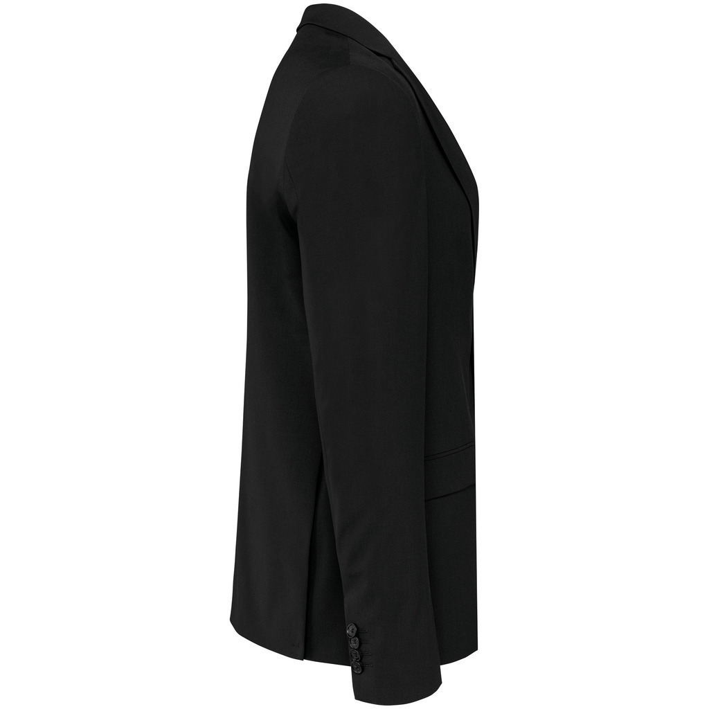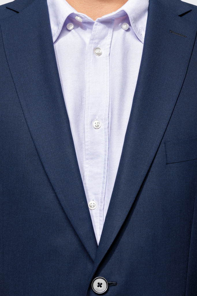 50% poliéster/23% viscose/22% lã/5% elastano. Forro em twill (100% poliéster) tom sobre tom. Corte justo. Blusão com dois botões tom sobre tom. Dois bolsos planos com pala e um bolso peito esquerdo com pesponto. Casa de botão falsa tom sobre tom no lado de dentro da gola. Encaixe lateral que vem dar a forma ao produto. Presilha para pendurar em cetim na zona da gola. Costura no meio das costas com duas aberturas na parte de baixo da peça. Punhos com abertura falsa com 4 botões tom sobre tom. Acabamento com viés em contraste, para os dois bolsos interiores no peito. Um bolso para telefone e um bolso ticket plano tom sobre tom no interior do lado esquerdo. Fecho de personalização do lado esquerdo. Sem etiqueta de marca, apenas com indicação de tamanho para facilitar a personalização.