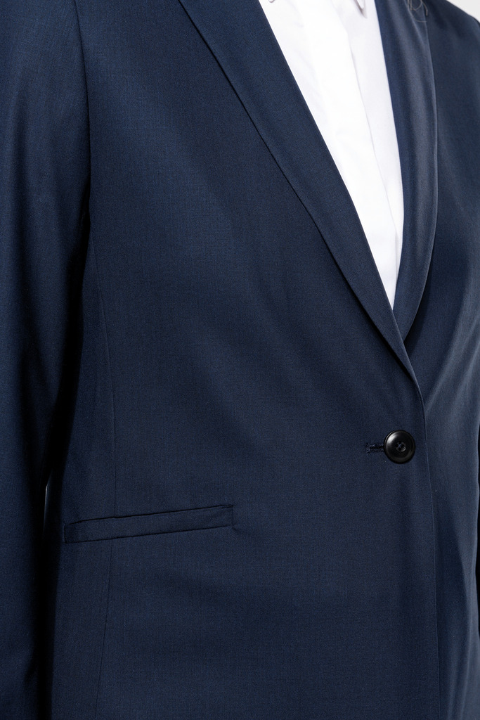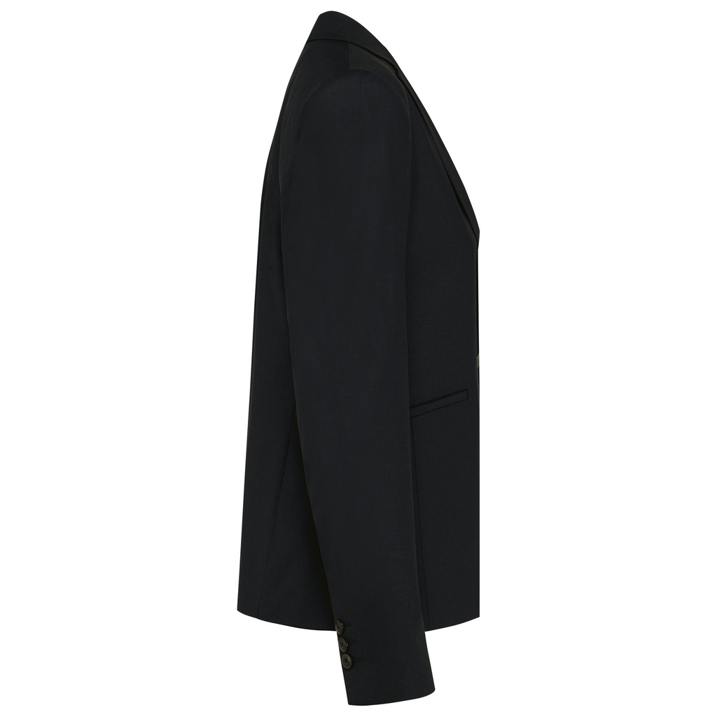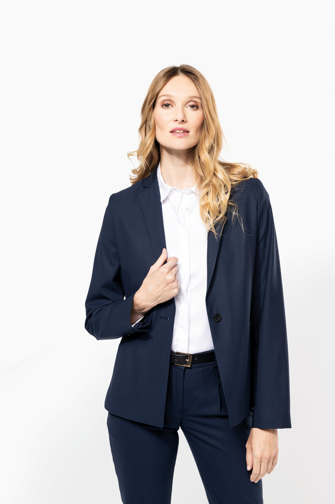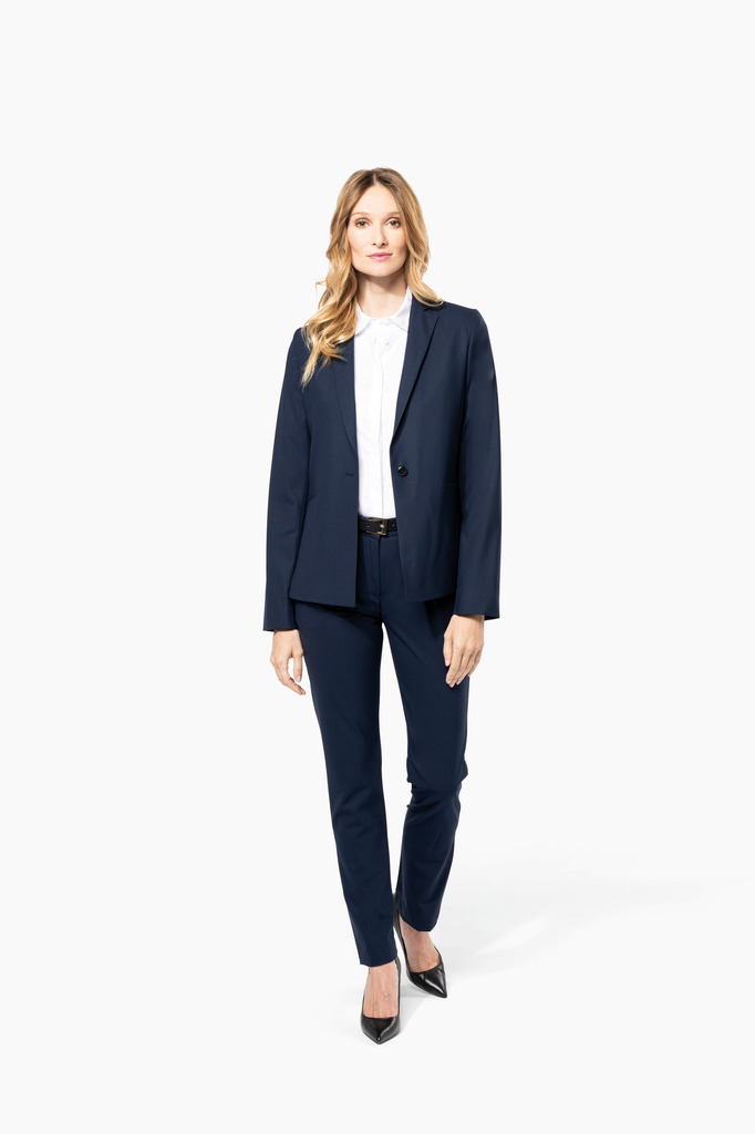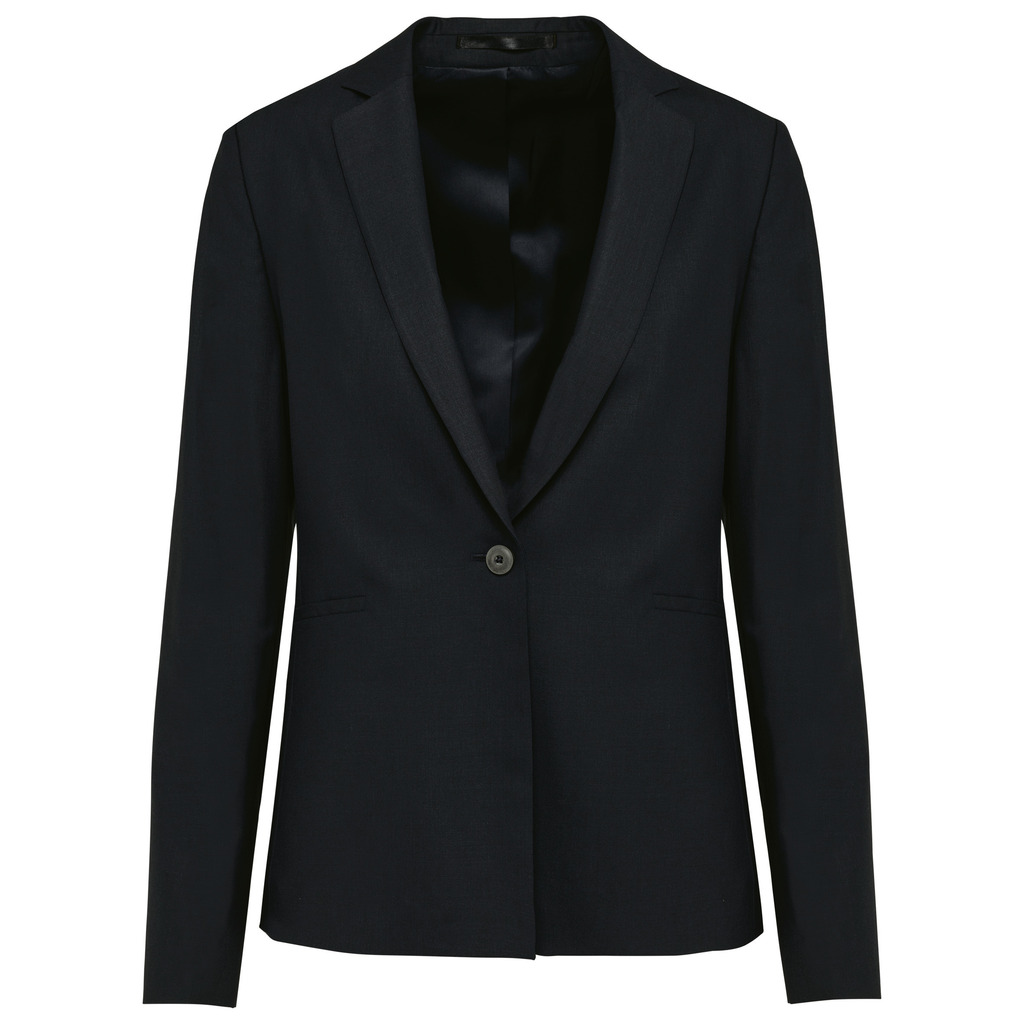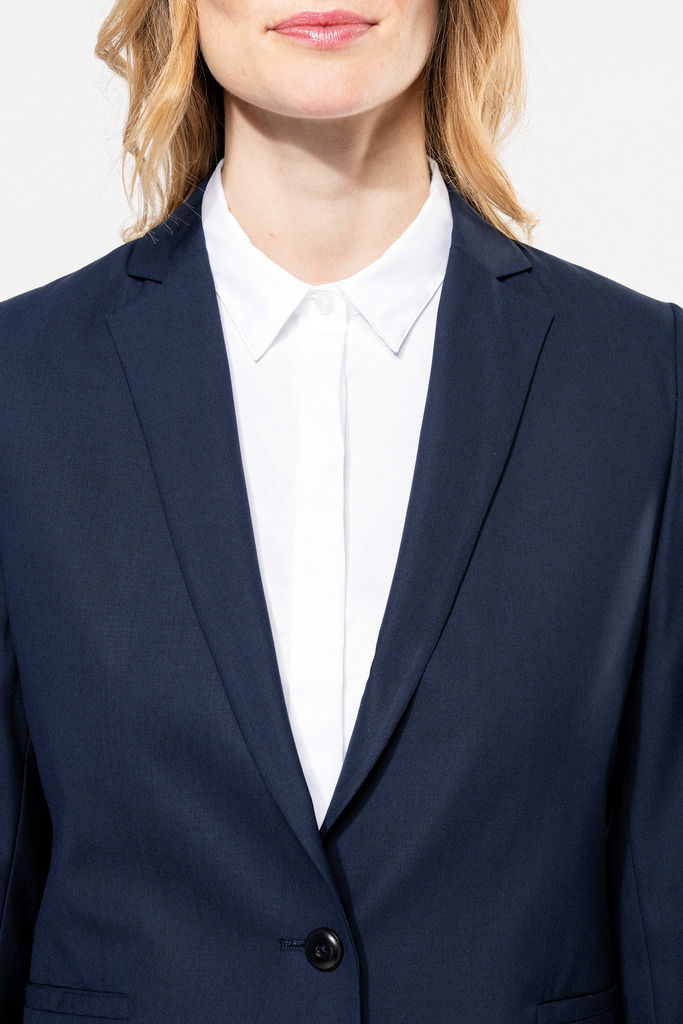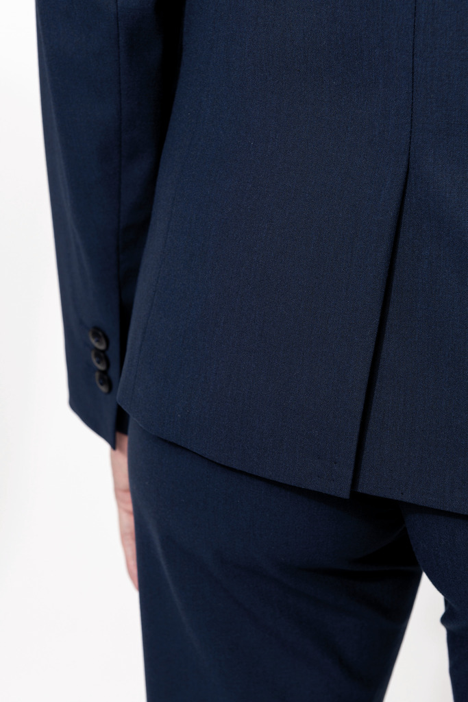 50% poliéster/23% viscose/22% lã/5% elastano. Forro 100% twill poliéster tom sobre tom com prega. Blazer aperta com 1 botão. 2 bolsos frontais. Um bolso interior no peito esquerdo. Mangas com 3 botões. 1 abertura / racha nas costas. Sem etiqueta de marca, contém pequena etiqueta apenas com indicação de tamanho para facilitar a personalização.