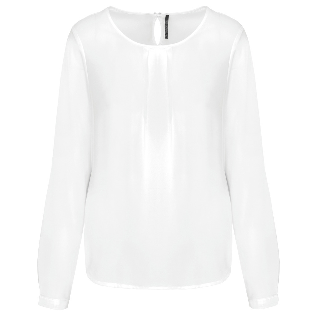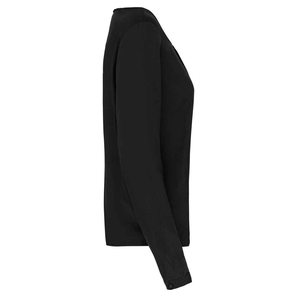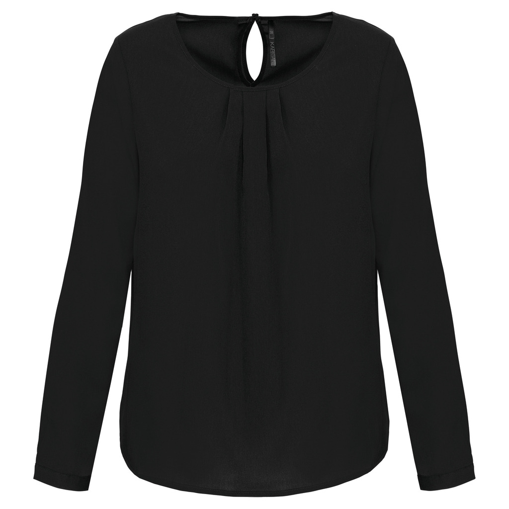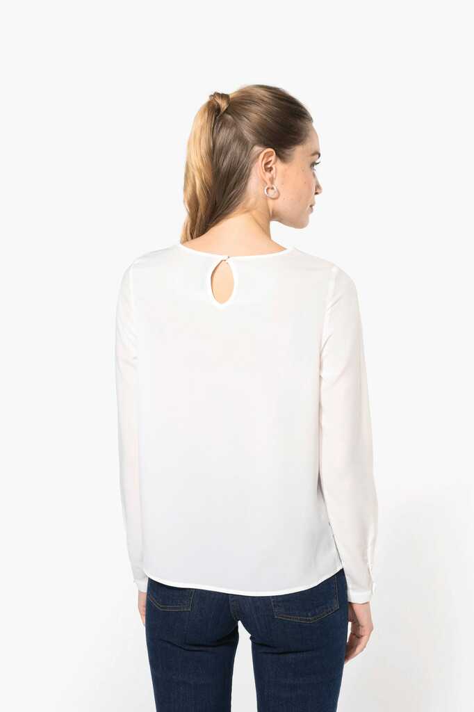 100% poliéster. Tecido crepe, leve e fluido. Decote redondo. Pequenos franzidos no decote. Botões forrados à cor nas mangas. Fechamento na parte de trás e no fundo das mangas por um botão coberto.