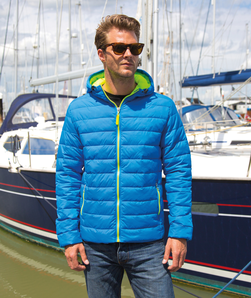 Exterior: 100% nylon 20D. Forro: 100% nylon 20D. Enchimento: 100% poliéster 220 g/m². Capuz ajustável. Resistente à água e ao vento. Fecho frontal. Bolsos com fecho. Corte justo. Punhos elásticos suaves. Design acolchoado. Acolchoado à mão. Muito suave ao toque e ventilado. Extremamente leve e quente. Fácil de guardar.