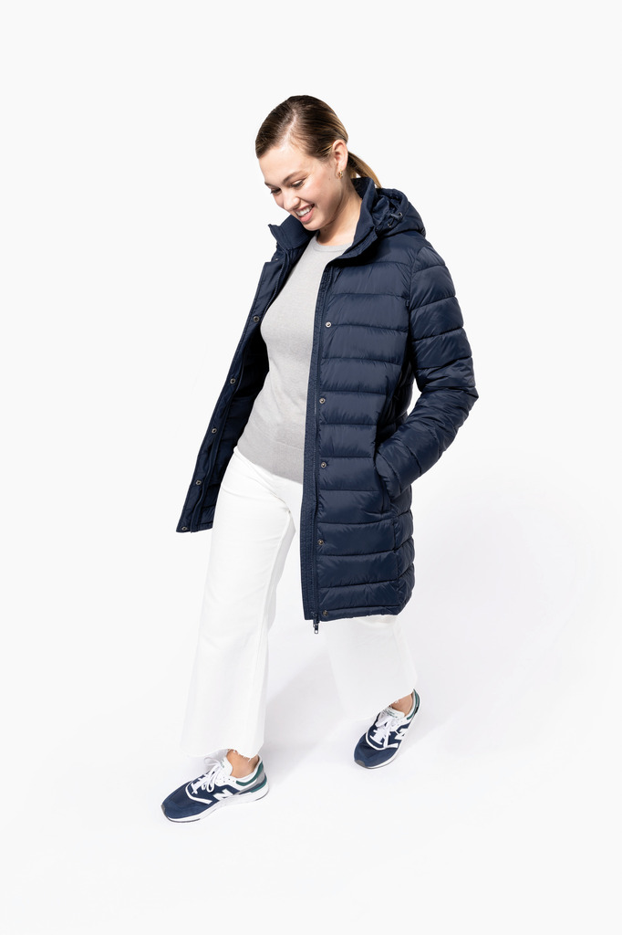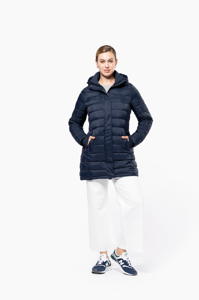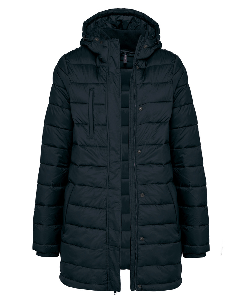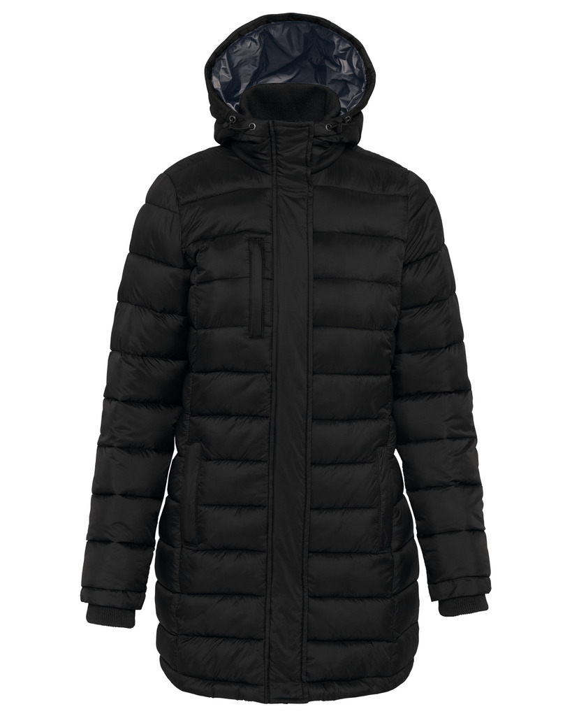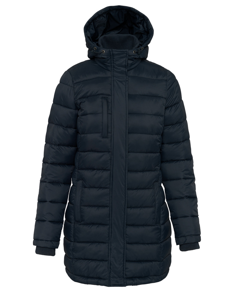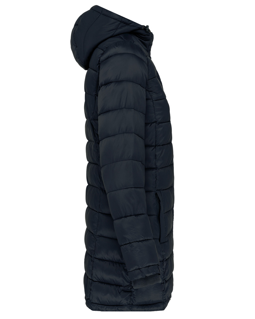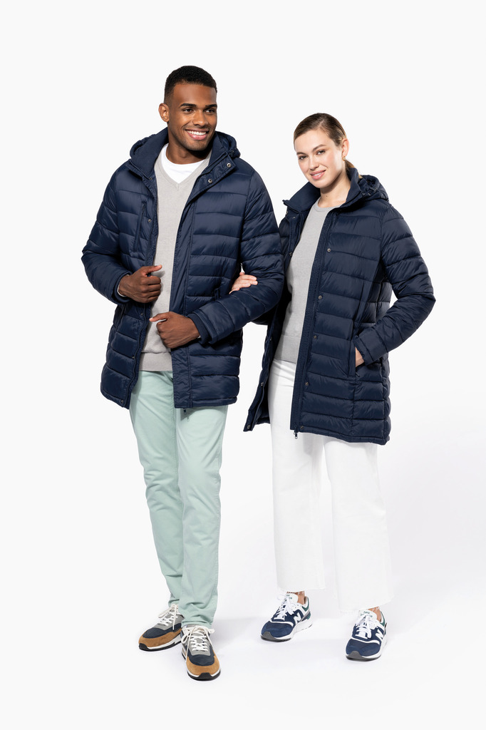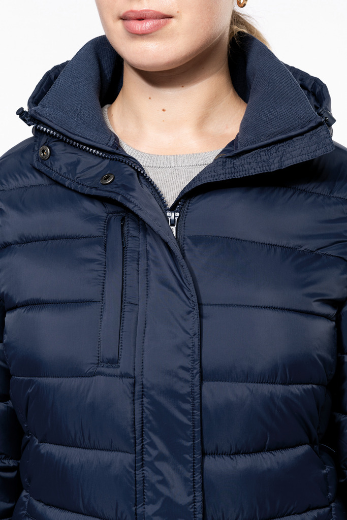 100% poliamida. Interior em poliéster. Quente e muito leve. Corte cintado. 2 bolsos à frente e 1 bolso no peito com fecho. Com fecho de cursor duplo por carcela e molas de pressão. Interior do colarinho e punhos com acabamento em malha rib. Interior do capuz e corpo em contrast: Convoy Grey para Black. Capuz e corpo em tom sobre tom: Navy para Navy.