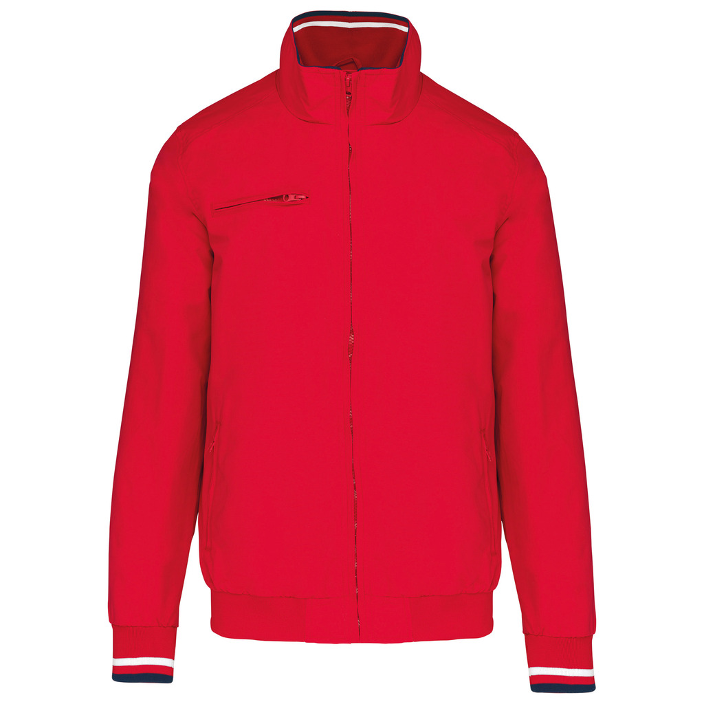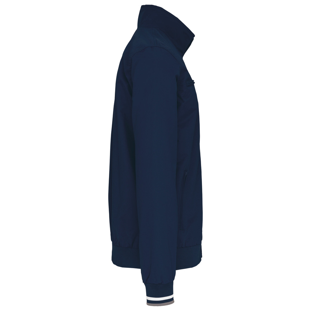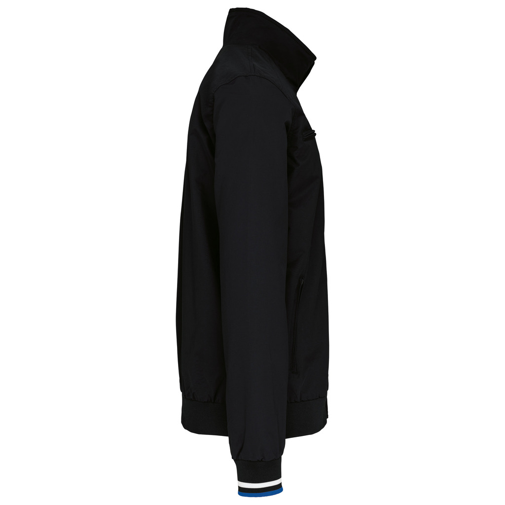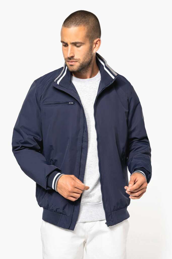 100% poliamida Taslon Ottoman. Forro: 100% poliéster. Tecido forte e mate. 2 bolsos frontais com fecho. 1 bolso no peito com fecho. 1 bolso interior. Gola com acabamento em rib. Forro com acesso para personalização. Punhos e cintura em malha canelada com risca em contraste.