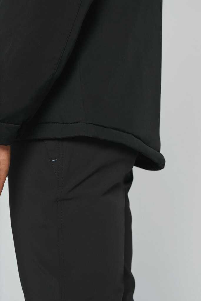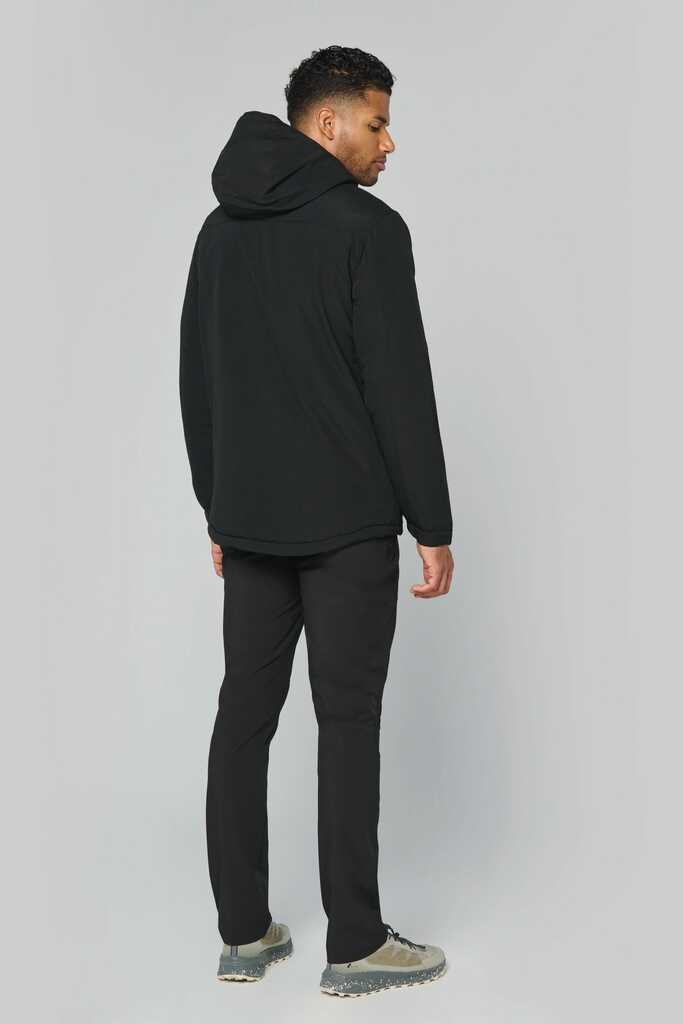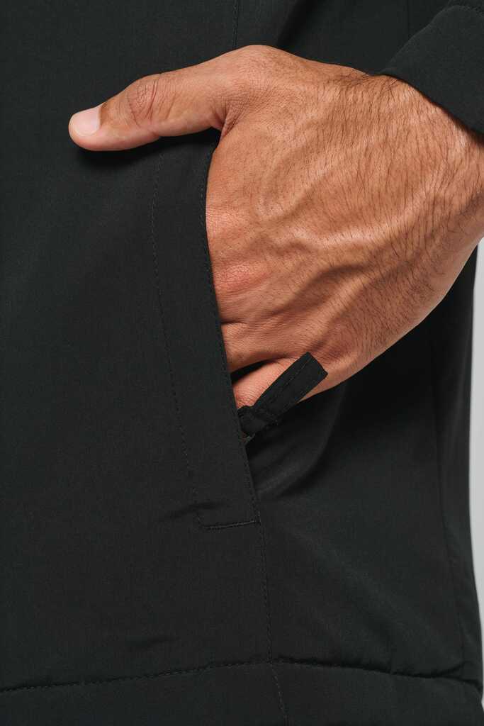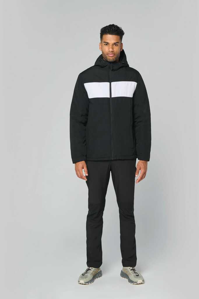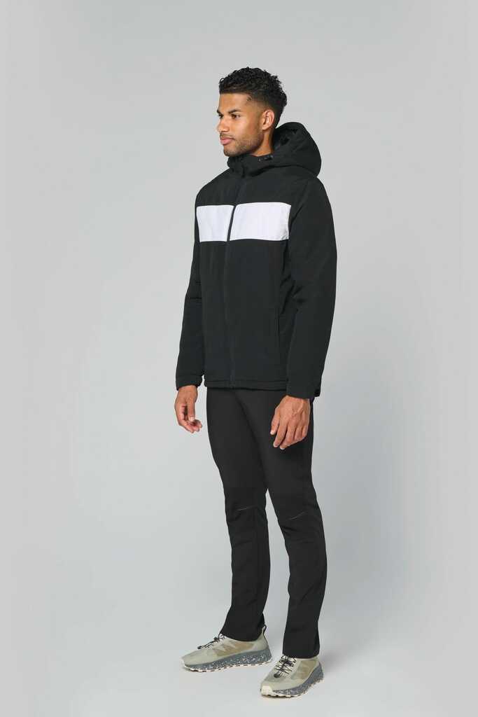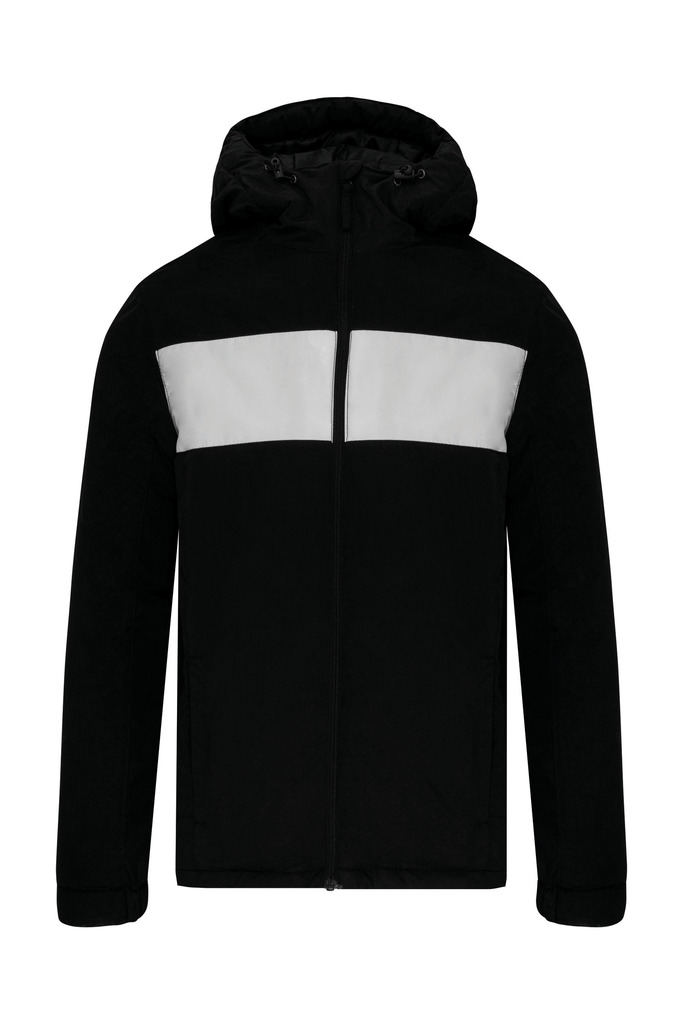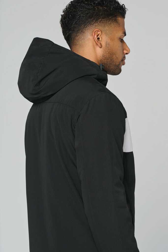 100% poliéster. Exterior: 100% poliéster com tratamento repelente à água e toque de pele de pêssego. Forro: 100% poliéster taffeta. Enchimento: 100% poliéster. Com fecho. 2 bolsos laterais com fecho oculto e 1 bolso interior. Frente com banda em contraste. Capuz acolchoado com 3 partes com stoppers. 1 etiqueta para nome no interior no peito direito. Punhos semielásticos. Fecho no lado esquerdo e na parte inferior de acesso para personalização.