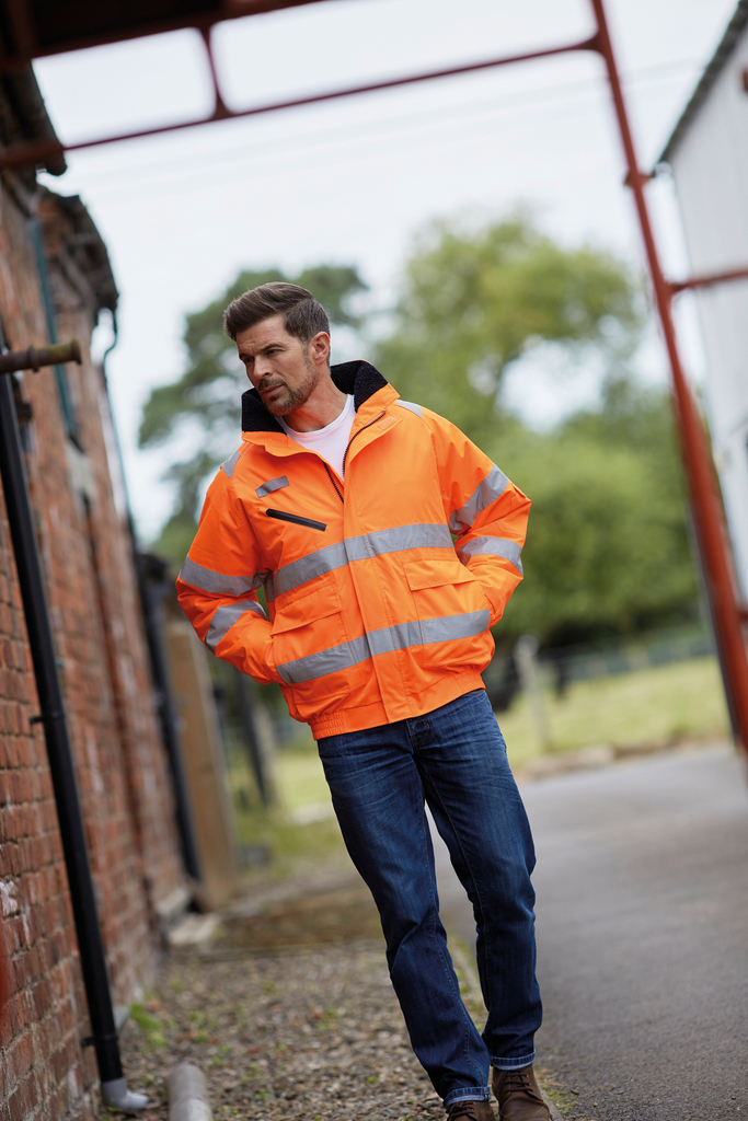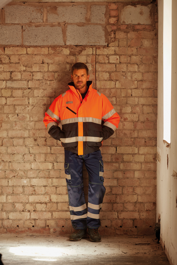 Blusão em poliéster, fabricado em tecido ripstop de quadrados finos impermeável e respirável. Forro amovível em lã polar sherpa. Faixas reflectoras de 5 cm cosidas no tronco e em cada braço. Duas faixas reflectoras nos ombros. Bolso no peito com fecho em velcro impermeável. Bolsos para caneta e telemóvel no braço esquerdo. Capuz amovível. Fecho de duplo sentido. De acordo com a norma EN ISO20471 de categoria 3.