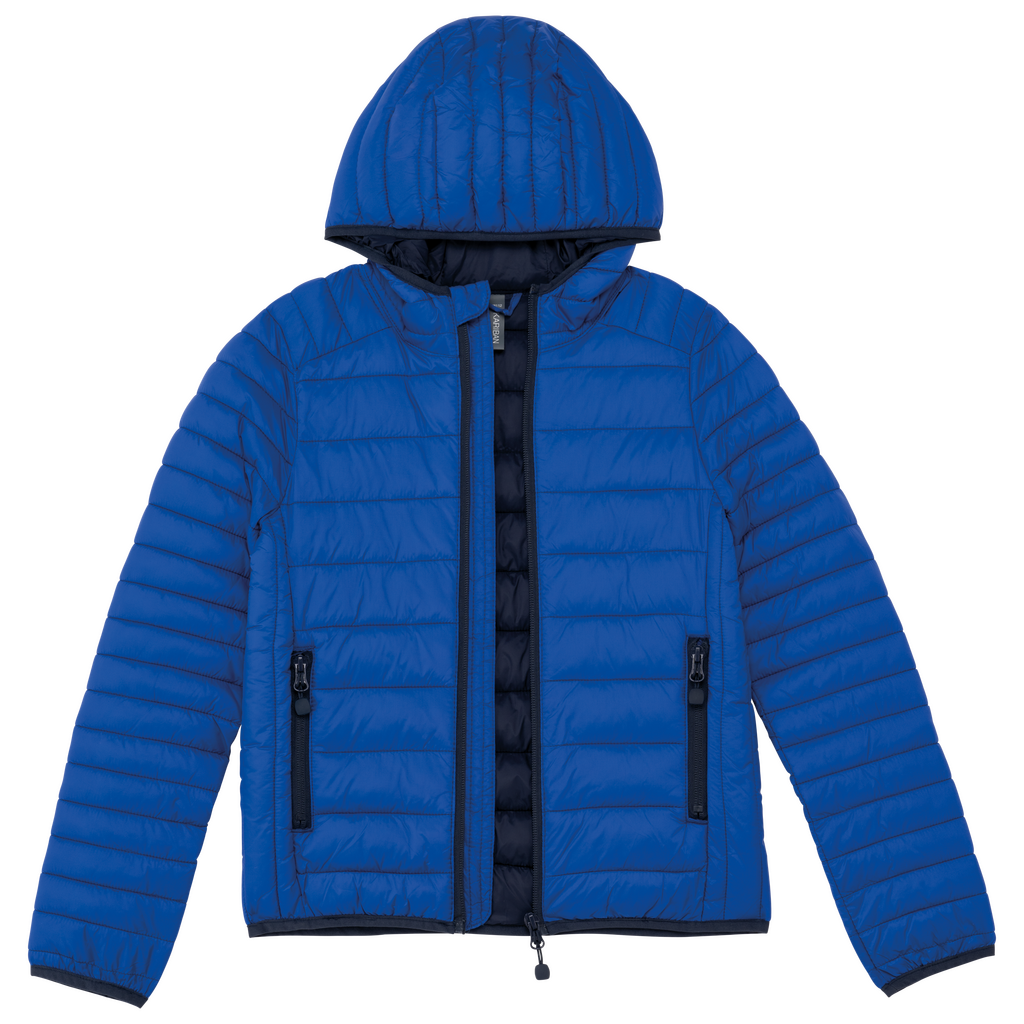 100% poliamida. Interior em poliéster. Quente e muito leve. Fácil arrumação dentro do saco de acondicionamento. 2 bolsos frontais com fecho. Interior: Convoy Grey para Black and Red ; Navy para Light Royal Blue and Navy.