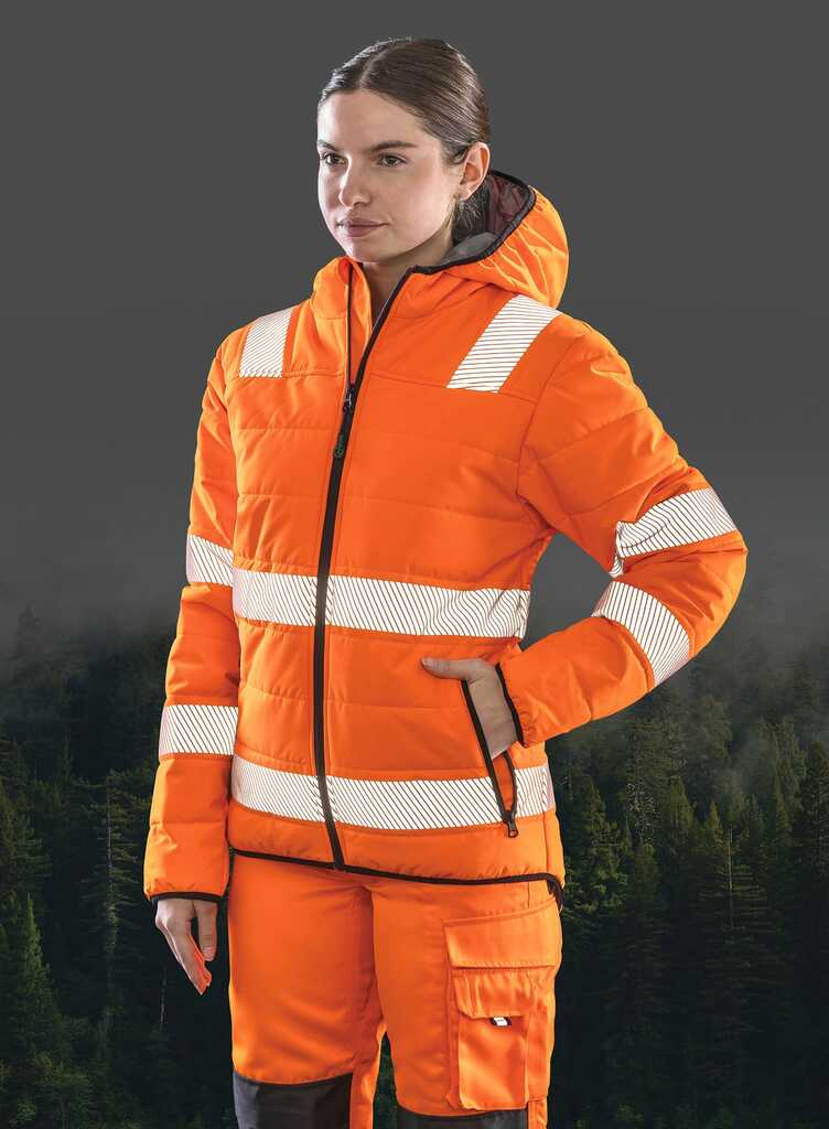 100% poliéster. 100% poliéster reciclado. Exterior em TPU reciclado antirasgos. Resistente à abrasão com REPREVE®. Enchimento em poliéster reciclado 200 g/m² REPREVE®. Fibras recicladas fabricadas a partir de garrafas de plástico. Com fecho YKK com protecção para o queixo e tira. Cós, punhos e capuz com acabamento elástico. Mais comprido nas costas. Faixas reflectoras impressas no corpo, nos ombros e nas mangas. Bolsos laterais com fecho. Capuz acolchoado. Bolso interior. Presilha para pendurar. Norma High Viz: EN ISO 20471: 2013+A1: 2016 Classe 2 RIS-3279-TOM Classe 2 (somente no modelo Orange).
