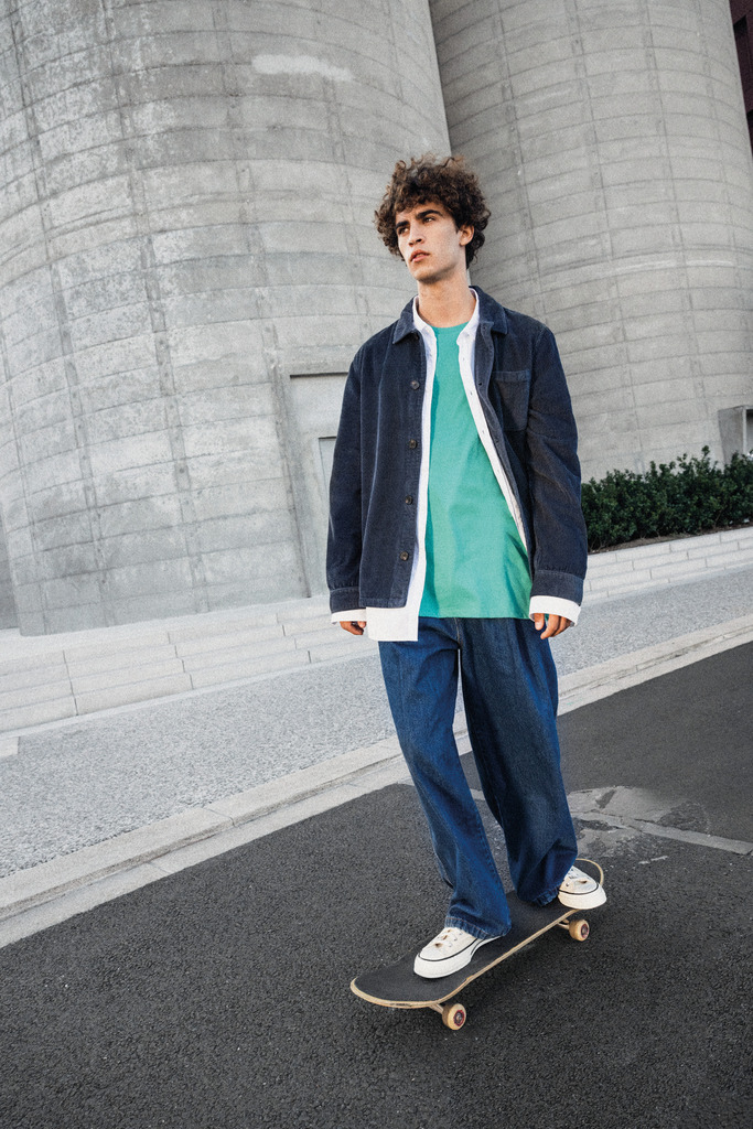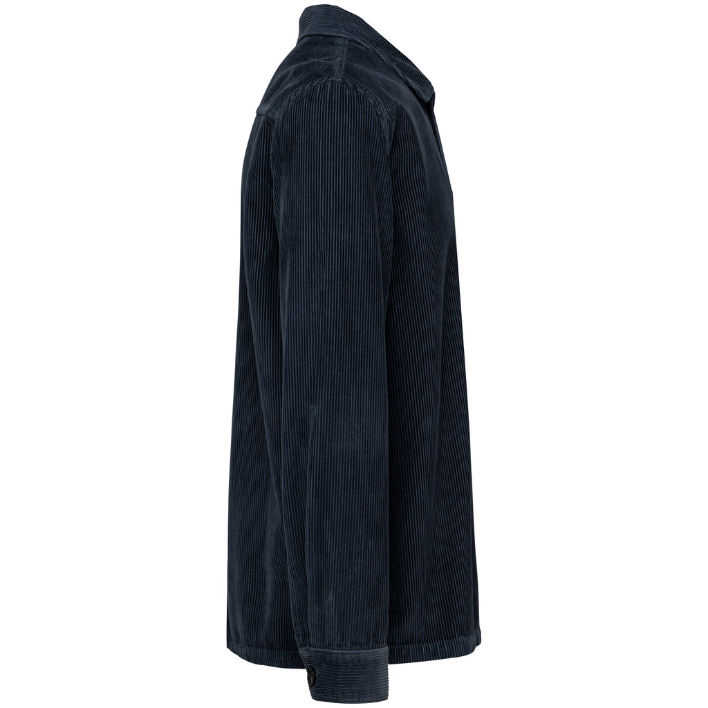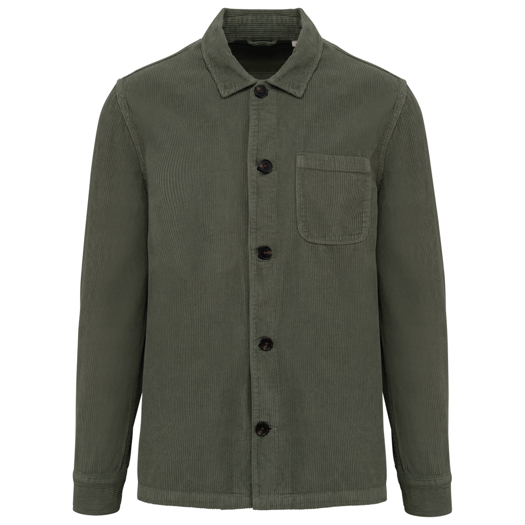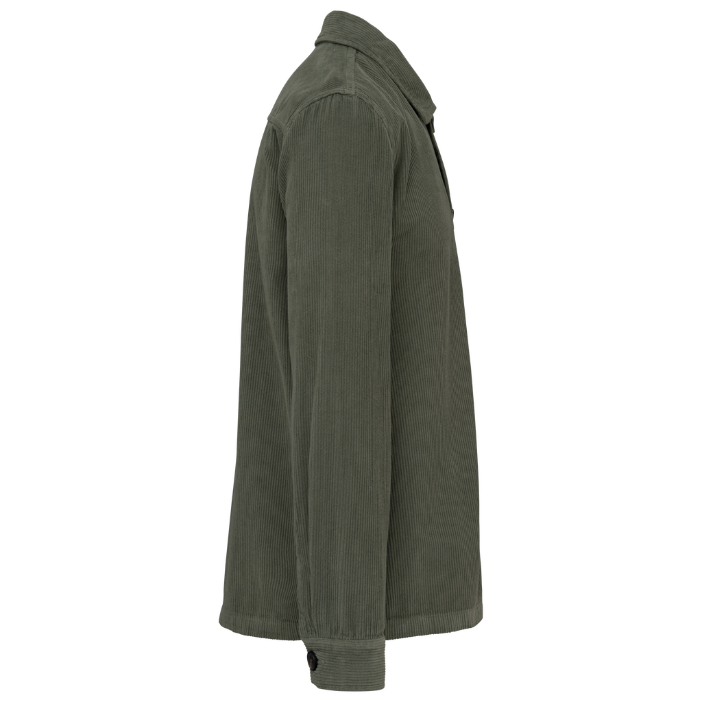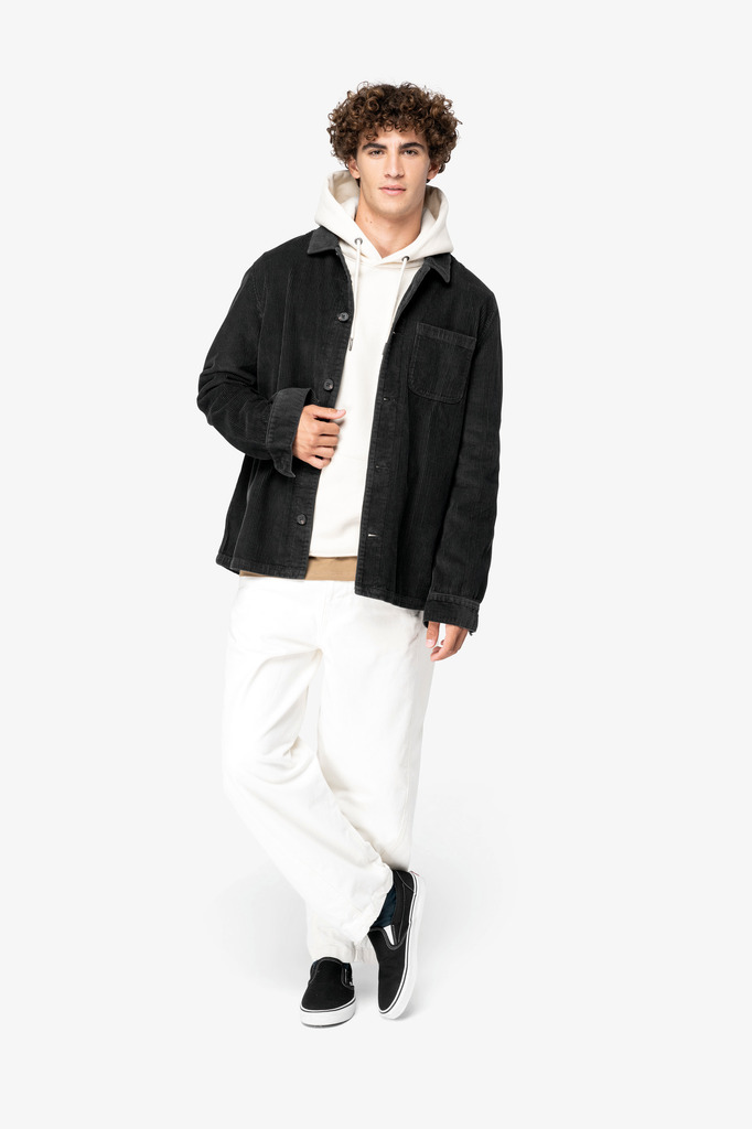 100% algodão biológico. Corte direito. Blusão em veludo, canelado 1 x 1 com bolso plano no peito esquerdo. Carcela com botões em plástico reciclado. Punhos com abertura e botão em plástico reciclado. Gola com motivo fantasia. Presilha interior para pendurar no tecido principal. Encaixe nas costas. Patch de personalização interior. Peça tingida após montagem: as cores podem variar de produto para produto. Esta peça é susceptível de debotar em contacto com superfícies ou peças de vestuário claras.