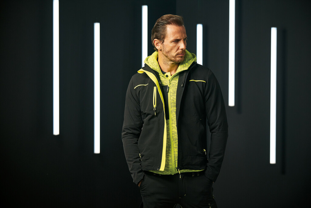 90% nylon/10% spandex. Blusão em tecido U-4 (U-Power 4 ways stretch) súper confortável, suave ao toque, repelente à água, respirável e de secagem rápida. Com dois bolsos frontais e um bolso com fecho para telemóvel no peito. Dois grandes bolsos interiores. Capuz amovÃvel ajustável. Punhos extensÃveis corta-vento. Encaixes reflectores para garantir uma visibilidade máxima. Cordão de ajuste no interior do bolso. Costas mais compridas. Faixa vermelha reflectora na gola e nas costas.