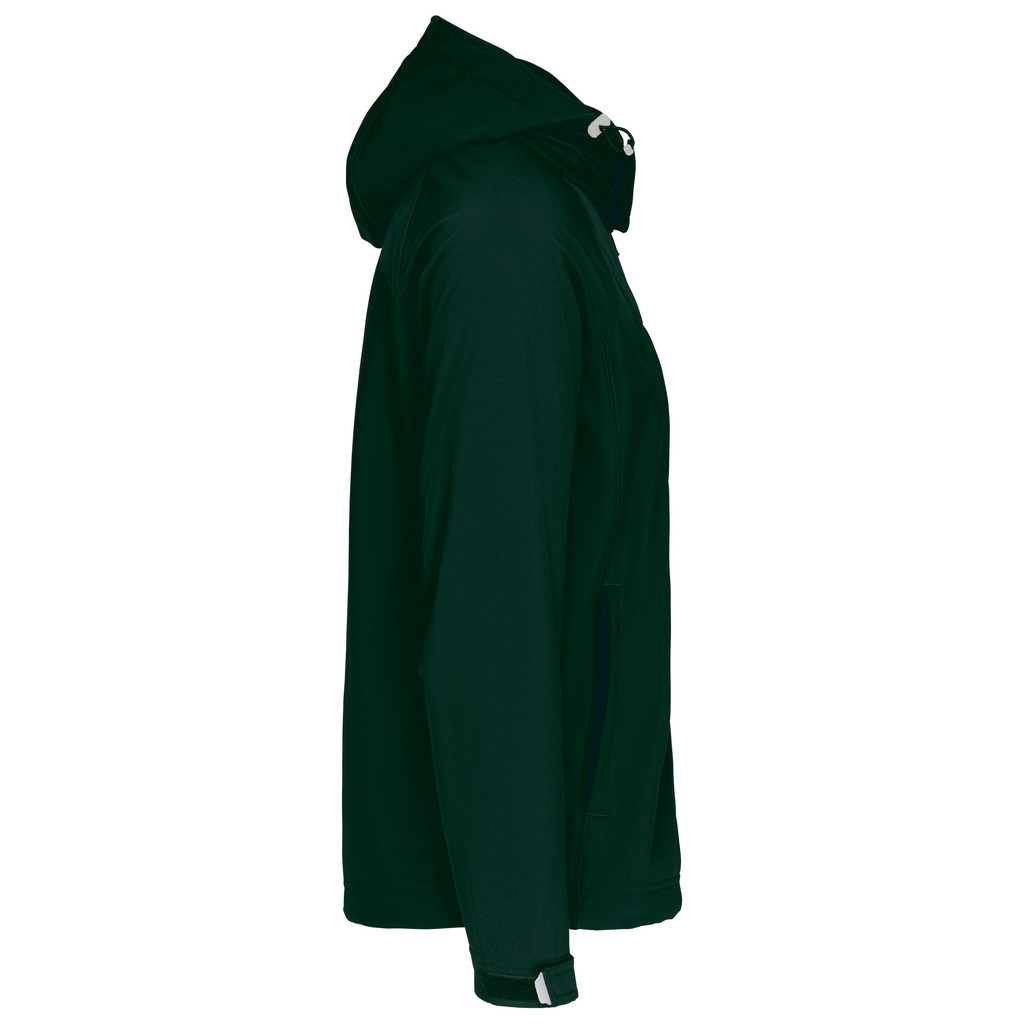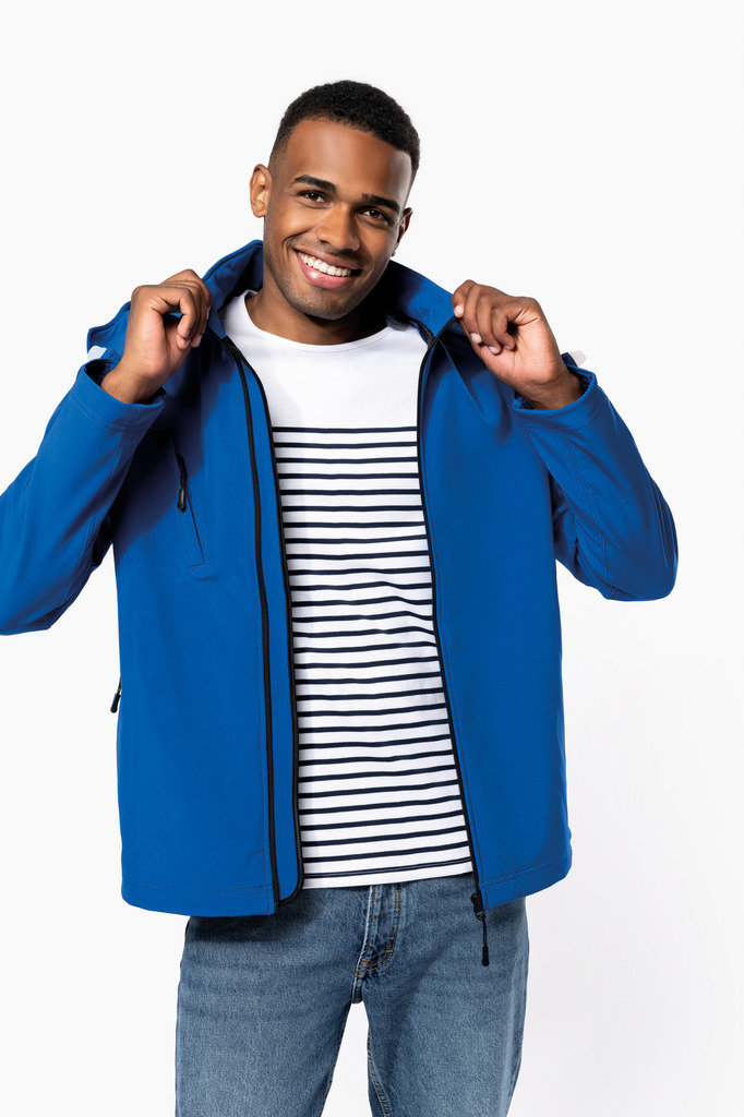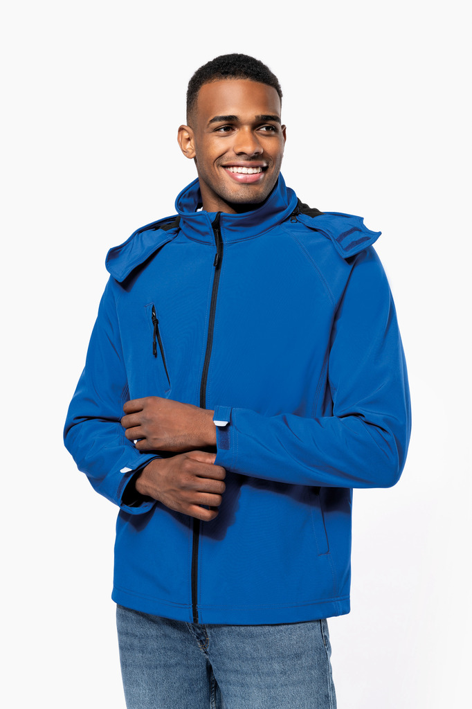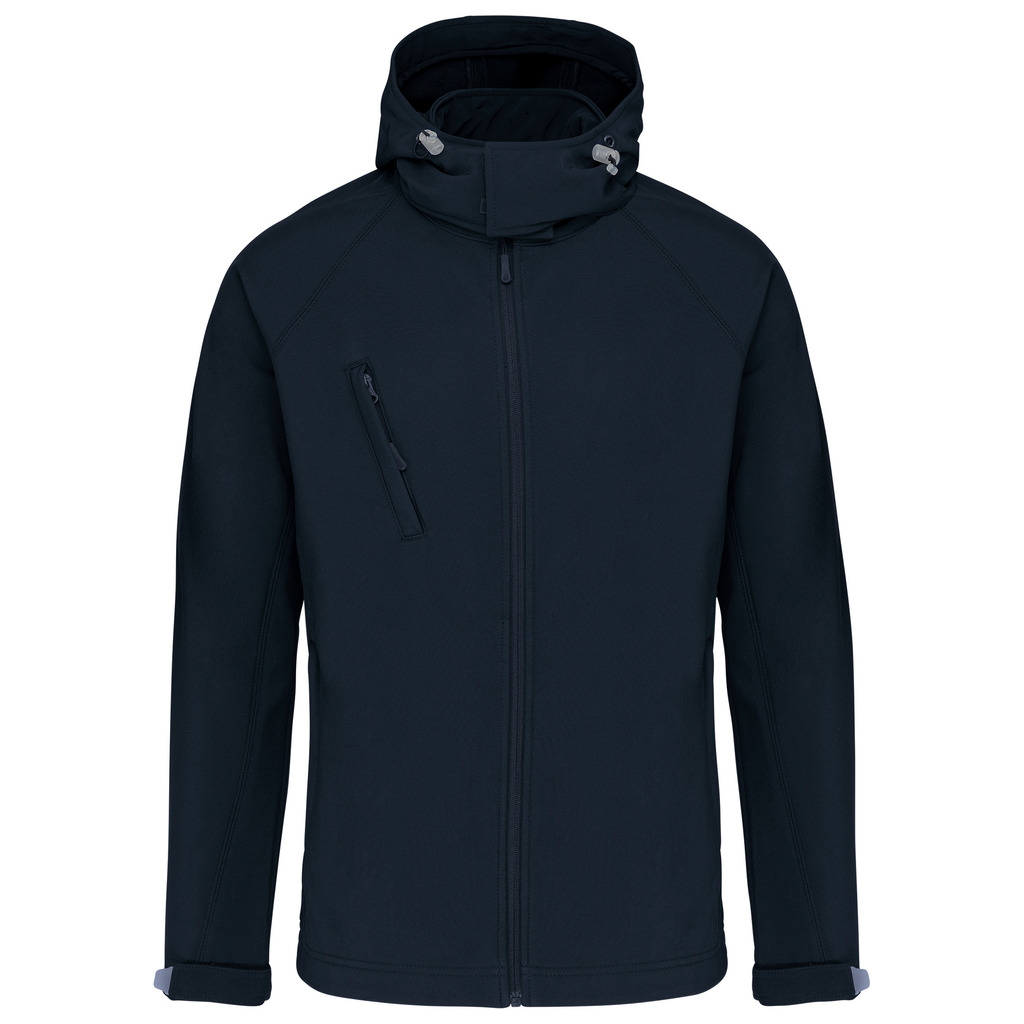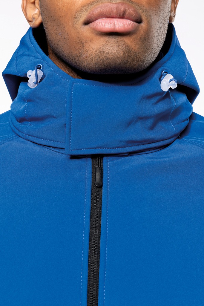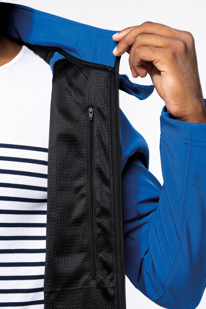 95% poliéster / 5% elastano. Tecido composto por 3 membranas tecnologicamente coladas. Respirável até 1000 g / m² / 24 horas e resistente à água até 5000 mm. Exterior: 95% poliéster / 5% elastano, com membrana intermédia respirável e interior em micropolar. Mangas raglan. Fecho frontal. 2 bolsos frontais com fecho. 1 bolso com fecho no peito direito. Capuz amovível e cordão de ajuste. Punhos ajustáveis. Fecho invisível de acesso para personalização. Mangas raglan.