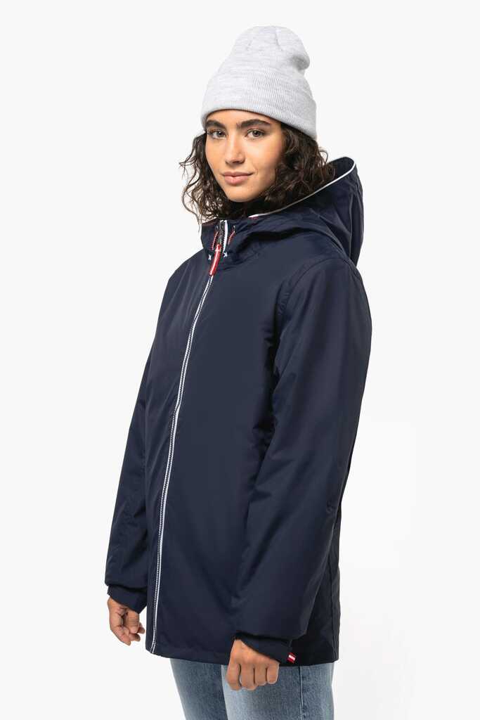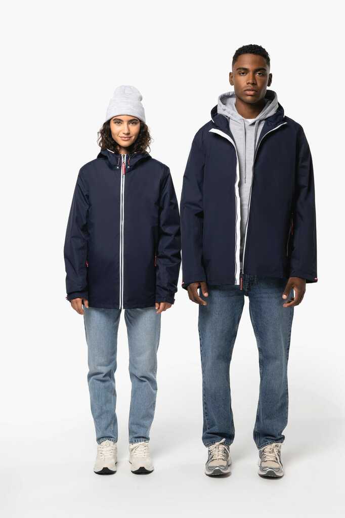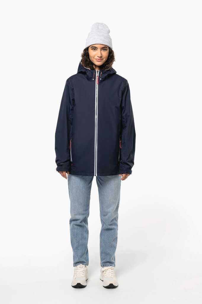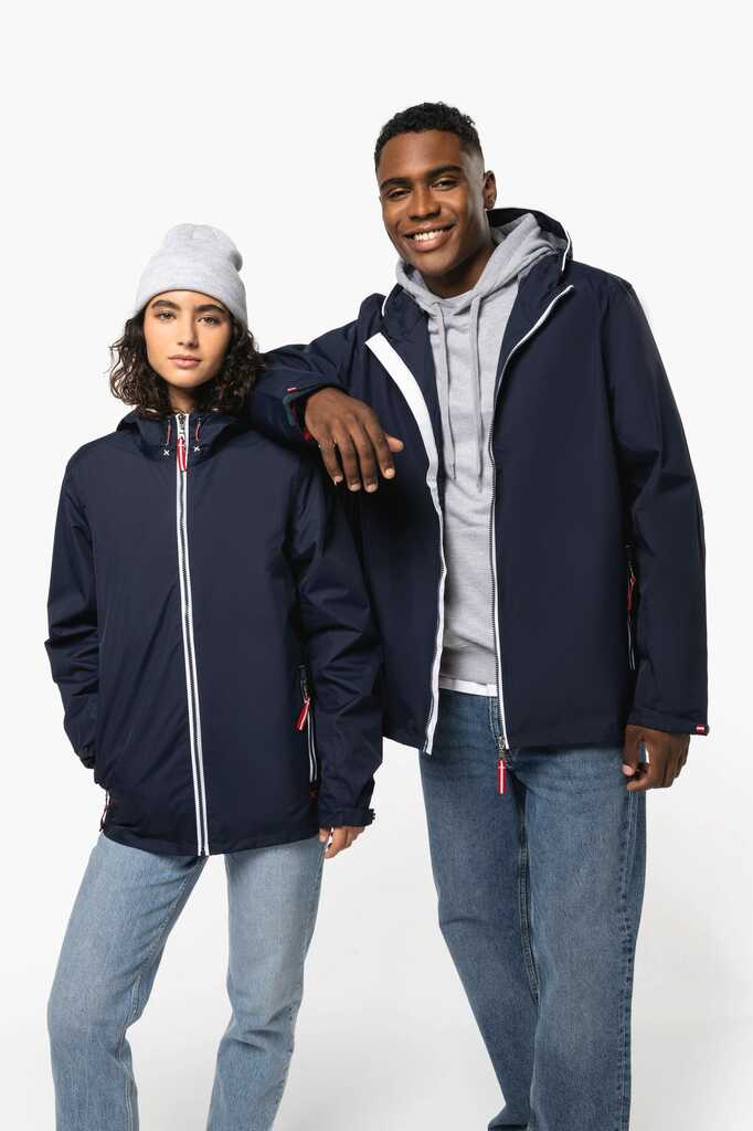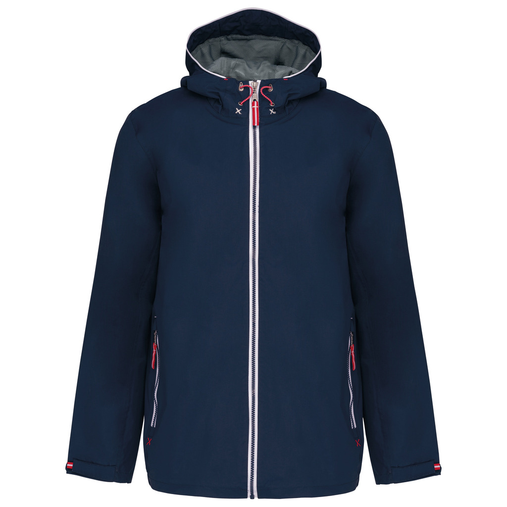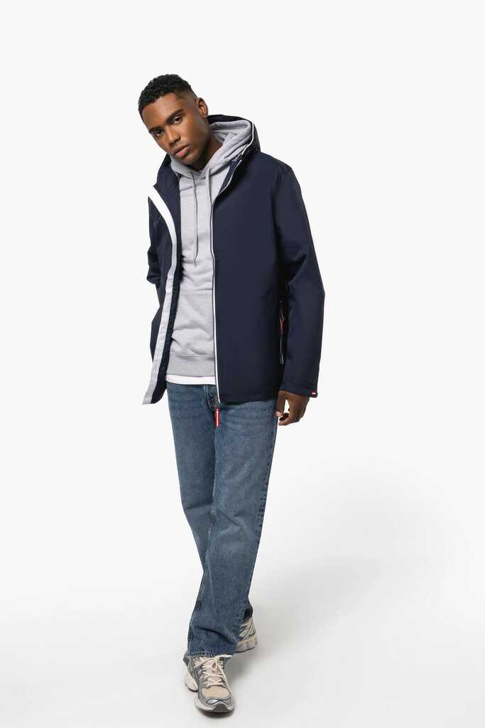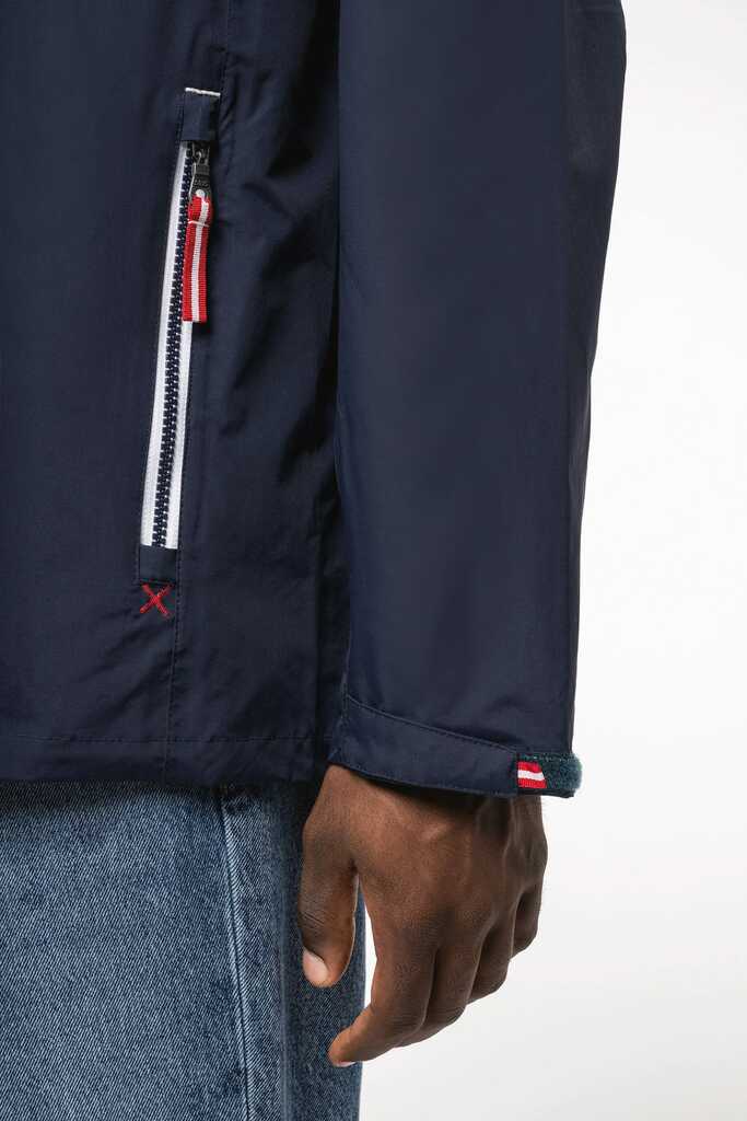 100% poliamida. Respirável até 5000 g / m² / 24 horas. Waterproof até 3000 mm. Costuras seladas. Fecho frontal. Forro em contraste. 2 bolsos frontais com fecho. 1 bolso interior. Capuz forrado em rede com cordão de ajuste. Fecho de acesso para personalização na zona inferior e no peito.