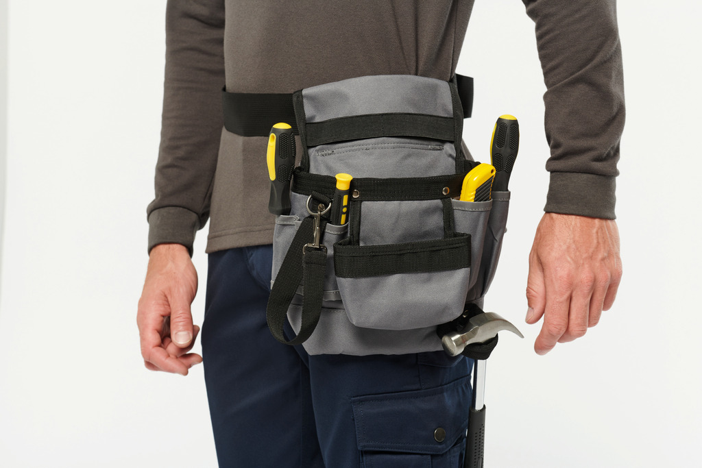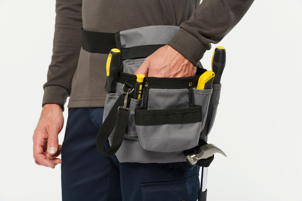 100% poliéster. Bolsa porta-ferramentas, com oito compartimentos e uma banda porta-fita adesiva. O cinto regulável com fivela está incluÃdo. Bolso frontal aberto facilmente personalizável.
