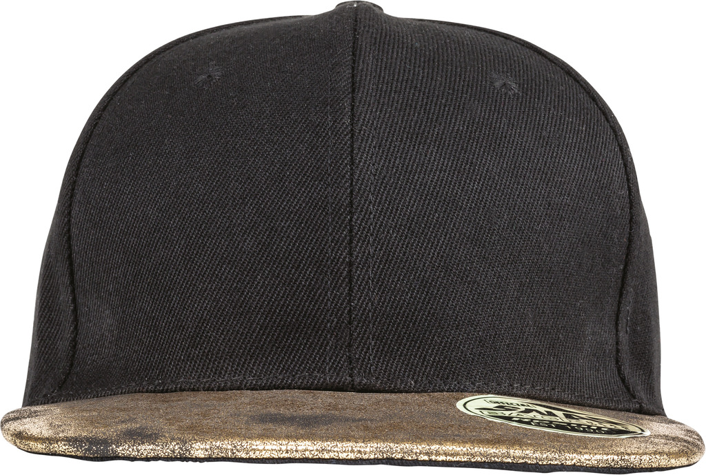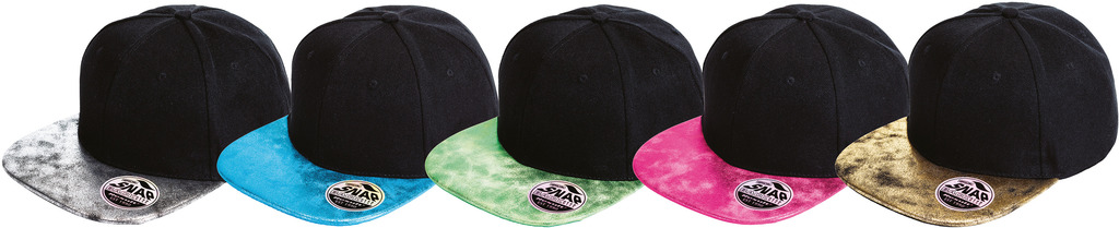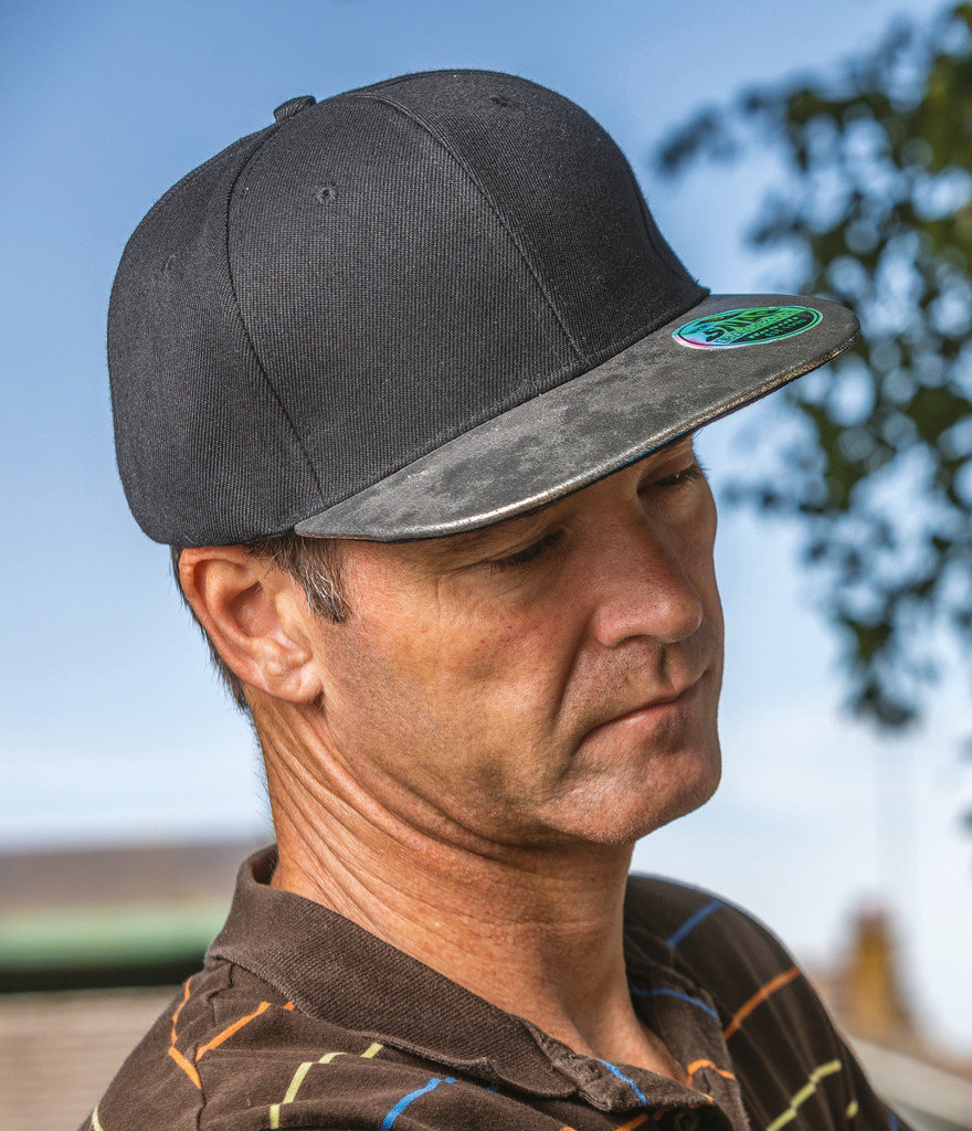 100% sarja acrílica. Boné Snapback 6 painéis. Viseira em contraste, pala em PU reciclado com efeito nacarado. Ilhós bordados. Painéis frontais reforçados. Fivela de ajuste Snapback. Etiqueta amovível. Compatível com bordado ou transfer.