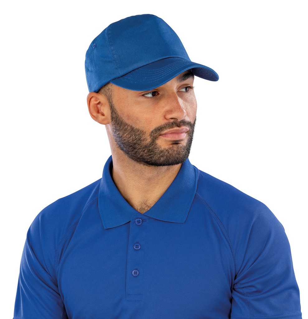 100% sarja de algodão. 5 painéis. Interior frontal com reforço. Ilhós de ventilação. Tamanho ajustável com fecho em velcro. Sem costura no painel frontal para facilitar a impressão ou o bordado.