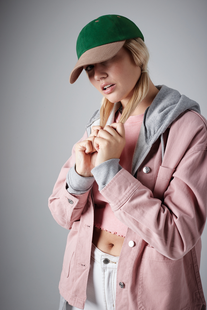 100% algodão drill escovado, modelo de 6 painéis, pala curva, presilha com fivela metálica e orifício, ilhós de ventilação.