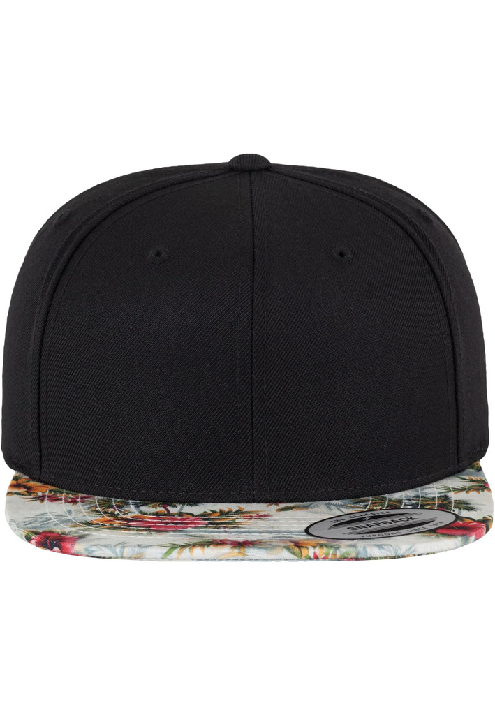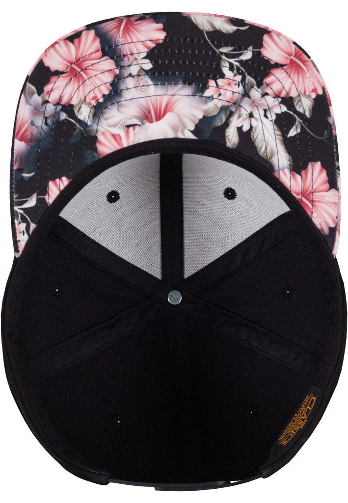 80% acrílico, 20% lã. Boné 6 painéis com ajuste snapback. Pala plana com motivos florais.
