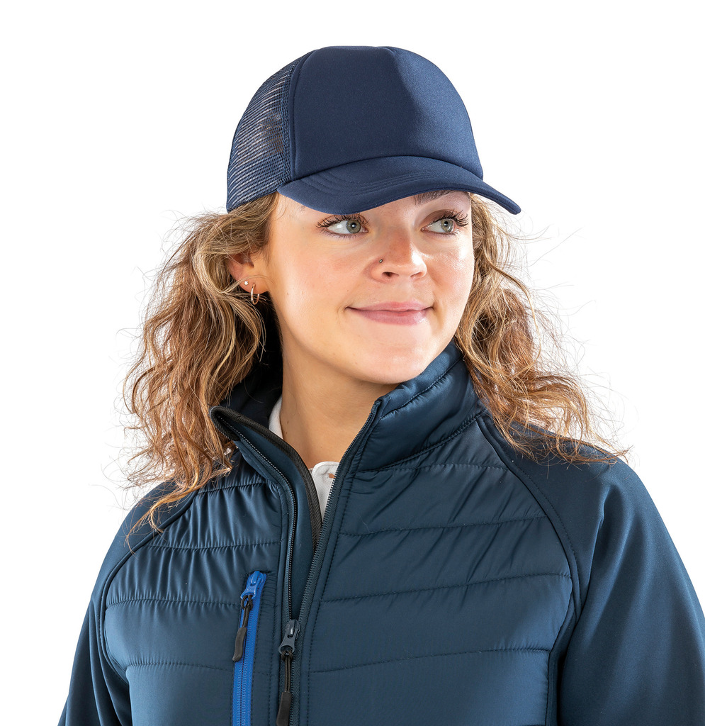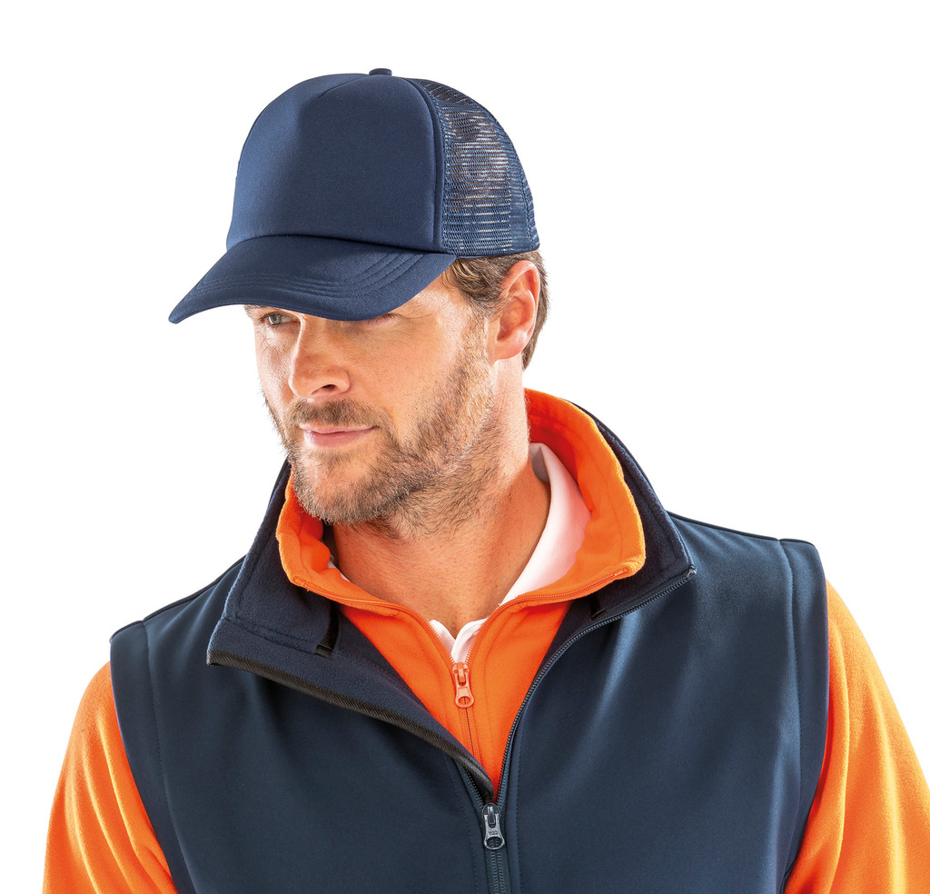 Enchimento 100% poliéster. 5 painéis: 4 em rede e 1 em tecido. Painel frontal branco. Ajustável por fivela de plástico retro Snapback. Pala semicurva em tecido. Lavável à mão.