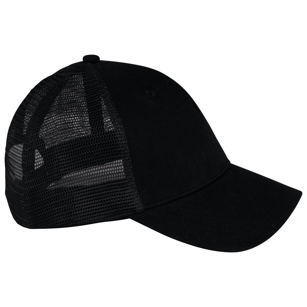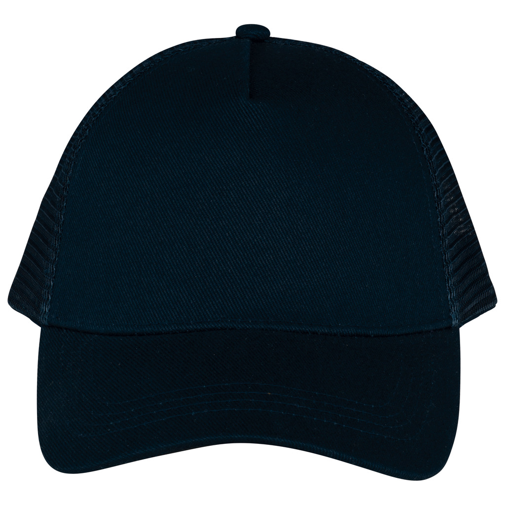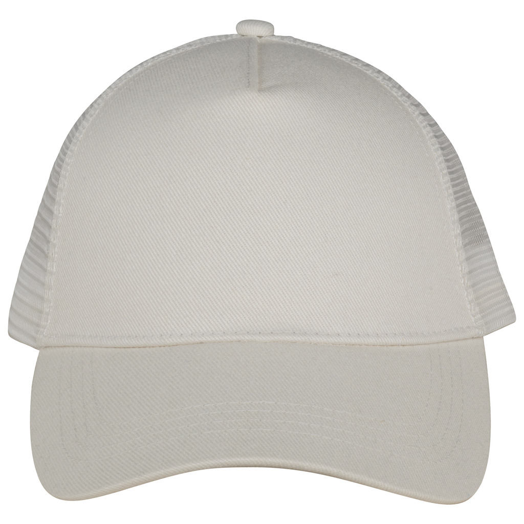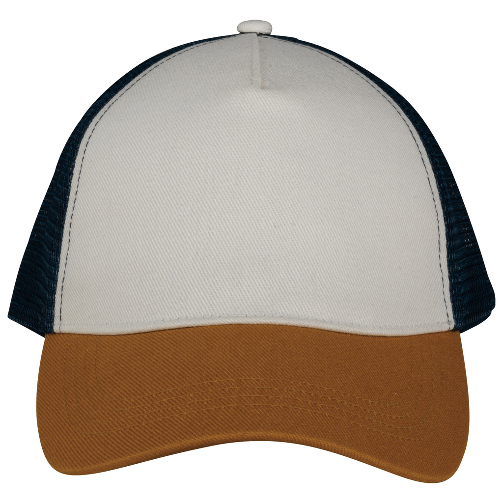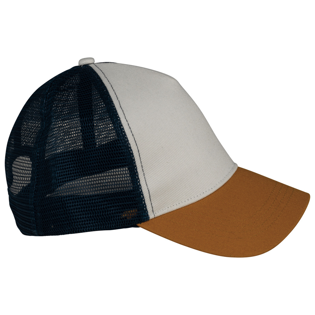 Pala e painel frontal em 100% algodão biológico. Painéis traseiros em rede 100% poliéster reciclado. Twill e rede. Boné 5 painéis ajustável com ajuste traseiro em plástico reciclado. Pala com pespontos. Painel frontal com reforço. Interior com acabamento em viés.