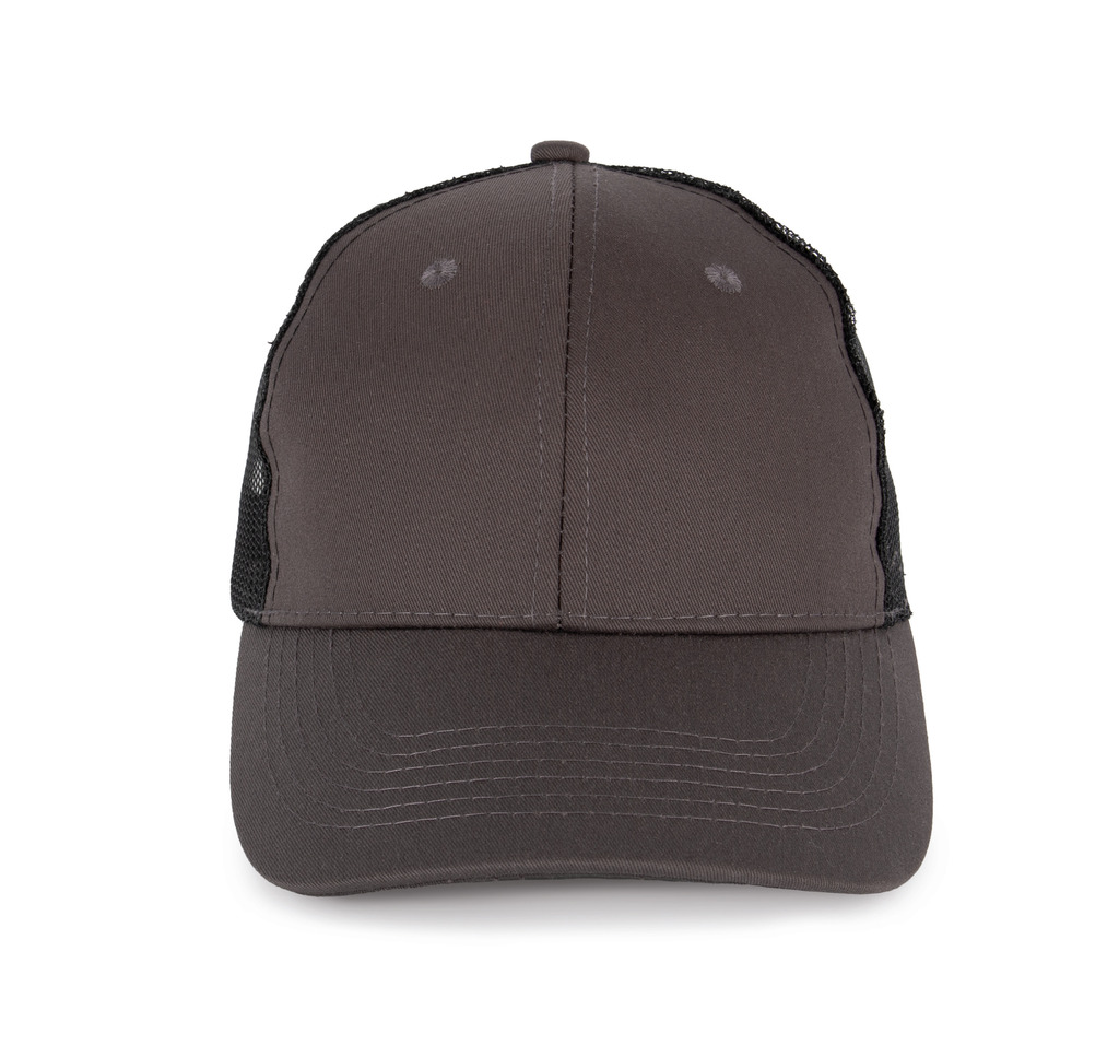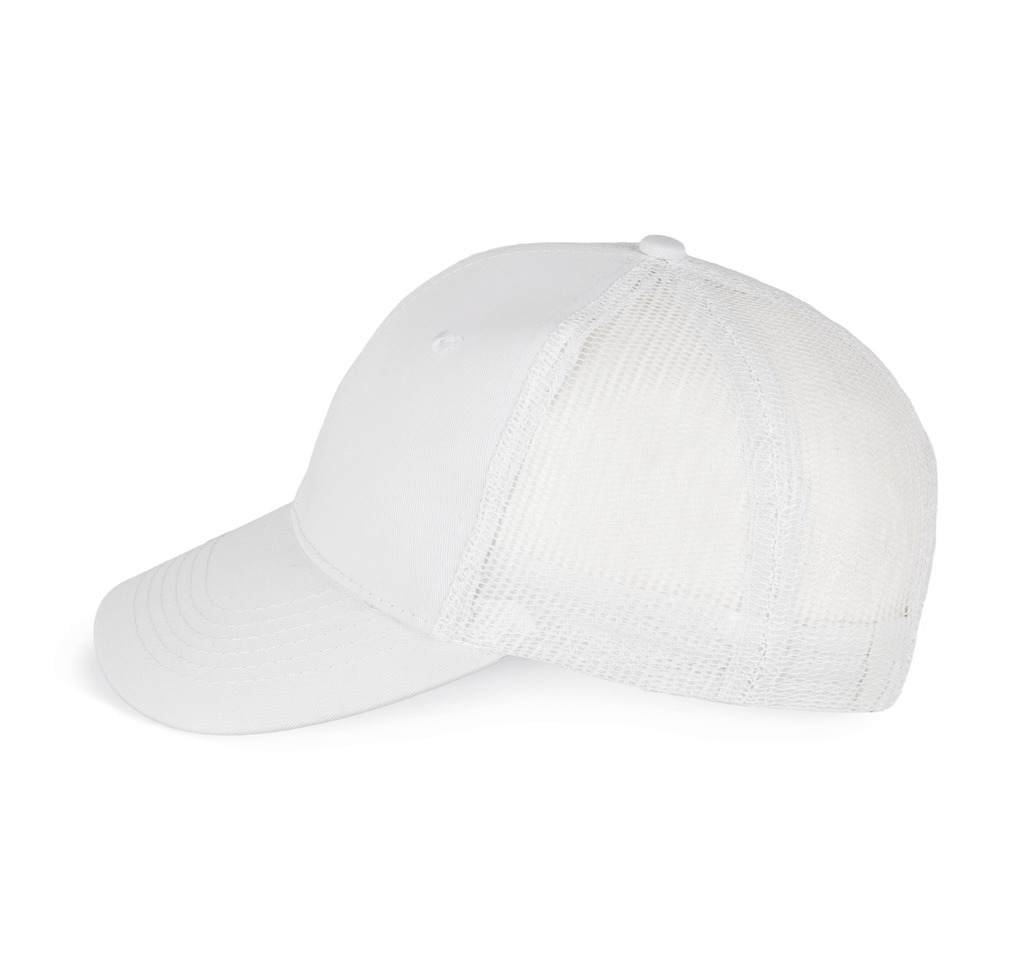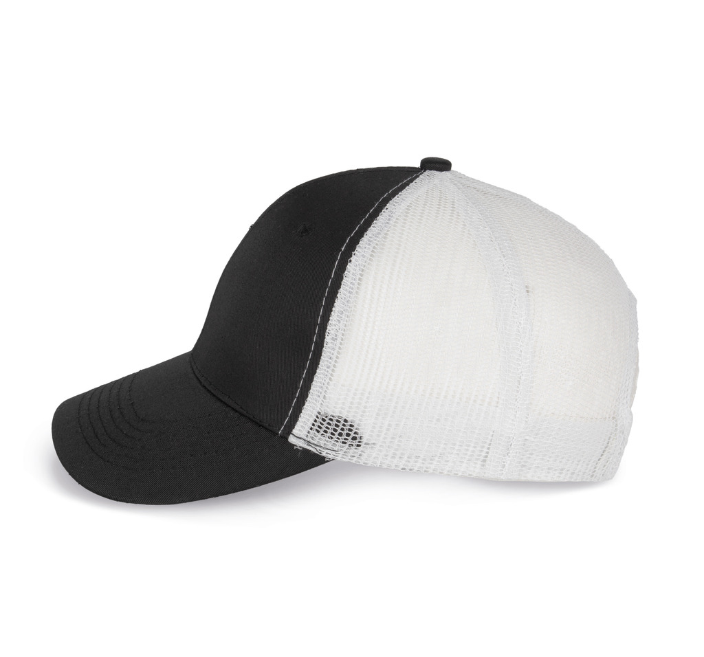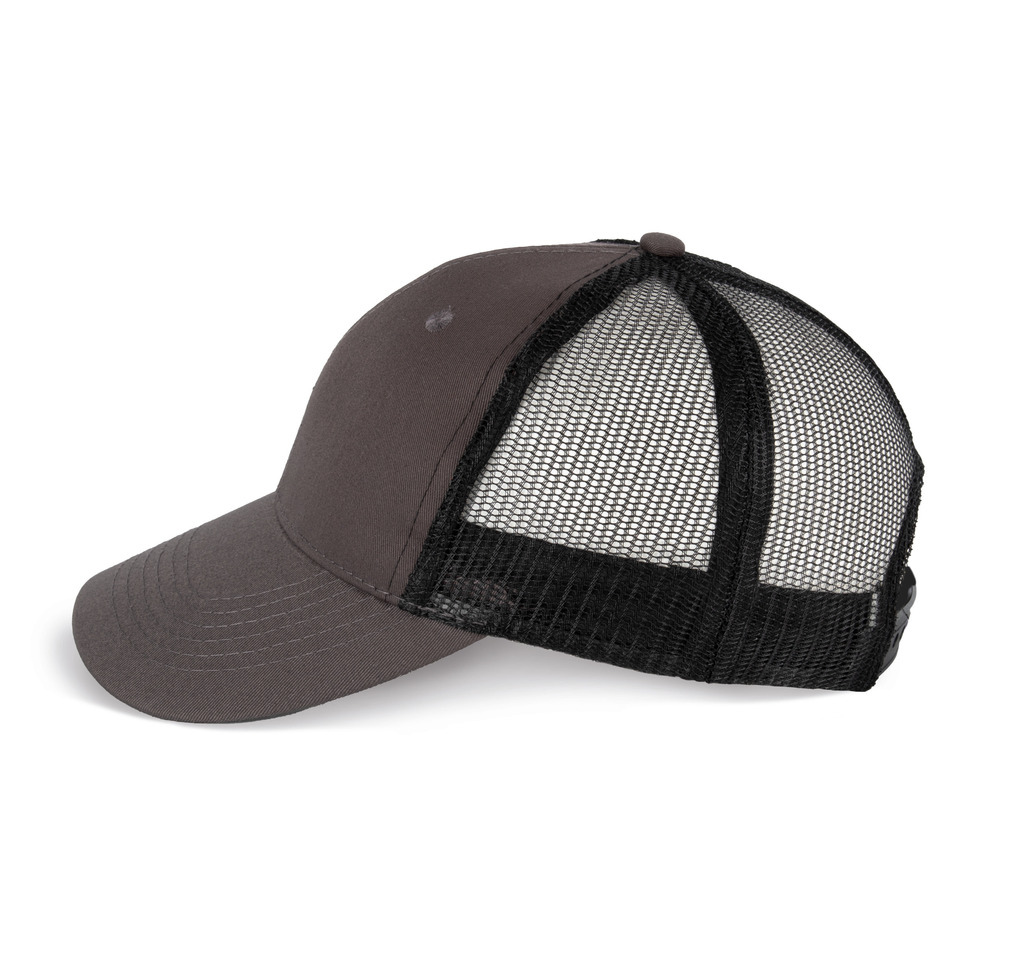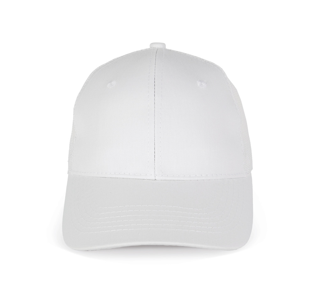 65% algodão/35% poliéster. Boné Trucker com 6 painéis com pala de perfil médio e painel frontal reforçado à cor.