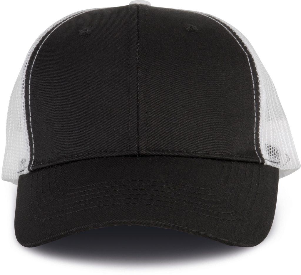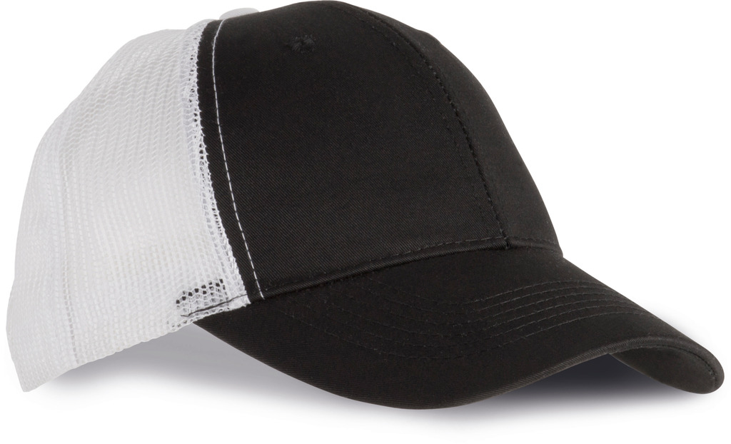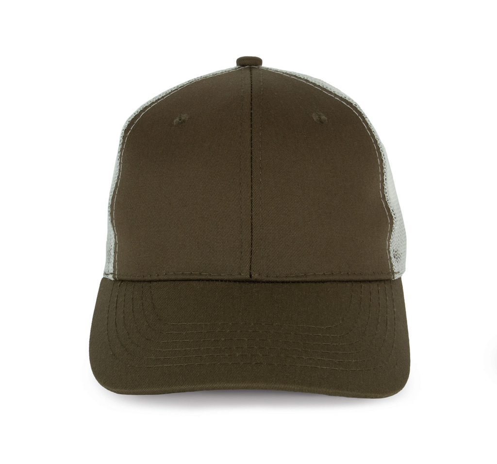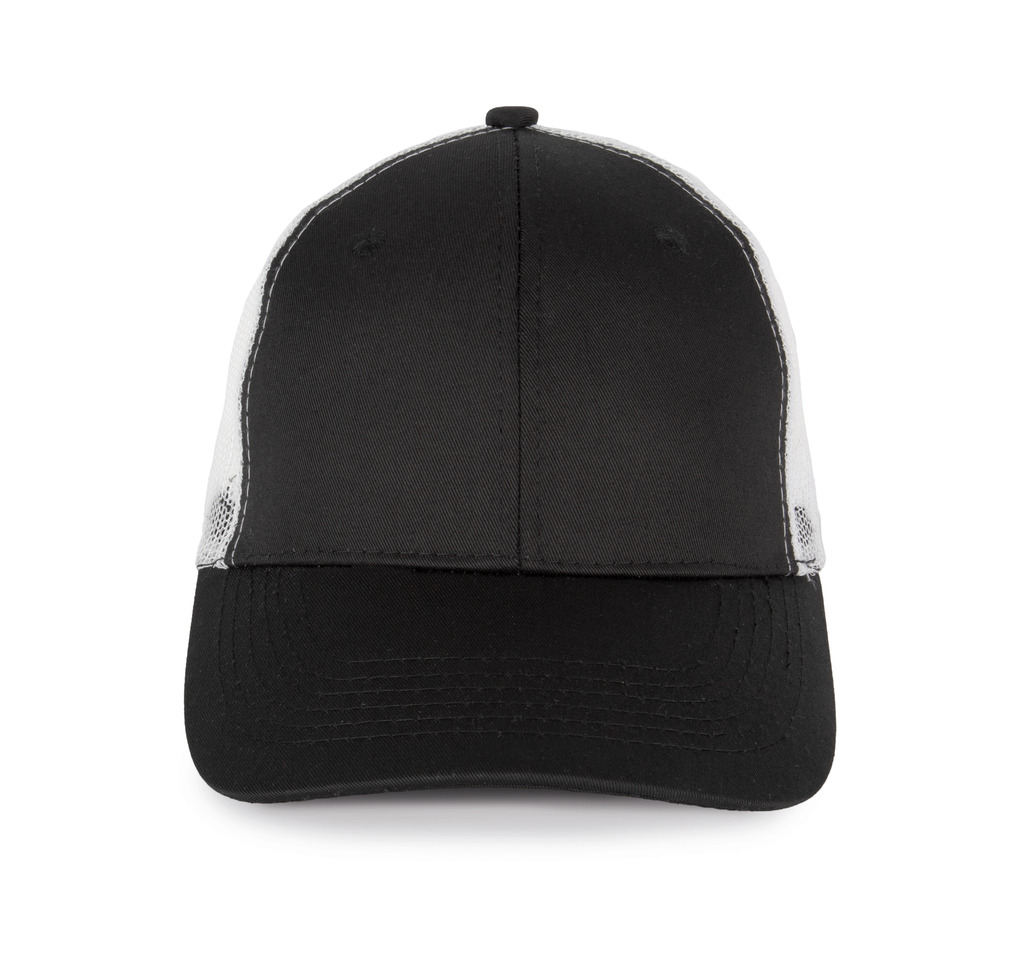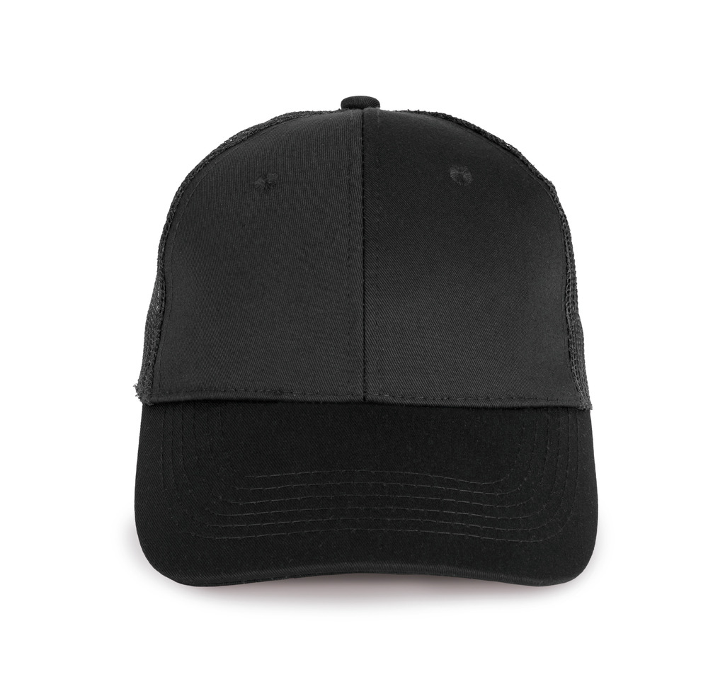 65% algodão/35% poliéster. Boné Trucker com 6 painéis com pala de perfil médio e painel frontal reforçado à cor.