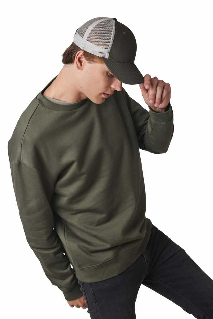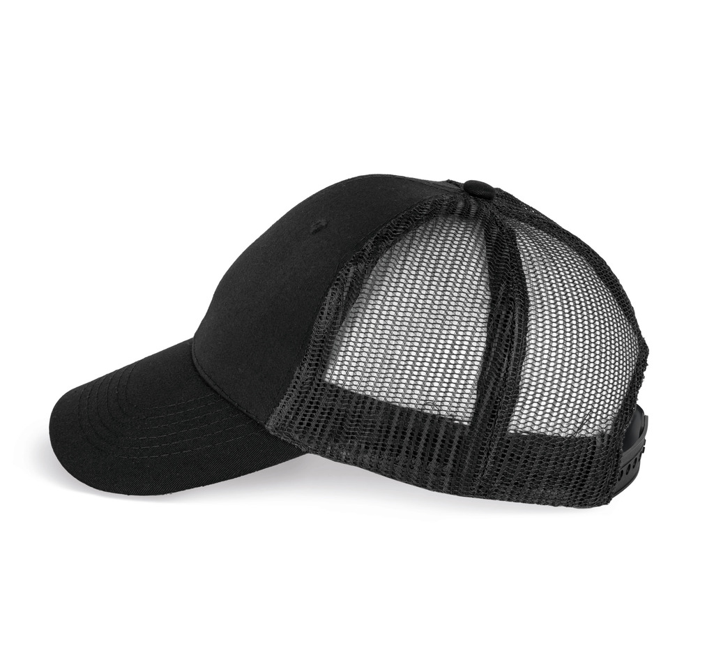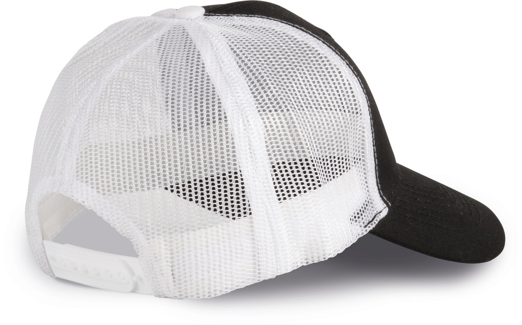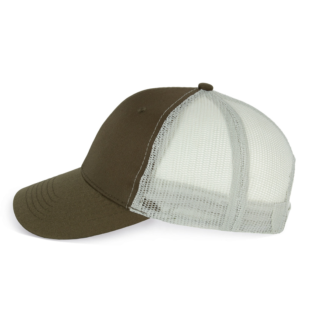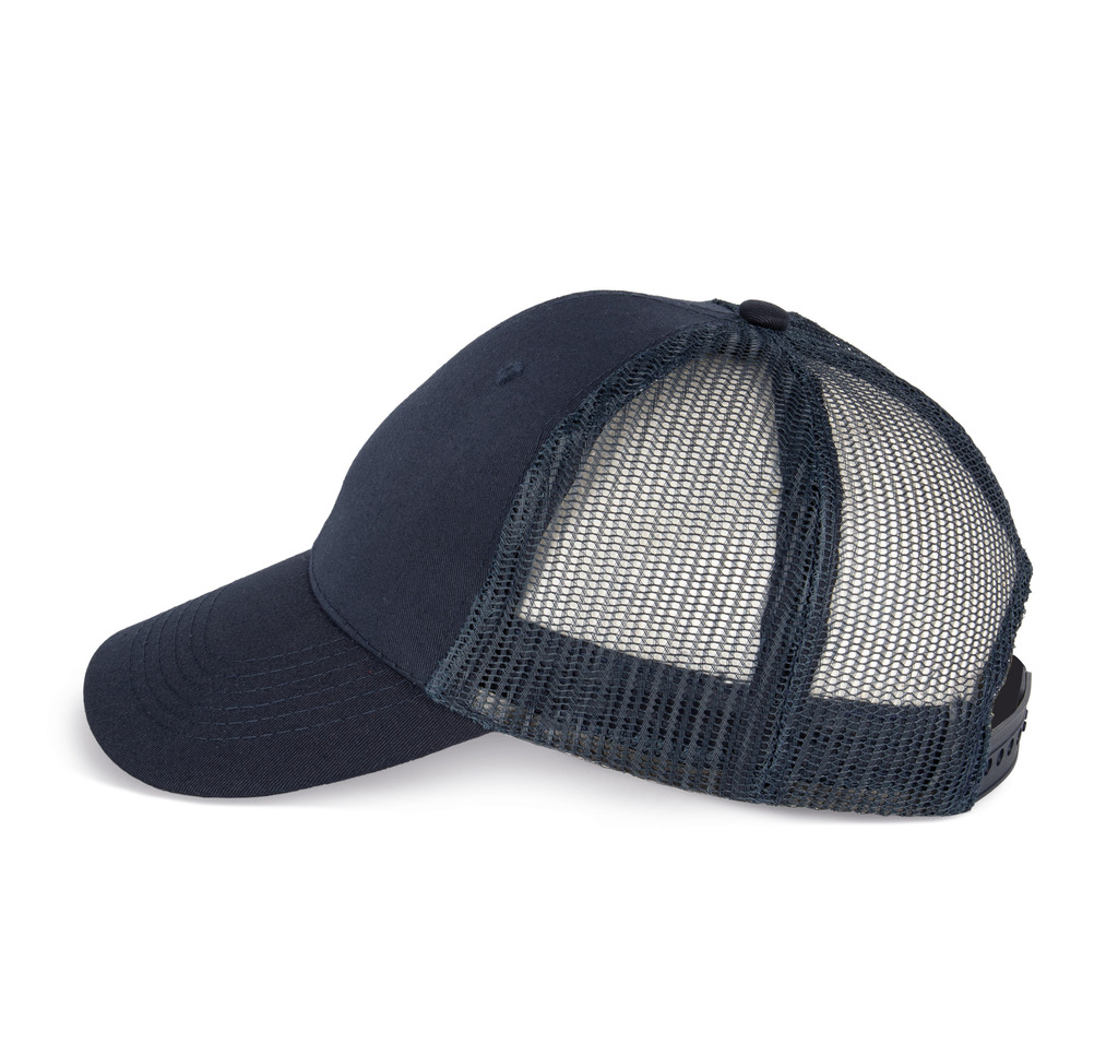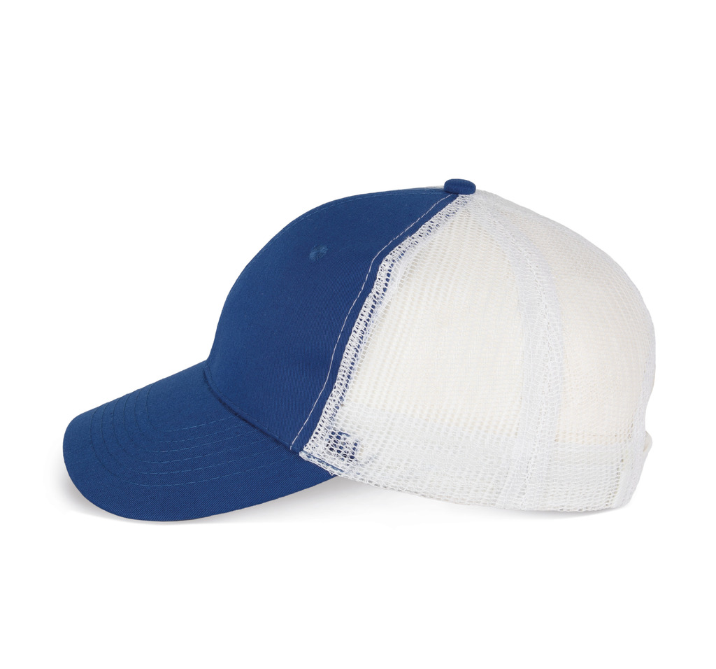 65% algodão/35% poliéster. Boné Trucker com 6 painéis com pala de perfil médio e painel frontal reforçado à cor.