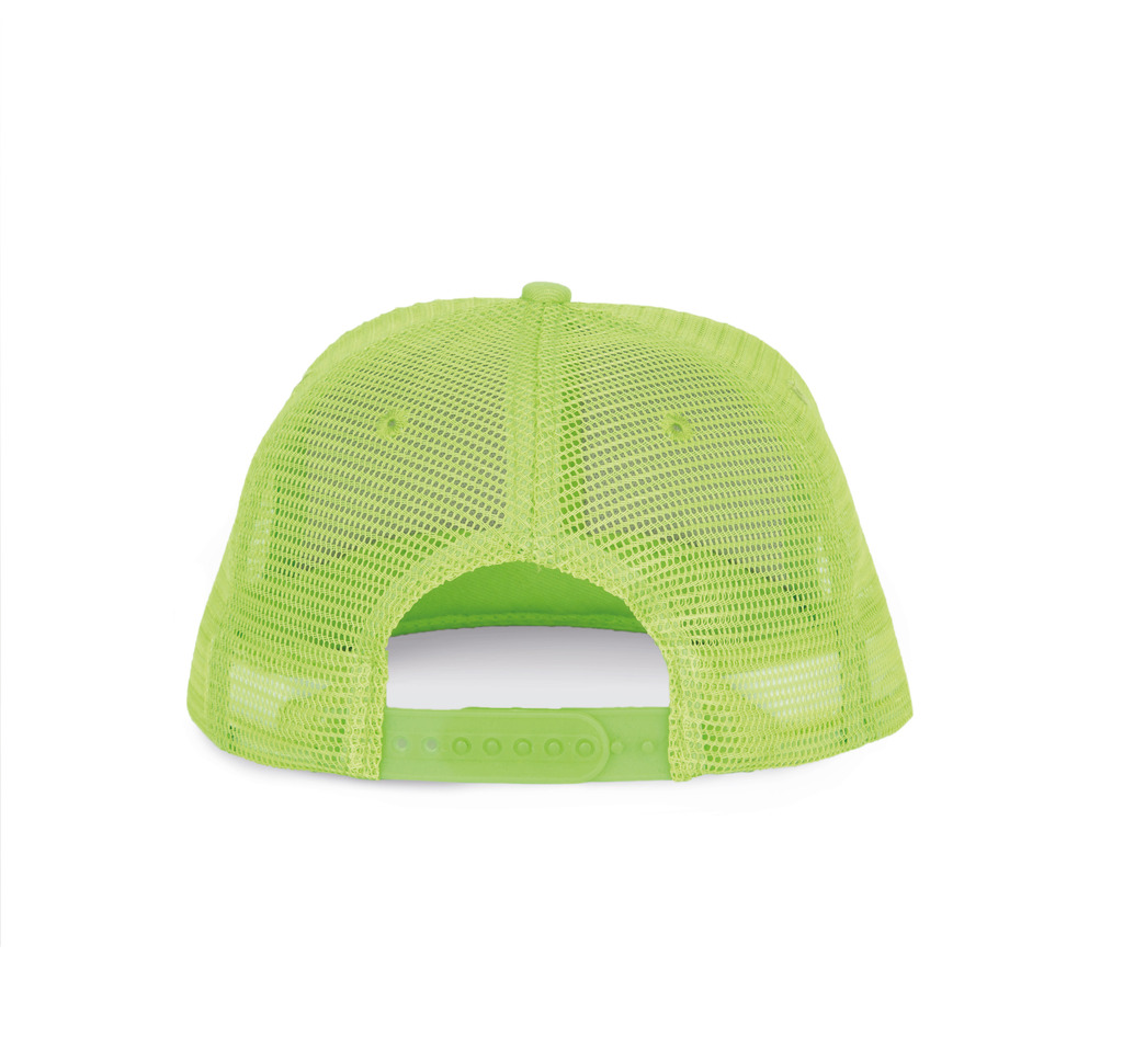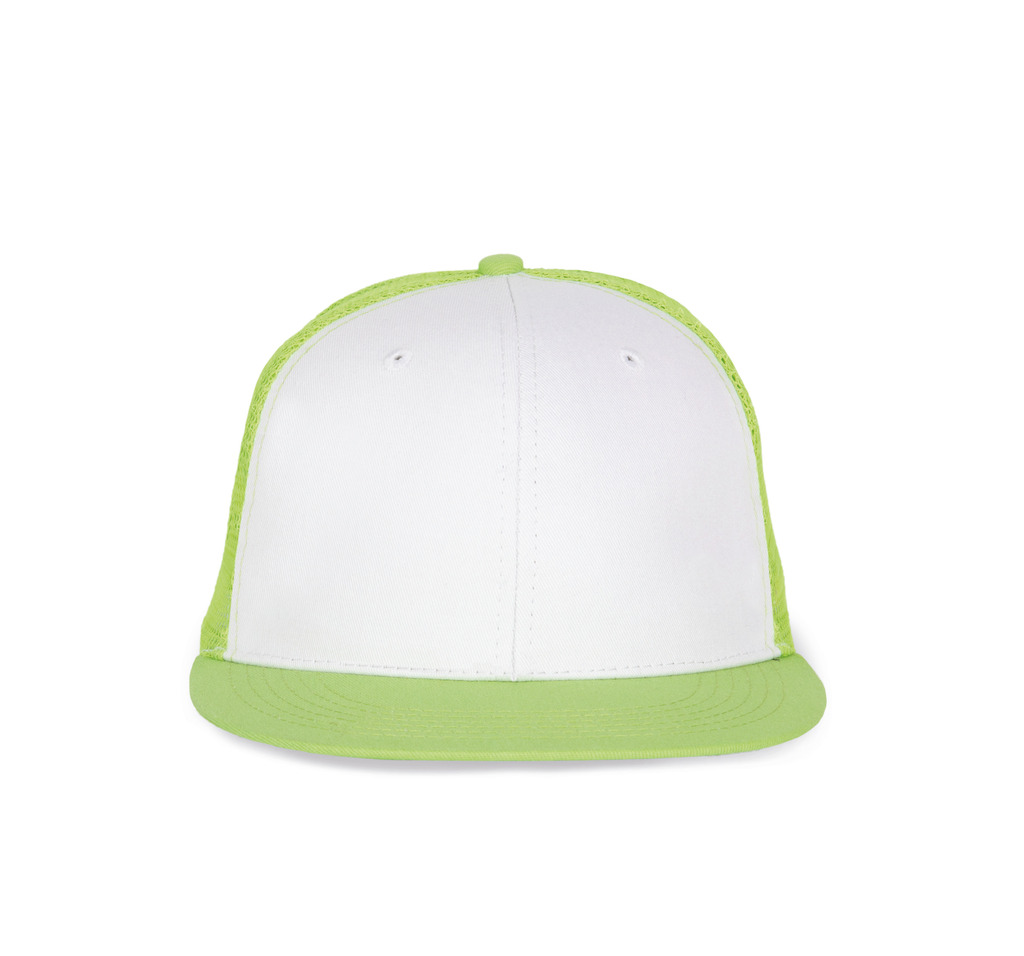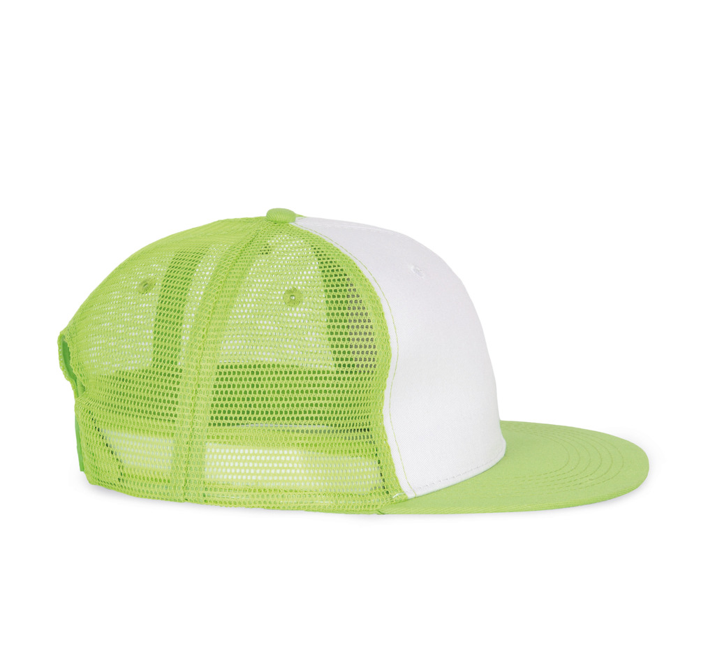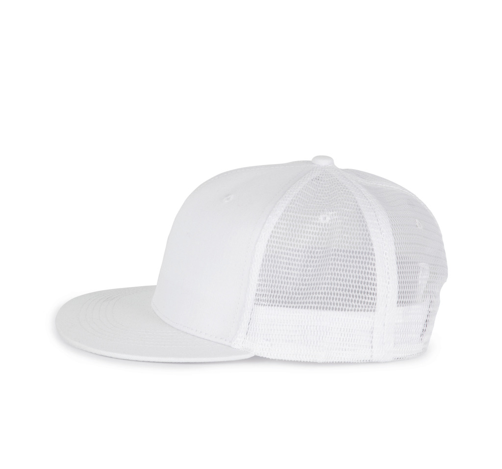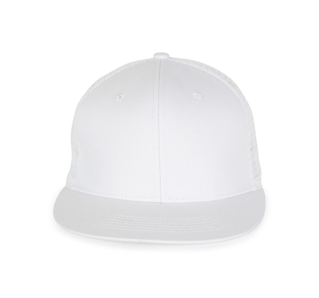 Boné com 6 painéis 100% algodão e malha em rede 100% poliéster. Pala direita. Banda em algodão para absorver o suor. Fivela de ajuste em plástico.