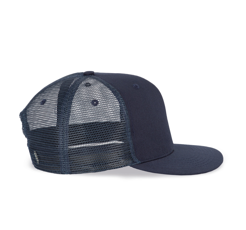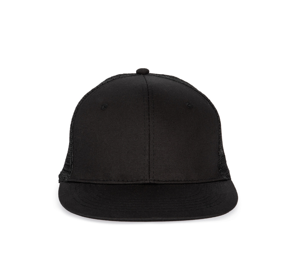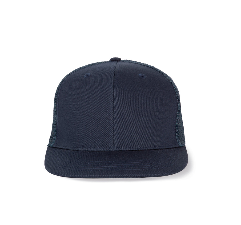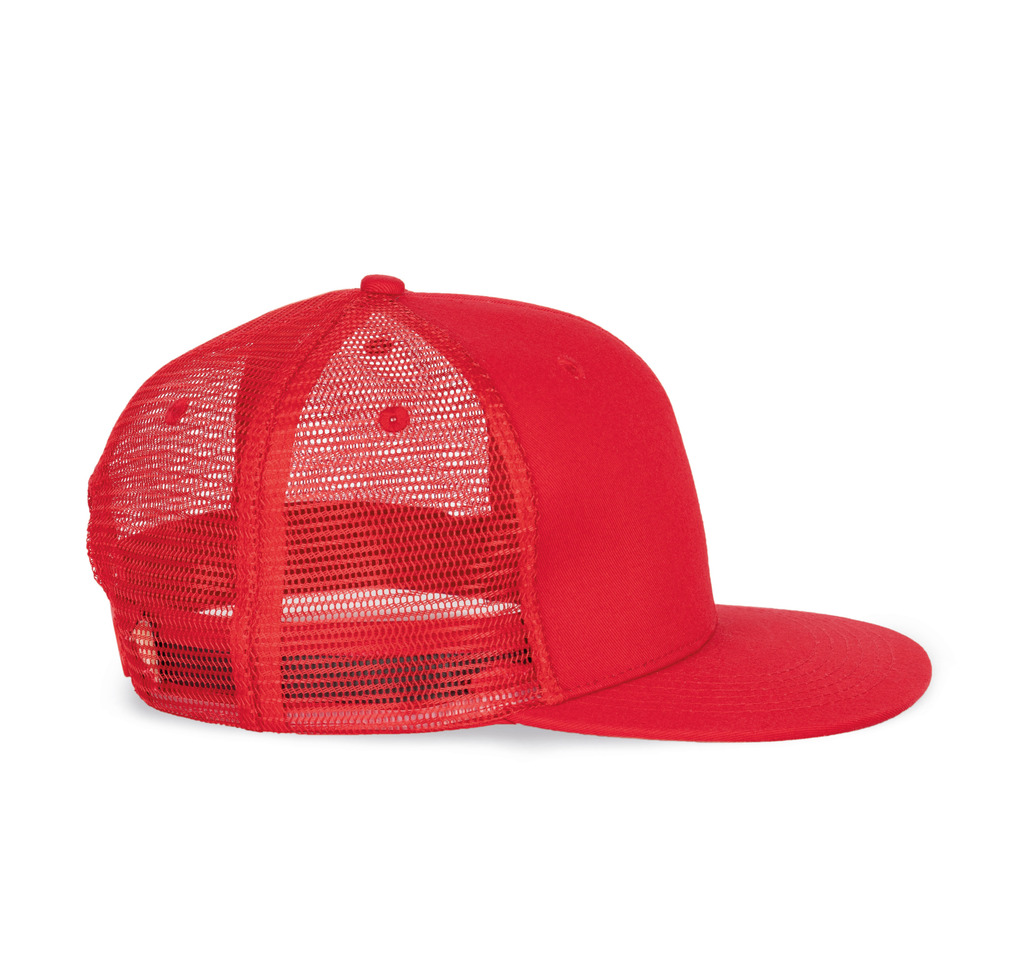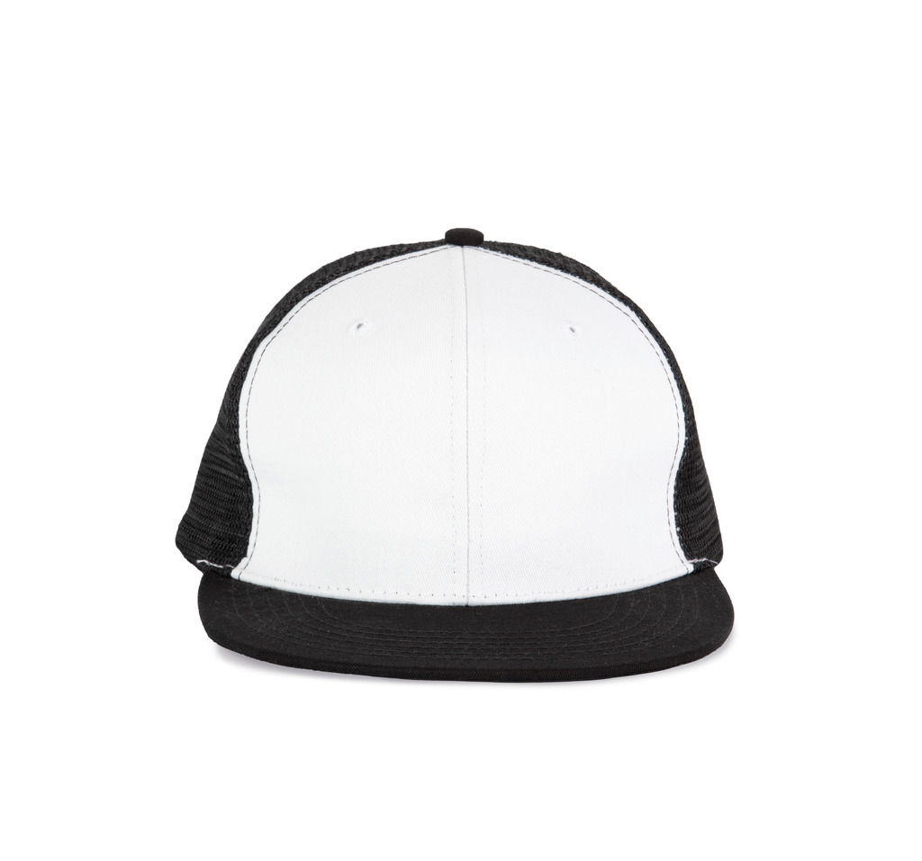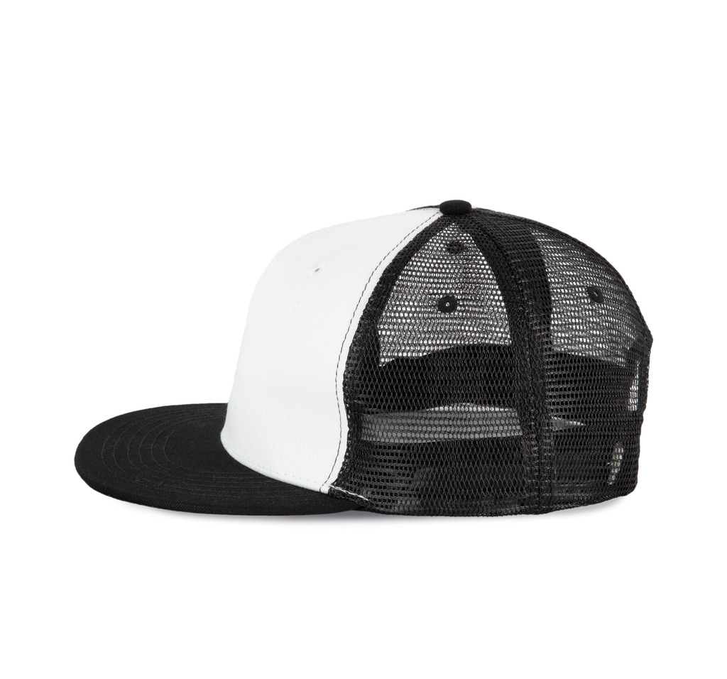 Boné com 6 painéis 100% algodão e malha em rede 100% poliéster. Pala direita. Banda em algodão para absorver o suor. Fivela de ajuste em plástico.