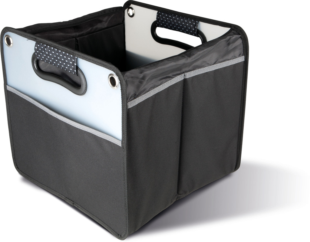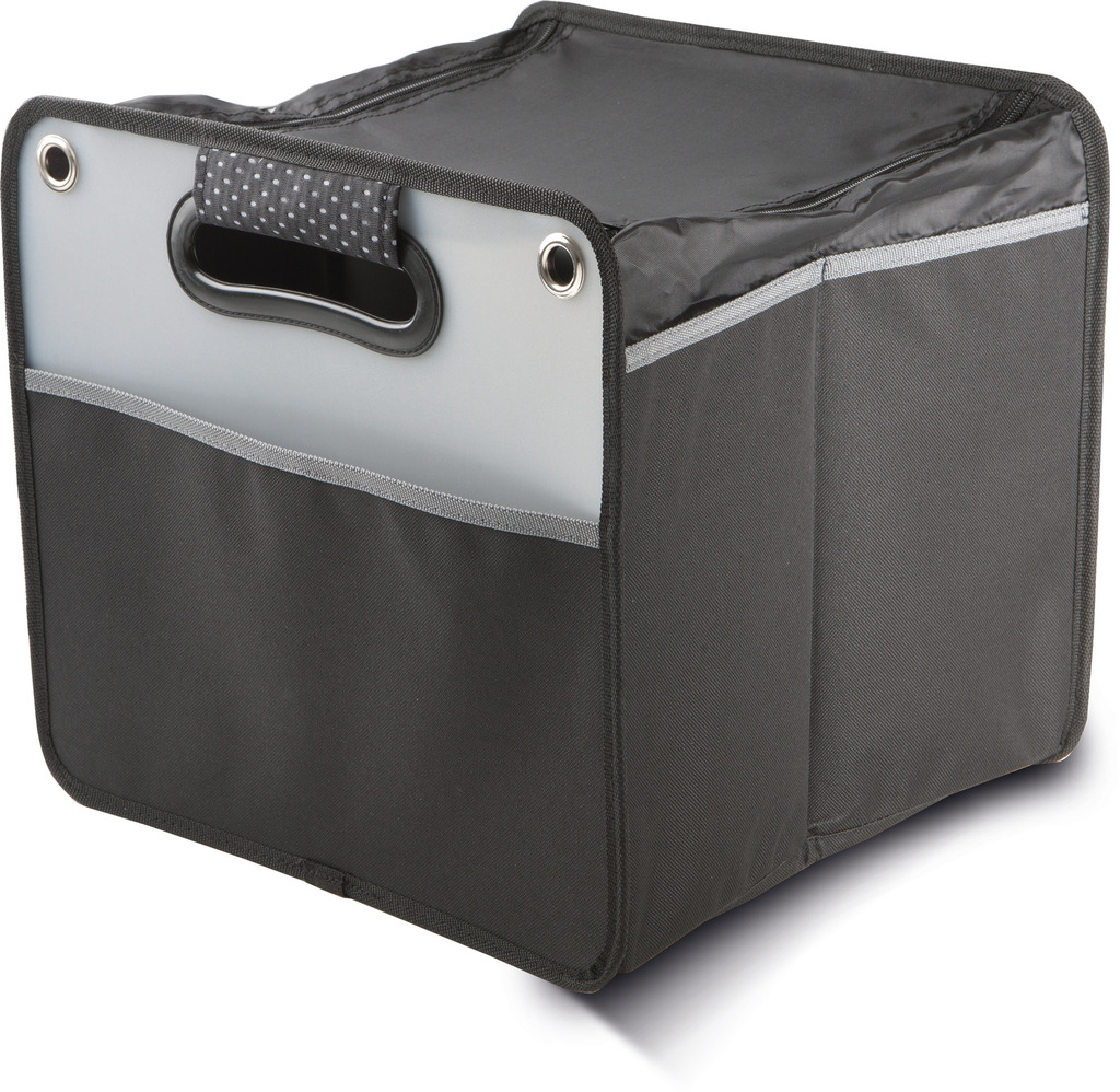 Caixa de arrumação dobrável em poliéster 600D, 1 compartimento grande com fecho, com bolso lateral, ilhós na lateral.