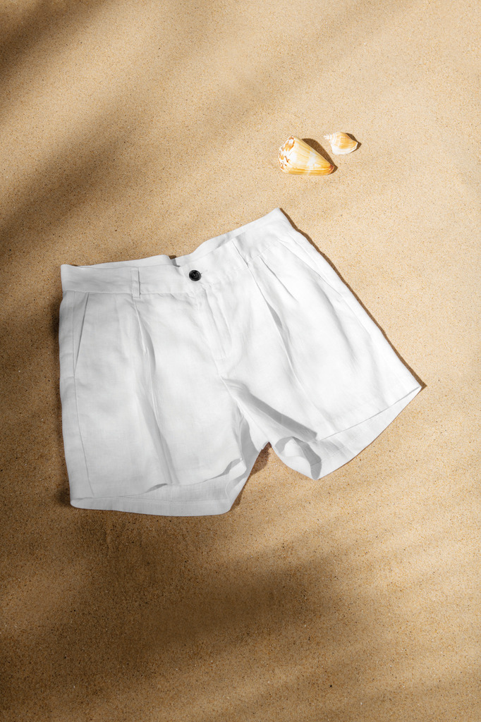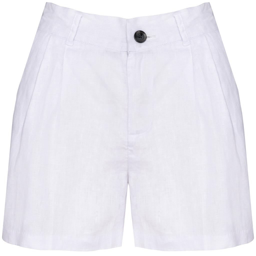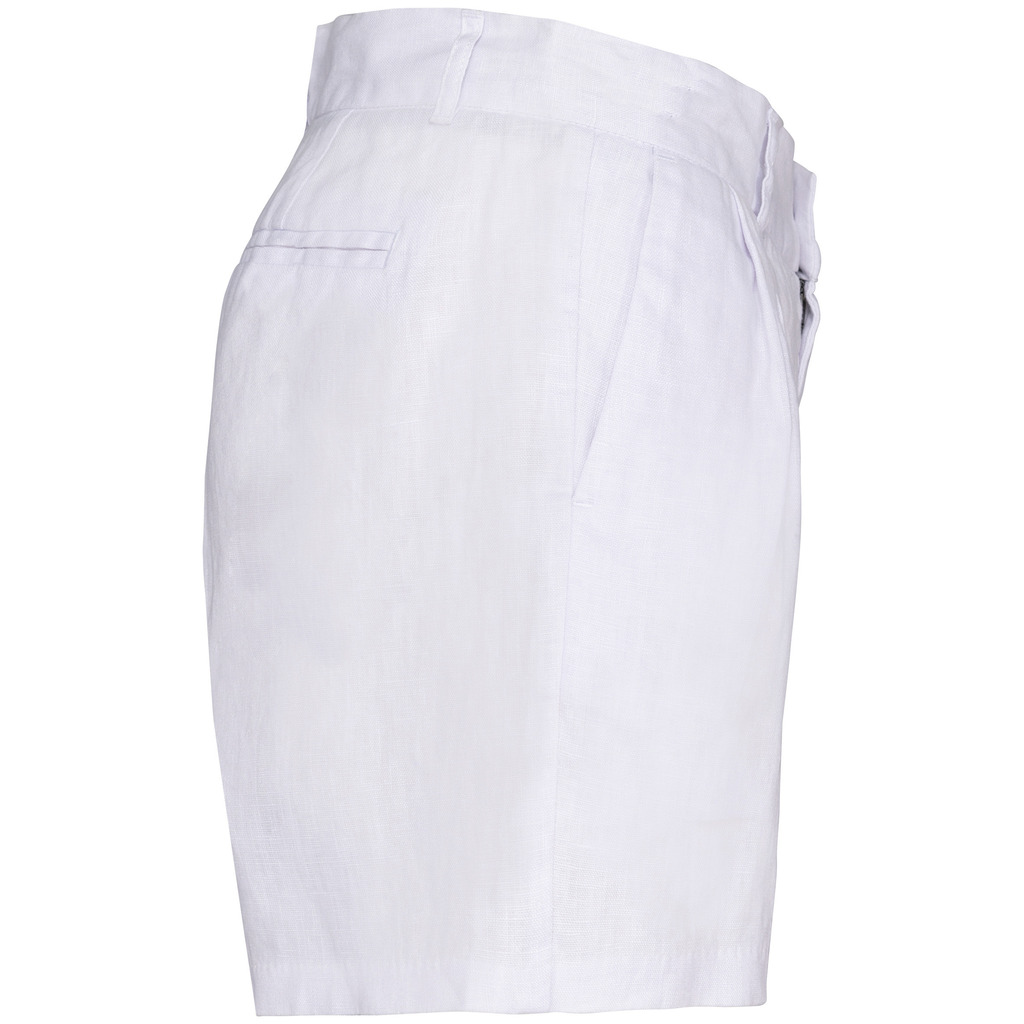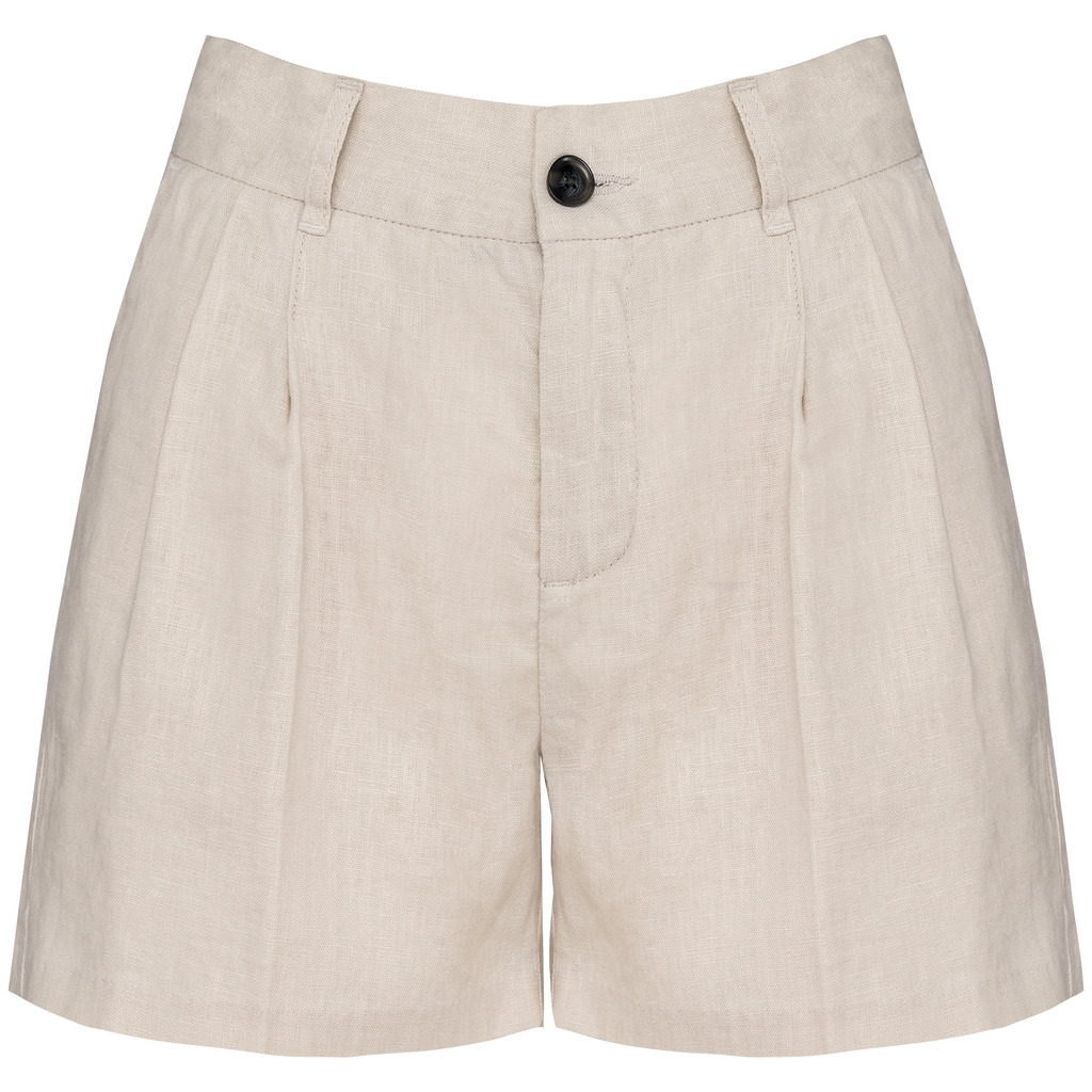 100% linho. Tecidos. Cintura com presilhas. Acabamento interior da cintura em contraste de cor azul marinho na cor Linen Sand e tom sobre tom na cor White. Braguilha com botão em plástico reciclado e fecho em metal reciclado. Duas pinças frontais com uma pinça permanente nas pernas na parte frontal e traseira. Dois bolsos frontais e dois bolsos falsos com pesponto nas costas. Fundo dos bolsos frontais em chevron tom sobre tom. Pesponto frontal e traseiro para maior reforço. Acabamento das pernas com bainha invisível. Peça lavada após montagem: as cores podem variar de produto para produto.