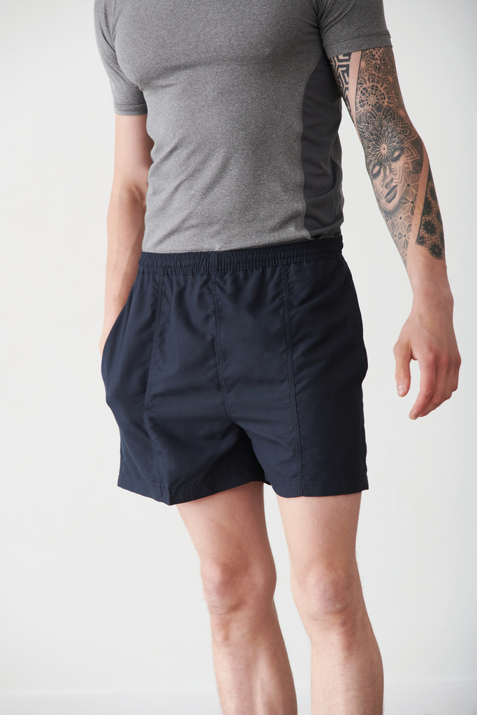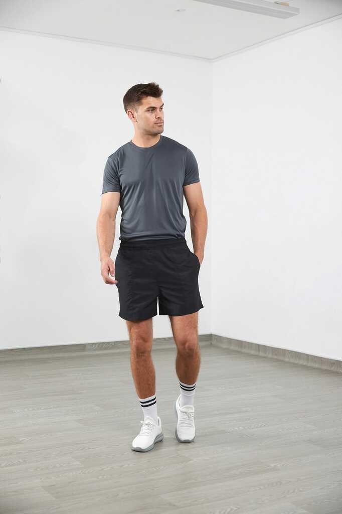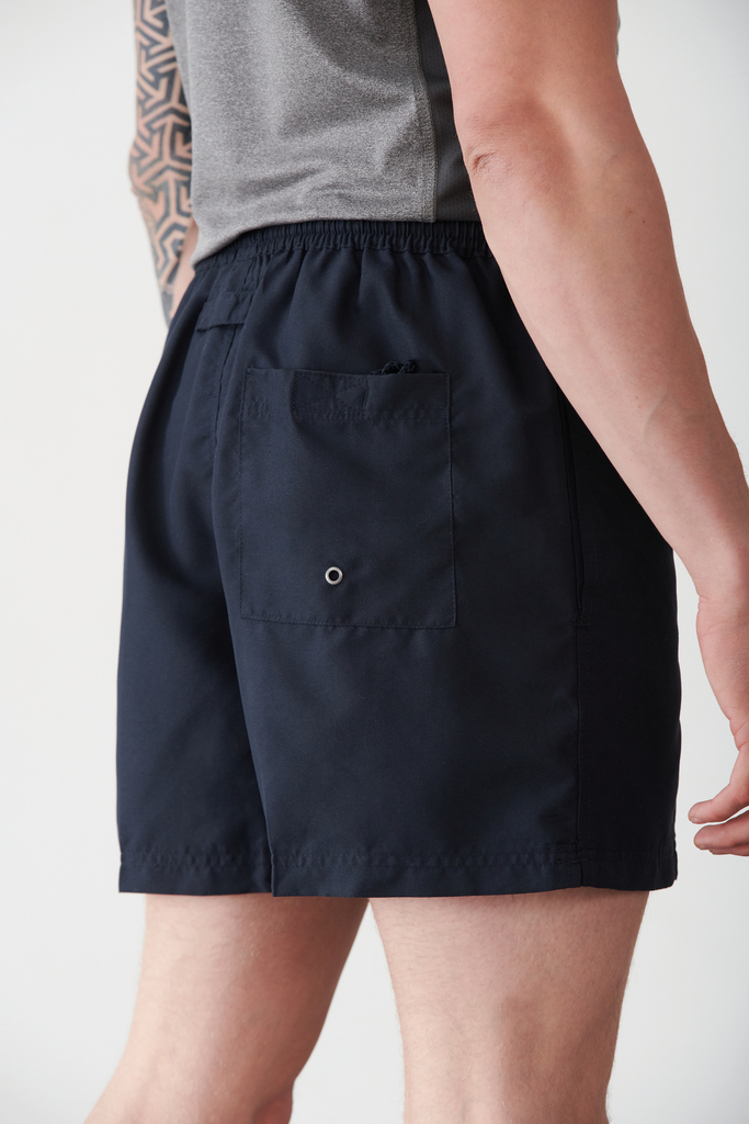 100% poliéster microfibra. Cintura elástica com cordão de ajuste. Bolsos laterais. Bolsos traseiros com fecho em velcro e ilhó para arejamento. Forro em rede. Acabamento com costura dupla. Podem ser usados como calções de praia.