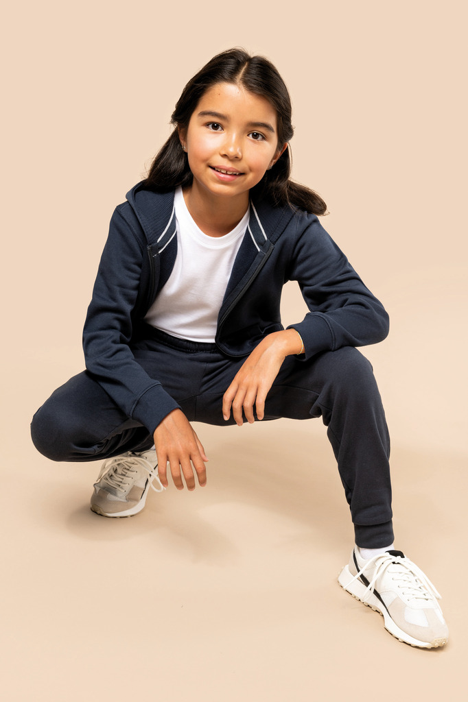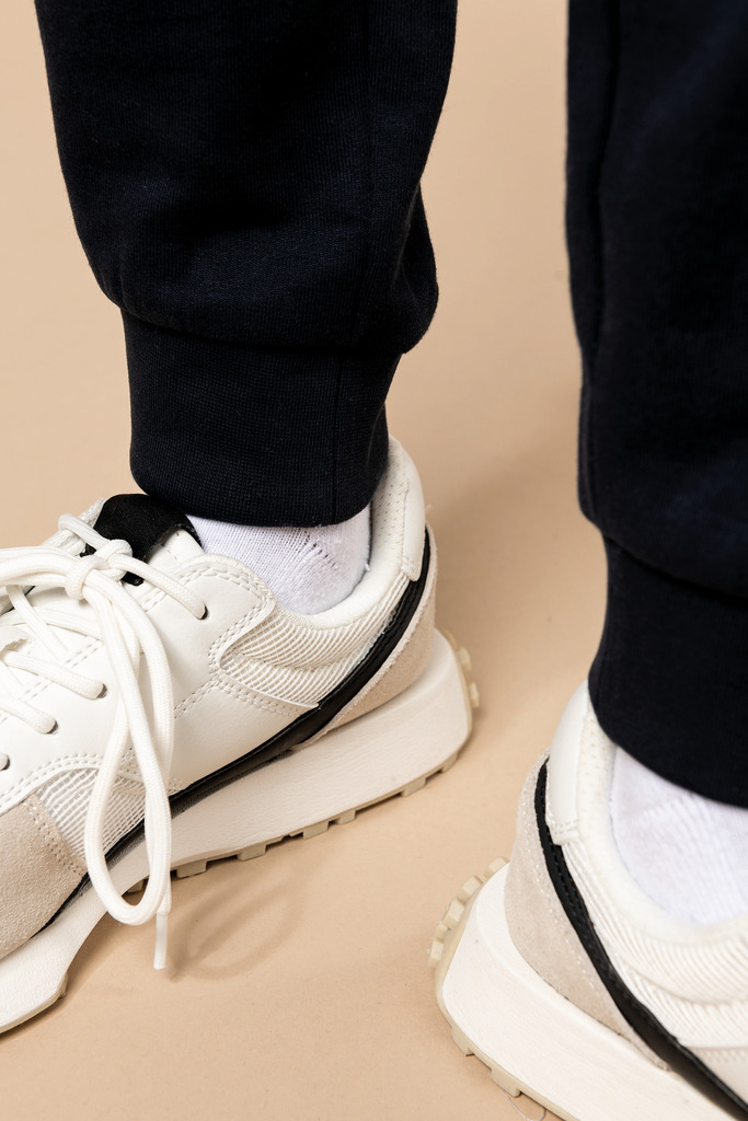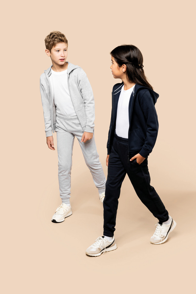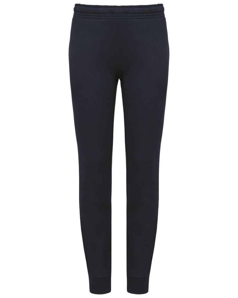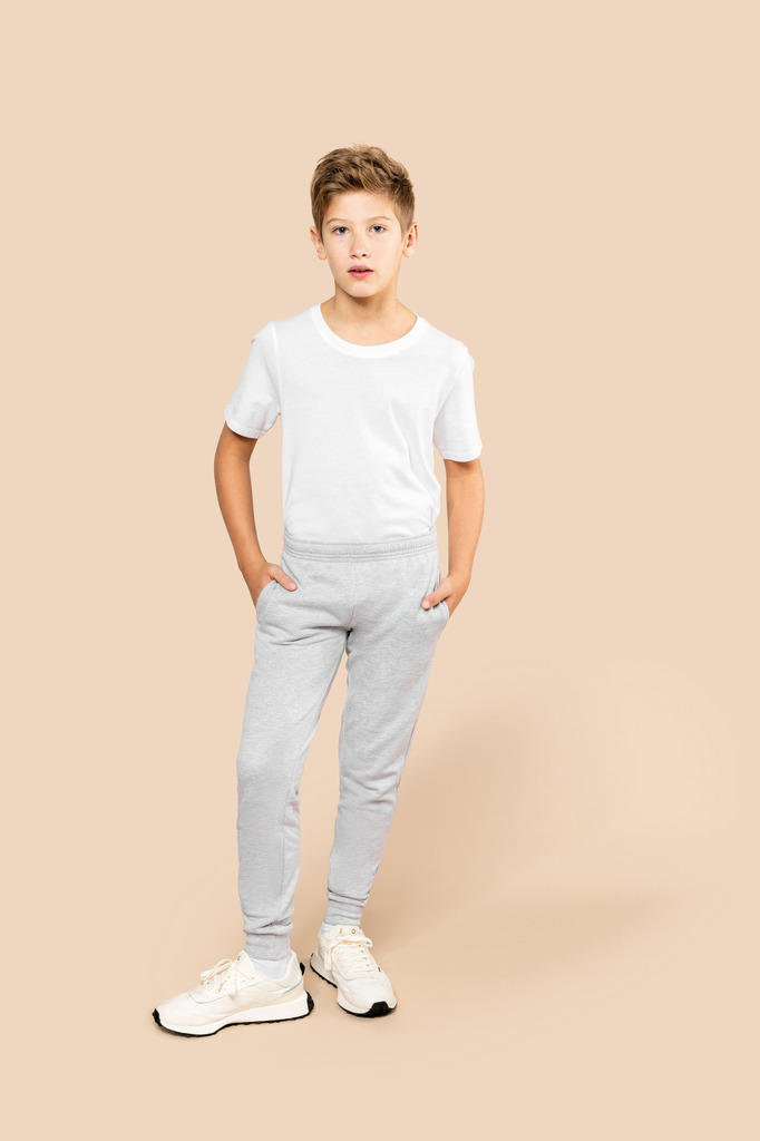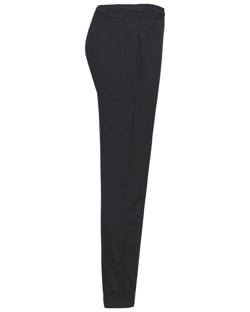 80% algodão / 20% poliéster. Interior cardado 2 fios. Corte direito. 2 bolsos laterais. Cintura elástica com cordão de ajuste plano. Acabamento da perna em malha rib.