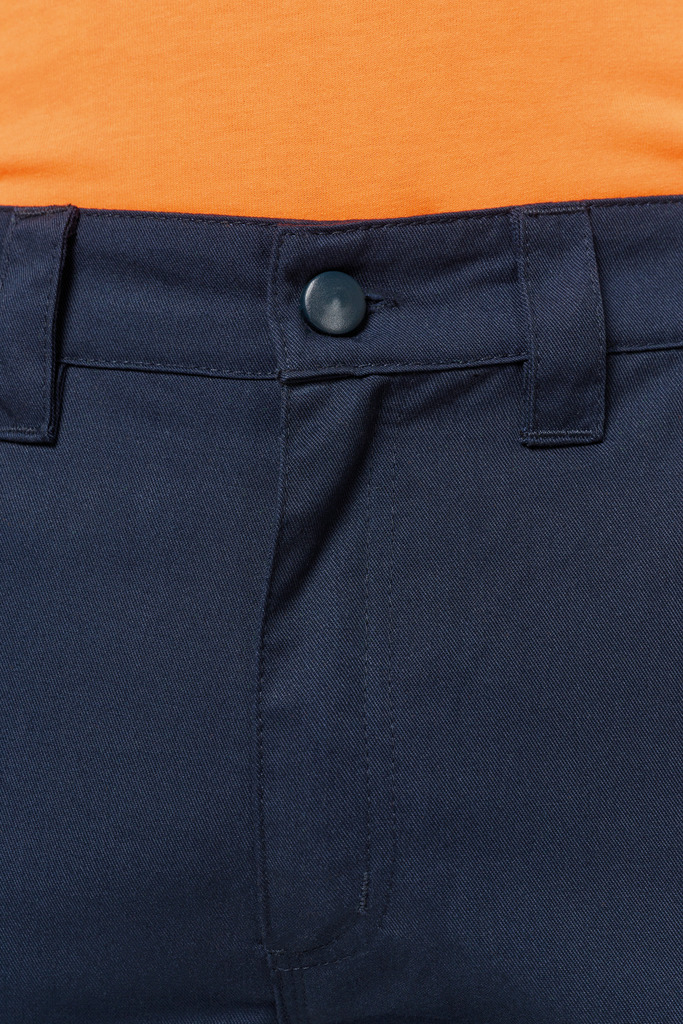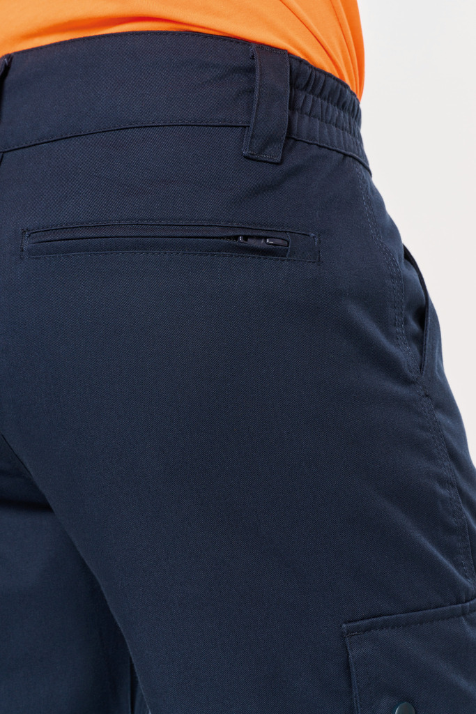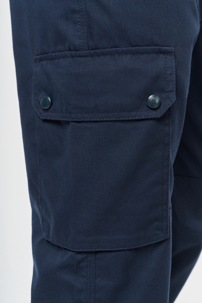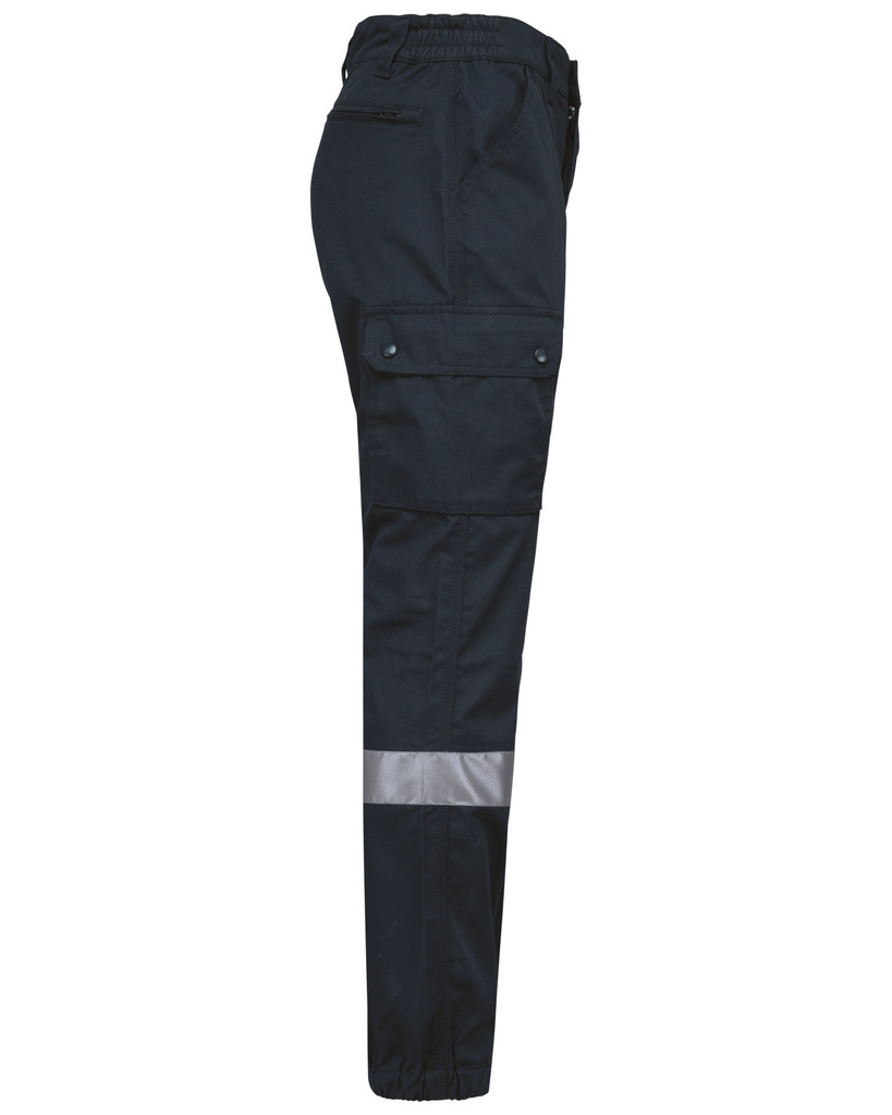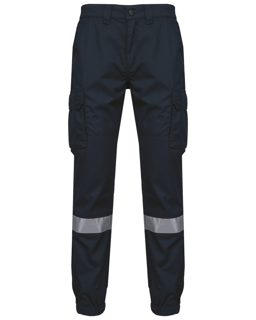 65% poliéster/35% algodão. Tecido de sarja. Lavagem a 60 °C. Corte direito. 2 bolsos frontais. 2 bolsos laterais com fole e pala com molas de pressão. 1 bolso traseiro com fecho. Encaixes de reforço nos joelhos no tecido principal tom sobre tom. Cintura elástica com presilhas reforçadas, sendo a mais alta no meio (8 cm). Fecho e botão plástico. Tornozelos elásticos. A faixa retrorrefletora é certificada pela norma EN17353:2020 até 30 ciclos de lavagem a 60 °C. Pesponto triplo entrepernas, nas laterais e gancho na zona frontal e traseira para maior resistência. Etiqueta de marca amovível.