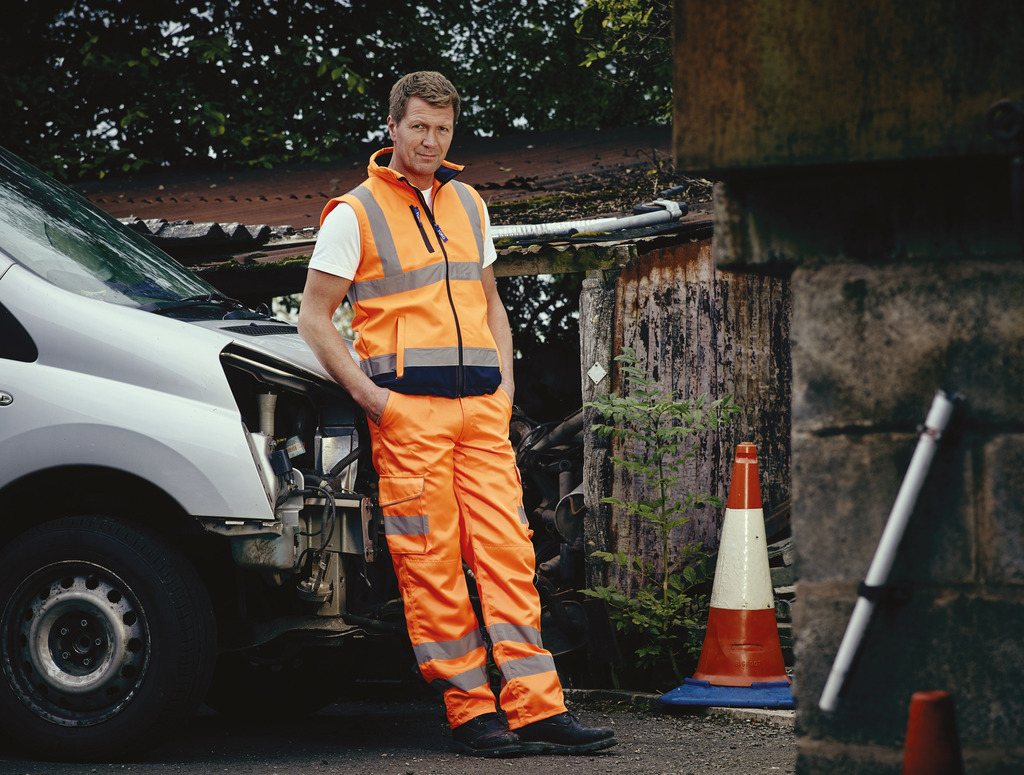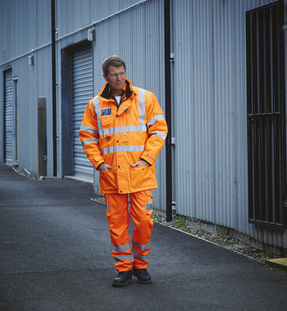 80% poliéster/20% algodão com tratamento repelente à água de longa duração. 2 faixas reflectoras 3M (5 cm de largura) na perna. 2 bolsos cargo com faixa reflectora e acabamentos reflectores. Bolsos nos joelhos com fecho invisÃvel. Bolso com botão na parte traseira. Cintura semielástica com 5 presilhas para cinto. Puxador e botão à cor.Em conformidade com a norma EN ISO20471:2013 de categoria 1 e a norma relativa ao «Vestuário de alta visibilidade» dos caminhos-de-ferro UK GO/RT 3279 norma 8:2013 (somente na cor Hi Vis Orange).