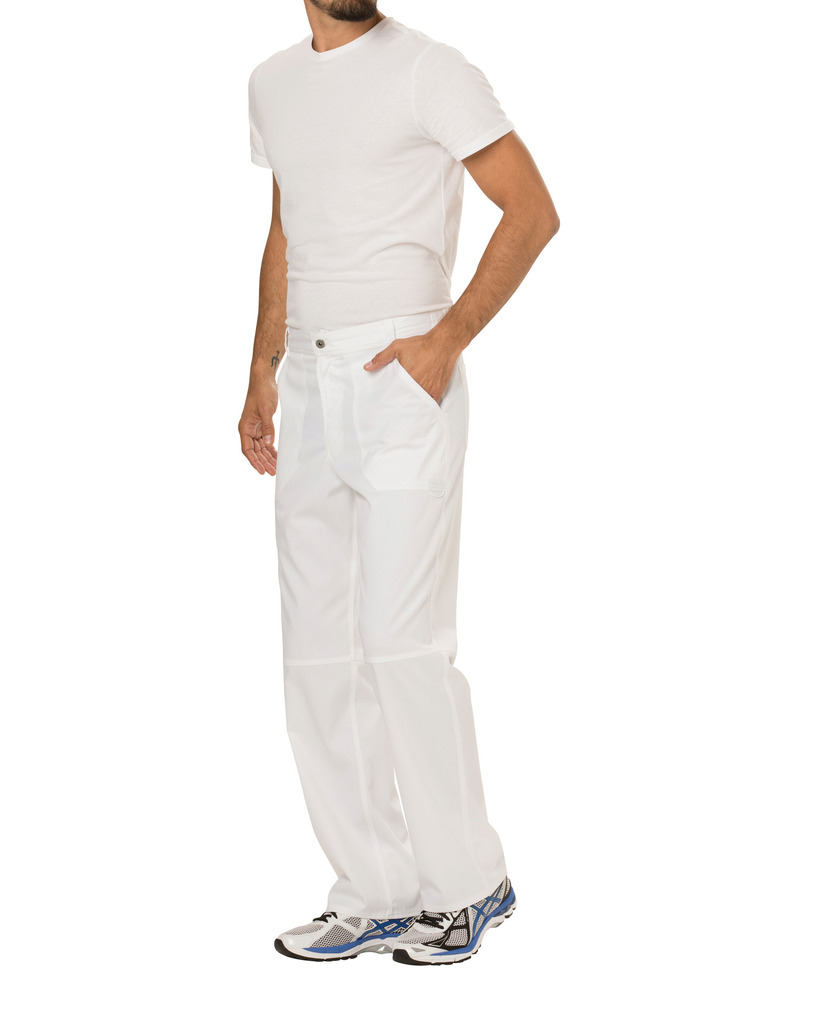 78% poliéster/20% viscose/2% elastano. Tecido sarja, Corte masculino. Cintura elástica nas costas com cordão de ajuste interior. Braguilha com fecho e botão. Cinco presilhas para o cinto. Sete bolsos: bolso cargo duplo, bolsos planos, bolsos traseiros, bolso para acesssório. Etiqueta com logo da marca com fivela elástica. Perna afunilada, abertura 48 cm.
