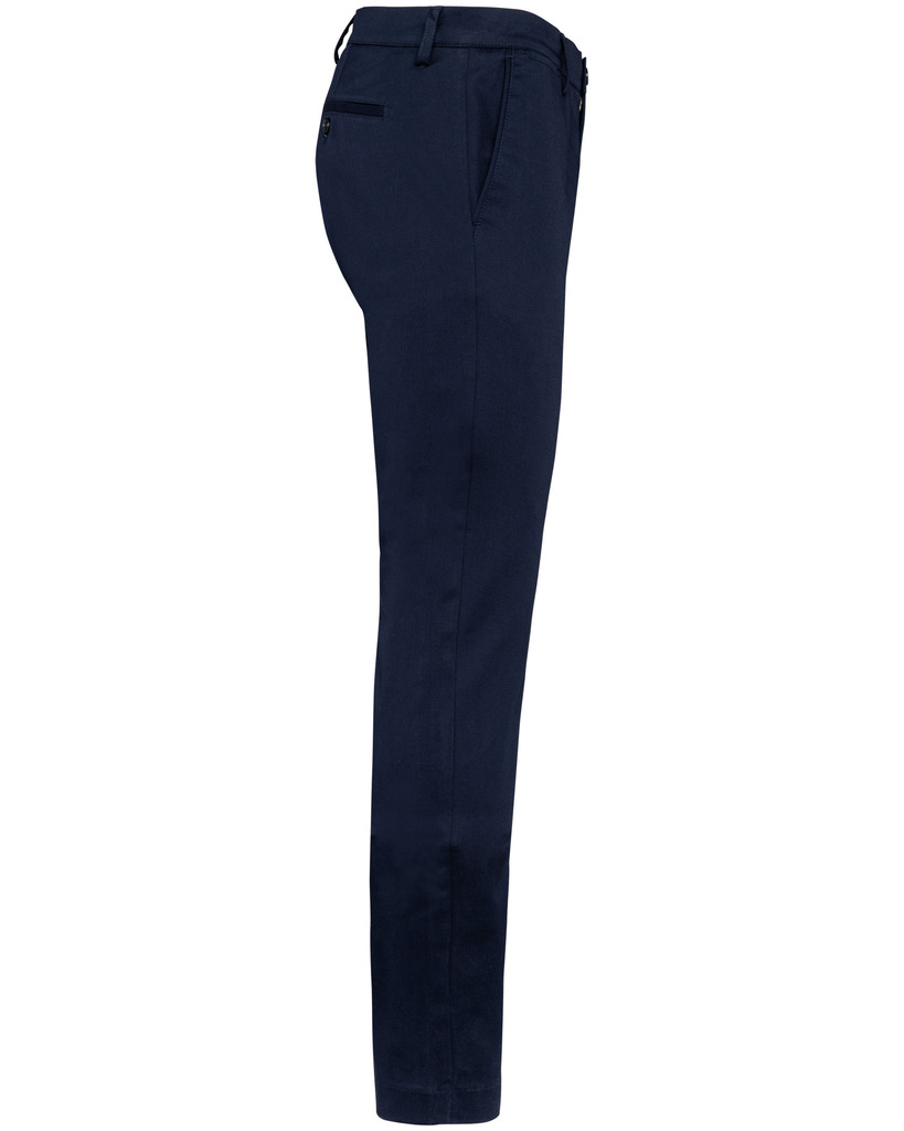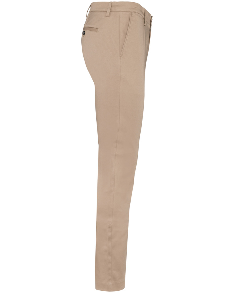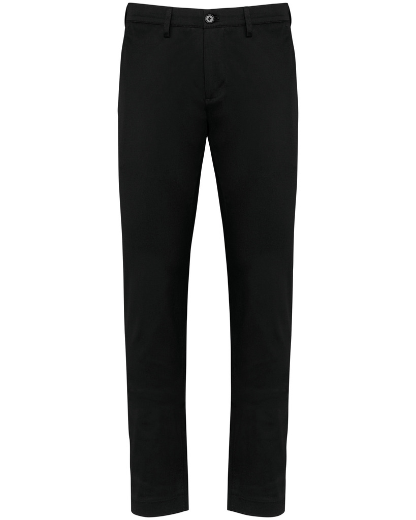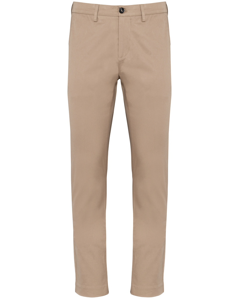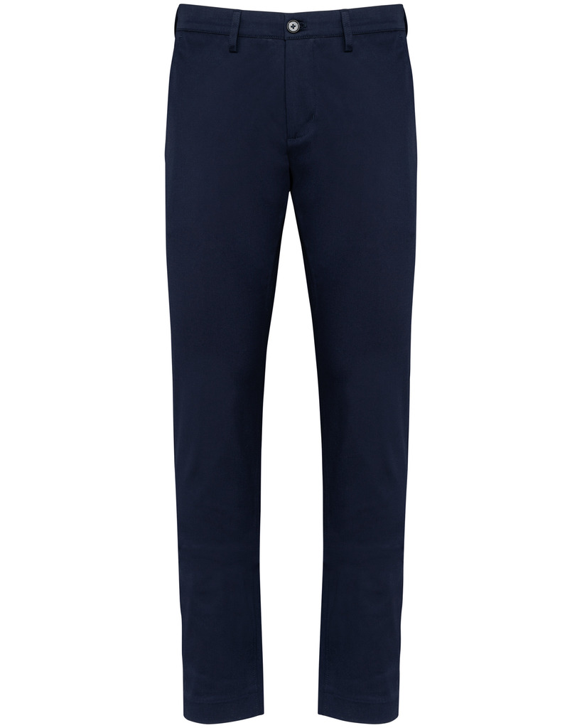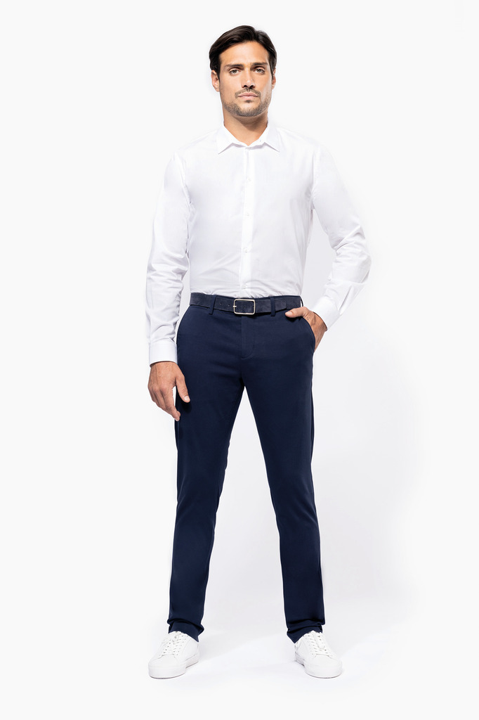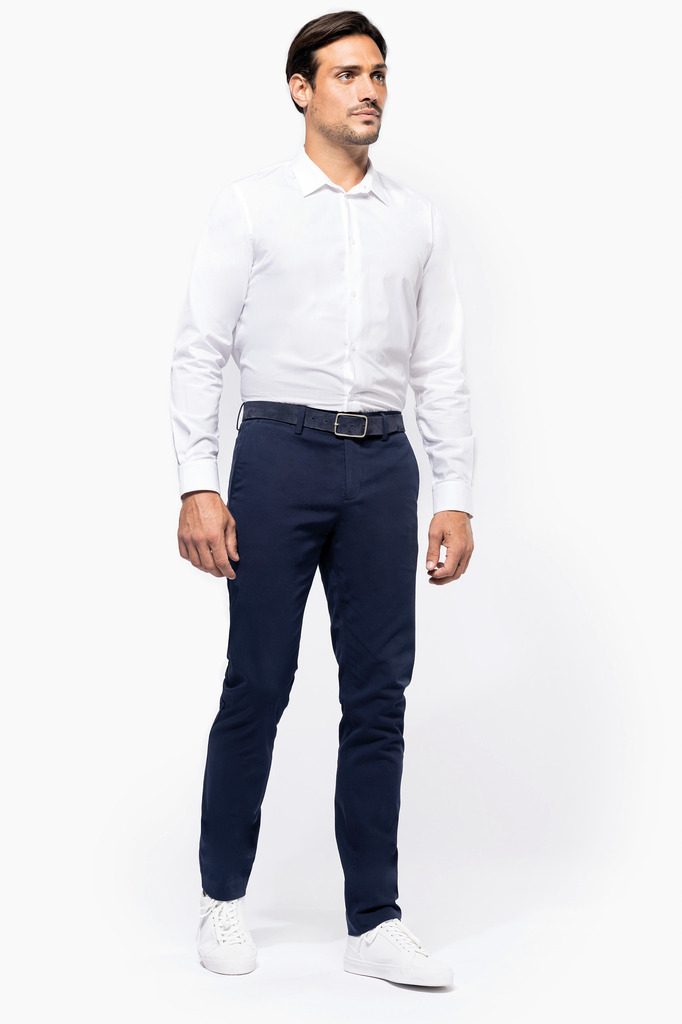 98% algodão/2% elastano. Tecido twill. Dois bolsos frontais italianos com debruado tom sobre tom e pesponto. Um bolso ticket e um bolso para moedas do lado direito. Dois bolsos traseiros planos com pesponto de reforço e botões tom sobre tom efeito mármore. Braguilha com fecho metálico e botão tom sobre tom efeito mármore. Cintura com presilhas. Acabamentos interiores na cintura, braguilha e forro dos bolsos com riscas discretas tom sobre tom em branco-sujo em todas as cores. Sem etiqueta de marca, apenas com indicação de tamanho para facilitar a personalização.