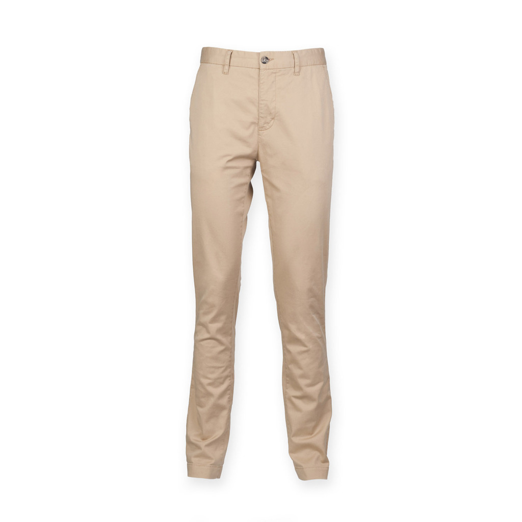 97% algodão/3% elastano. Calças Chino com bolsos à frente e 2 bolsos com detalhes na parte traseira. Presilhas para cinto. Fechos YKK. Costuras planas. Sem etiqueta da marca para facilitar a personalização