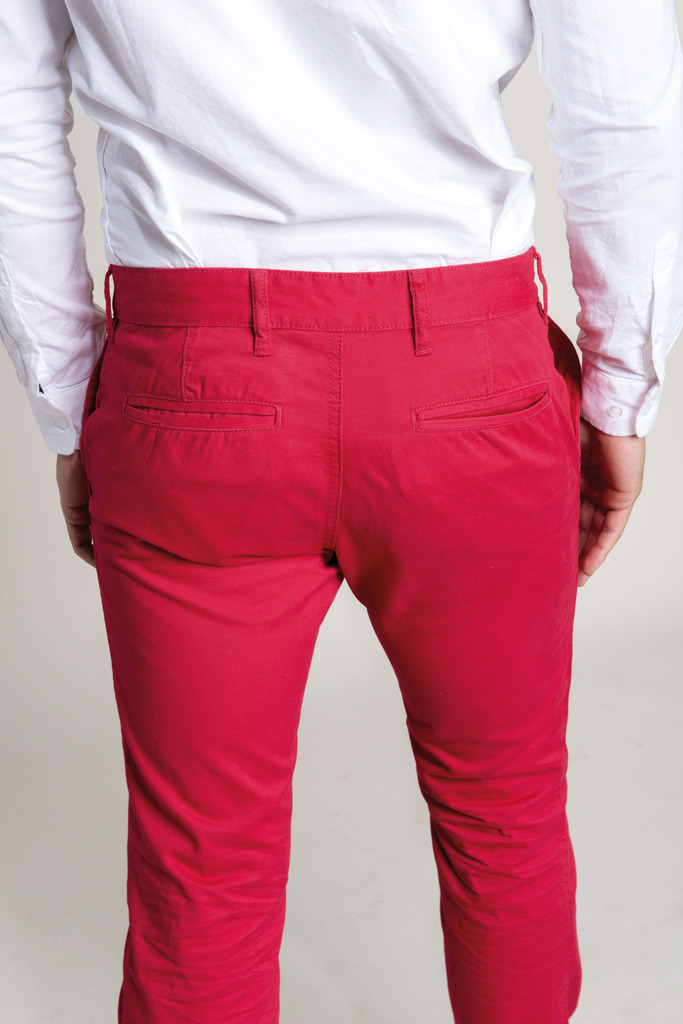 100% algodão aveludado. Banho de enzimas. Corte direito e justo. 2 bolsos laterais.1 bolso pequeno. 2 bolsos traseiros. Fecho YKK® e botão. Presilhas para cinto.