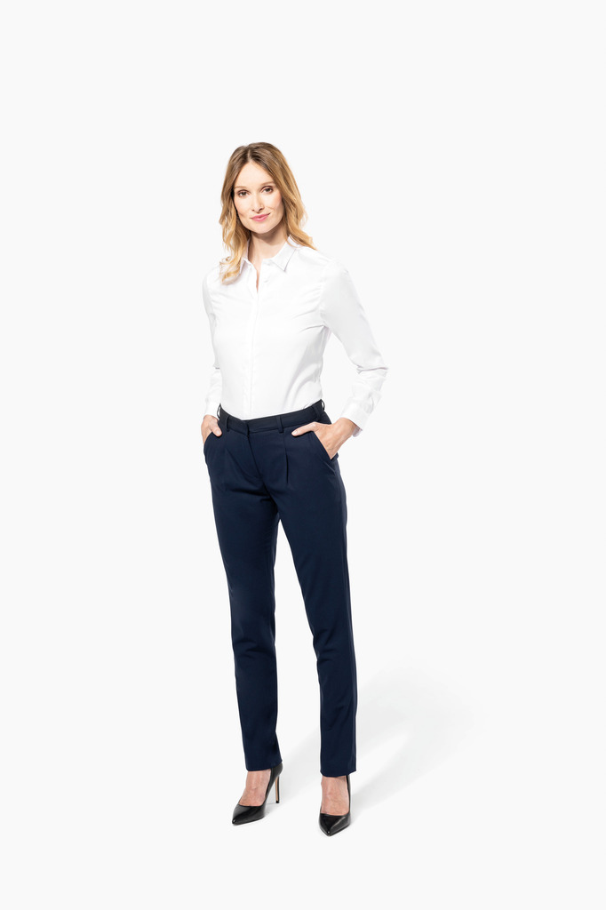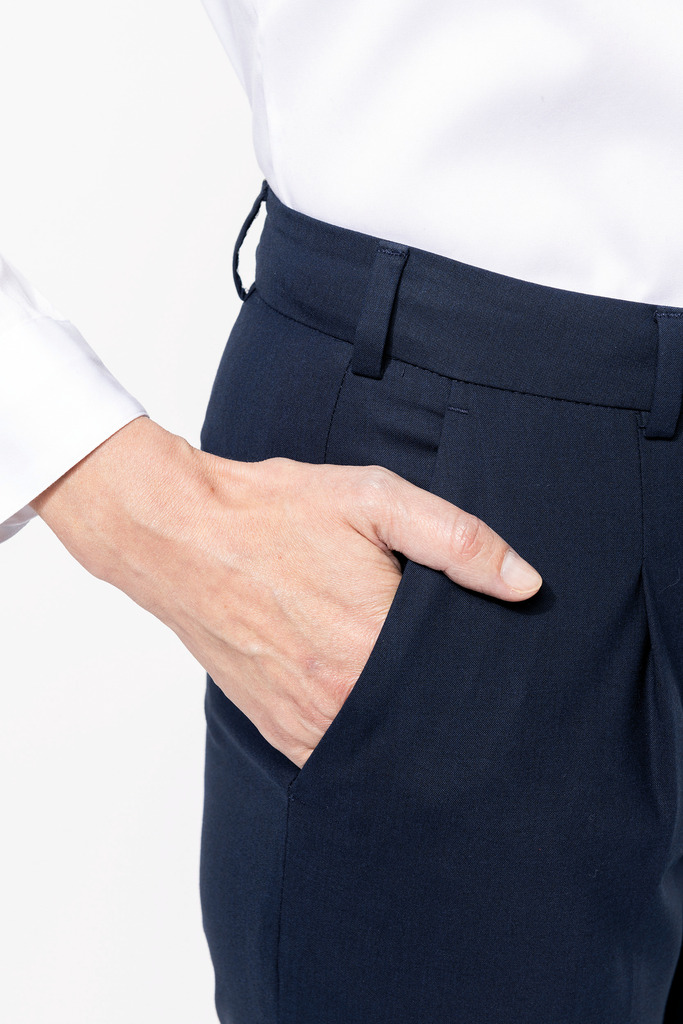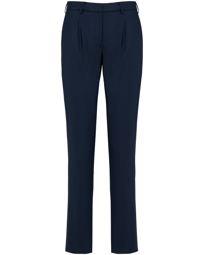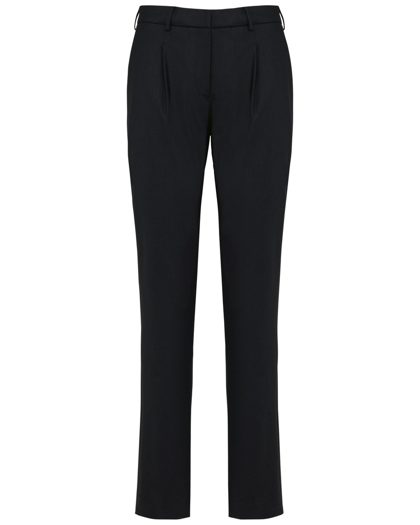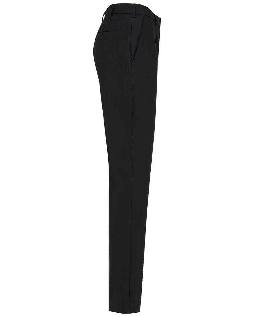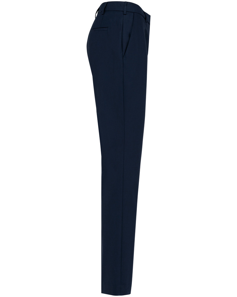 50% poliéster/23% viscose/22% lã/5% elastano. Forro tom sobre tom 100% poliéster. Calças com corte justo. 2 bolsos laterais. 2 bolsos traseiros com pesponto. Forro do bolso em twill poliéster. Fecho zip com presilha metálica no interior com recobrimento tecido com botão para um maior conforto. Presilhas para colocação de cinto. Recobrimento no interior no acabamento do cintura. Prega frontal na perna. Sem etiqueta de marca, contém apenas indicação de tamanho para facilitar a personalização.