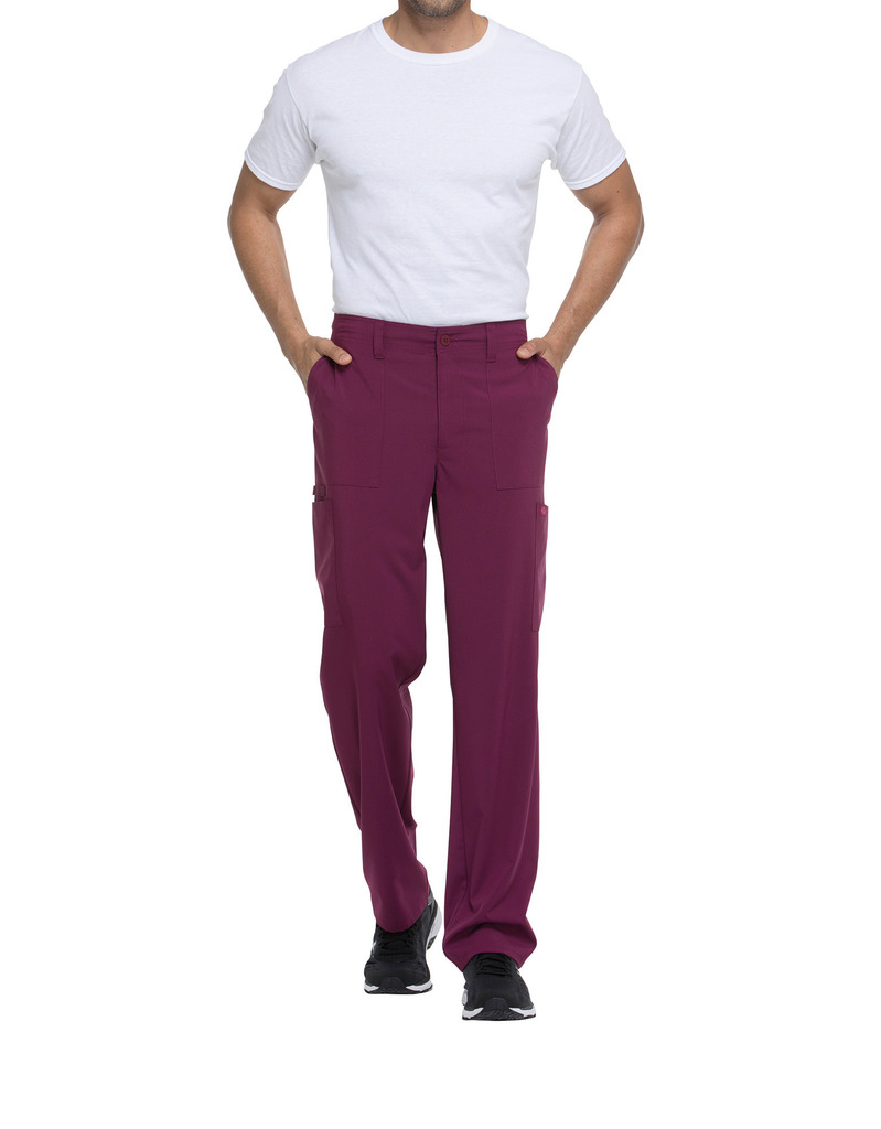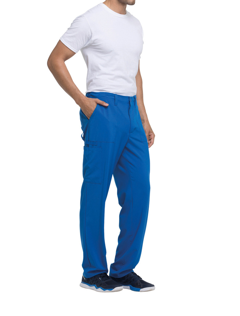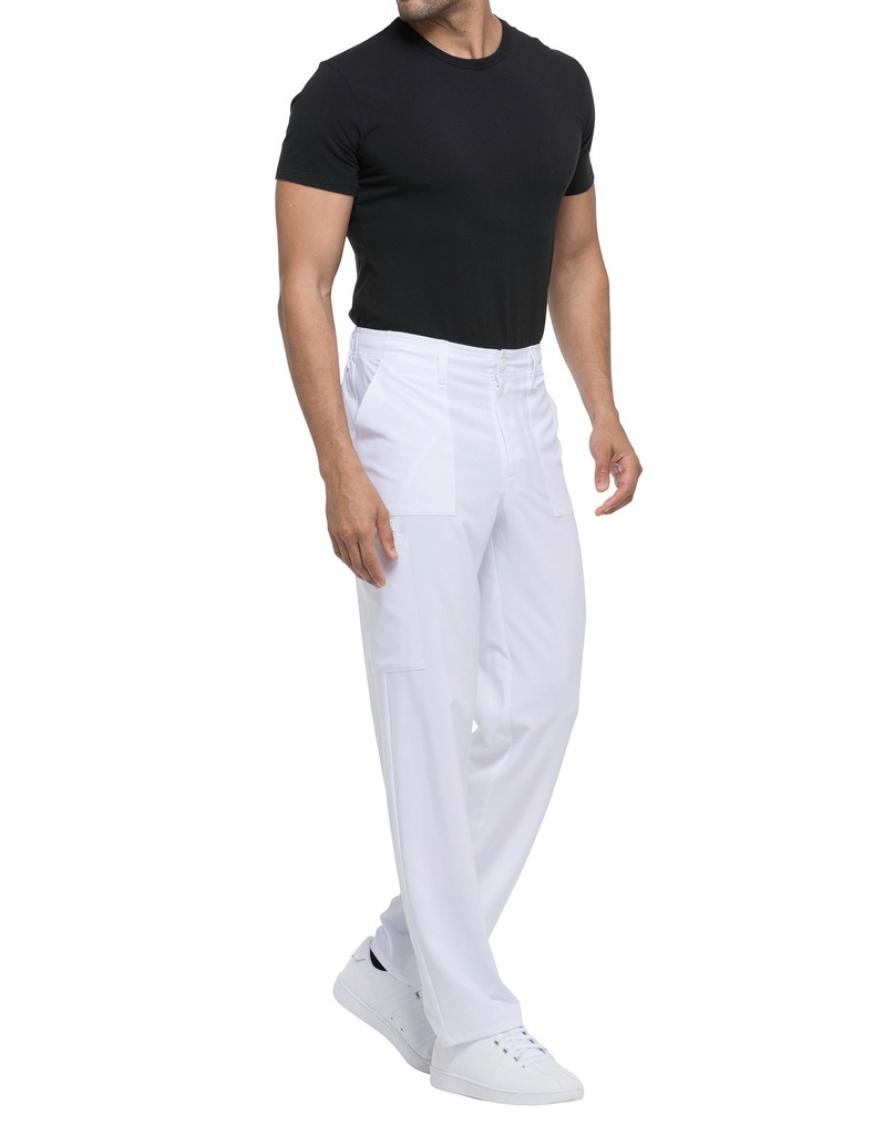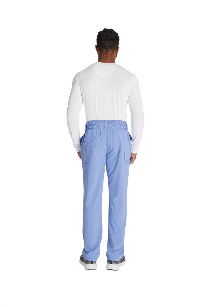 95% poliéster/5% elastano. Corte masculino. Cintura elástica na parte traseira com cordão interior. Braguilha com fecho e botão. Cinco presilhas para cinto. Seis bolsos: dois bolsos frontais planos, dois bolsos cargo, dois bolsos traseiros. Banda em sarja, presilha para instrumentos.