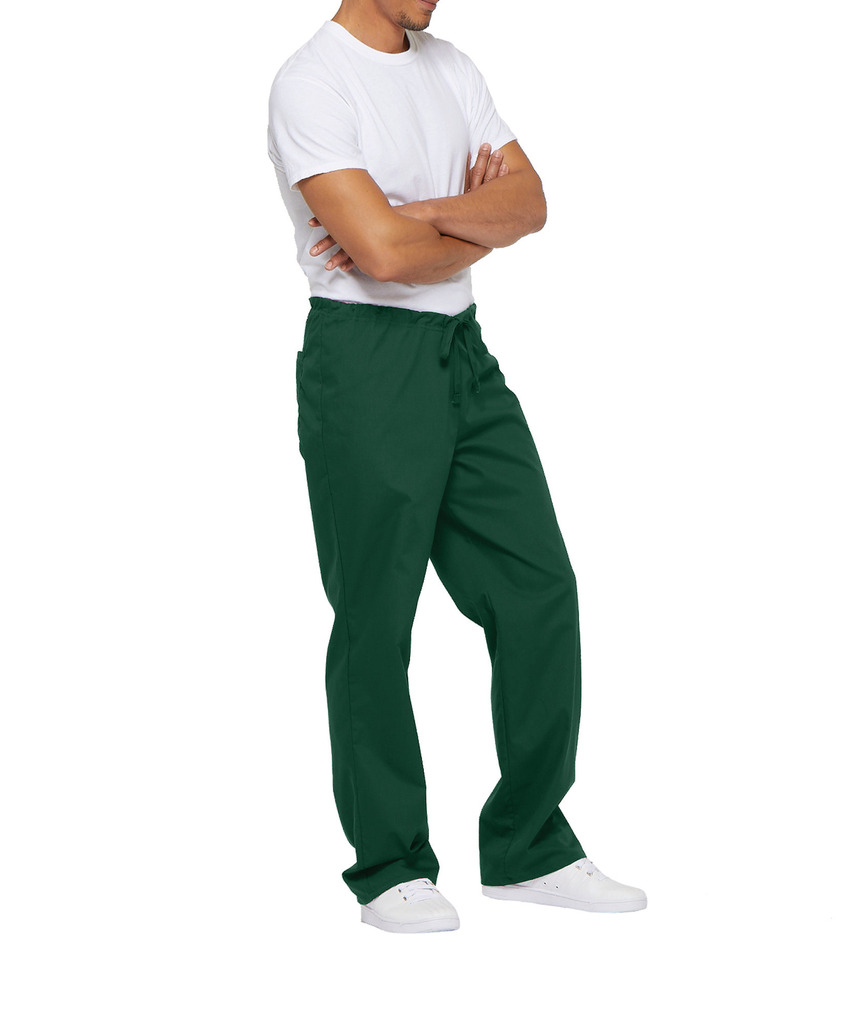 55% algodão/45% poliéster. Corte unissexo com cordão de ajuste. Bolso traseiro com bolso interior em malha azul (malha branca para a cor White). Perna corte direito, abertura de 51,5 cm.