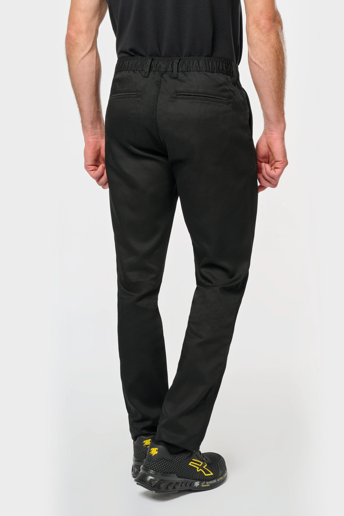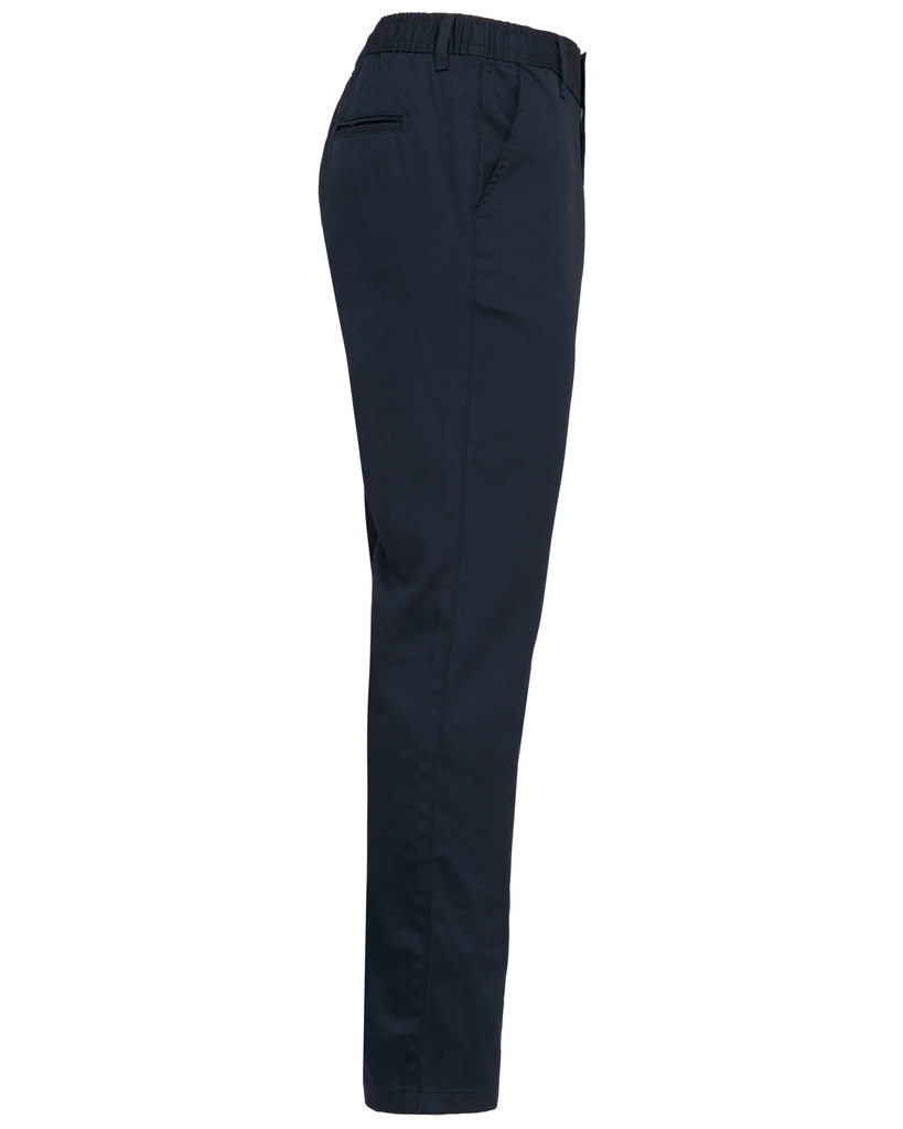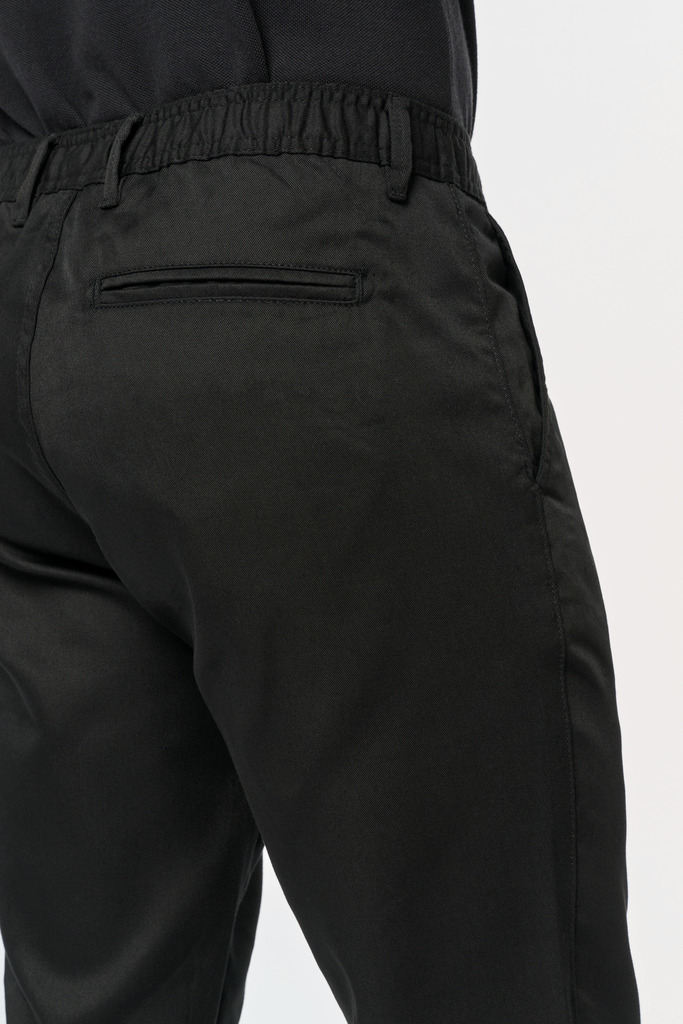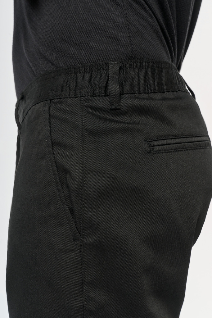 65% poliéster/35% algodão. Lavável a 60°C. 2 bolsos italianos laterais, 1 dos quais para moedas. 2 bolsos traseiros com detalhe e costuras reforçadas. Braguilha com fecho e botão. Cintura elástica com presilhas para maior conforto. Presilha interior para pendurar. Ideal para um uso diário.