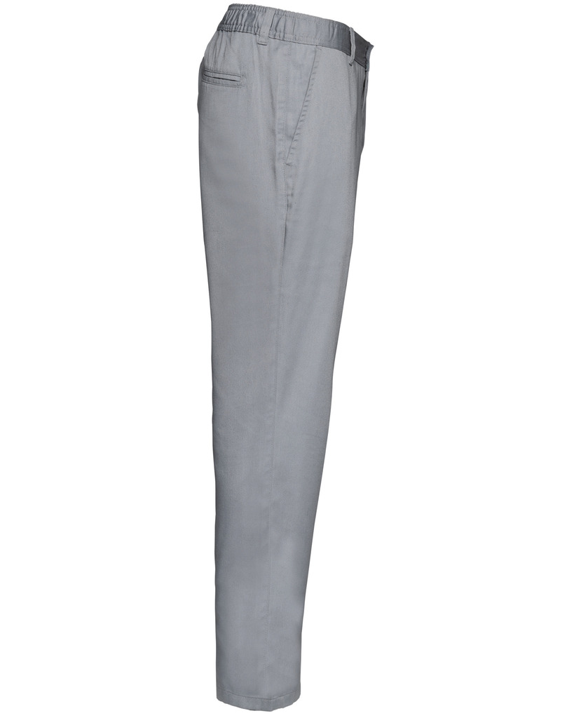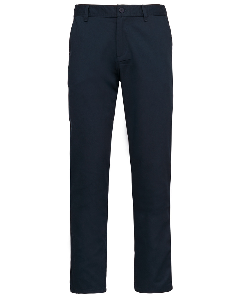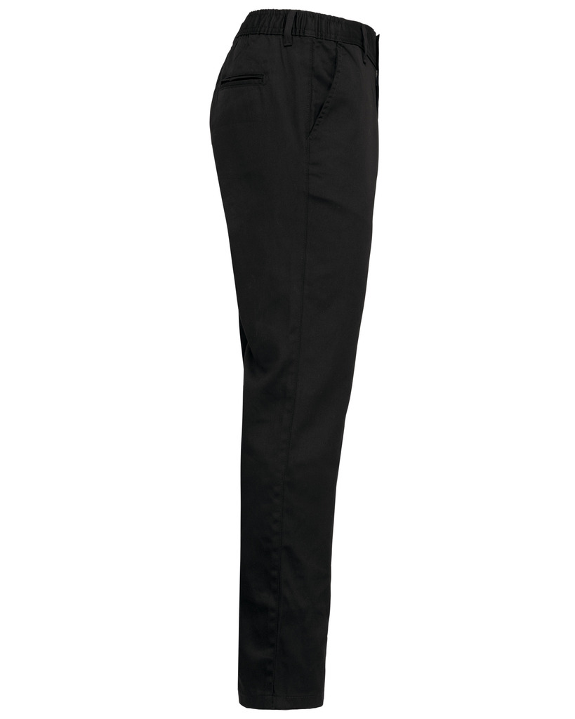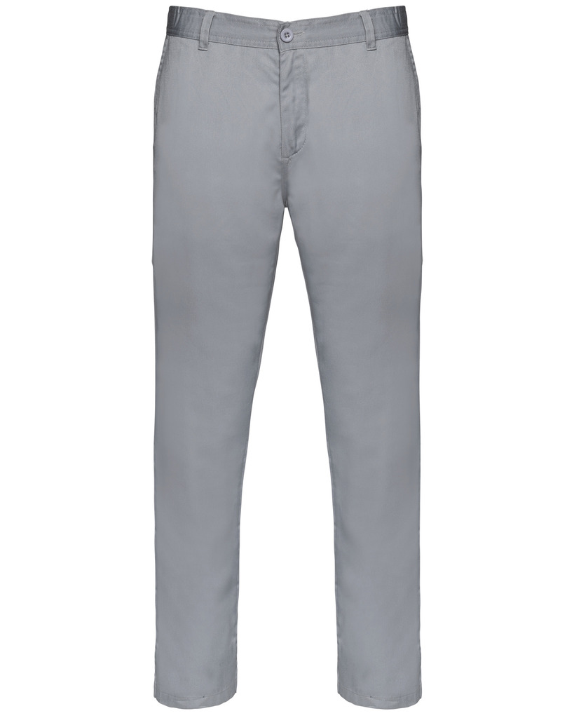 65% poliéster/35% algodão. Lavável a 60°C. 2 bolsos italianos laterais, 1 dos quais para moedas. 2 bolsos traseiros com detalhe e costuras reforçadas. Braguilha com fecho e botão. Cintura elástica com presilhas para maior conforto. Presilha interior para pendurar. Ideal para um uso diário.